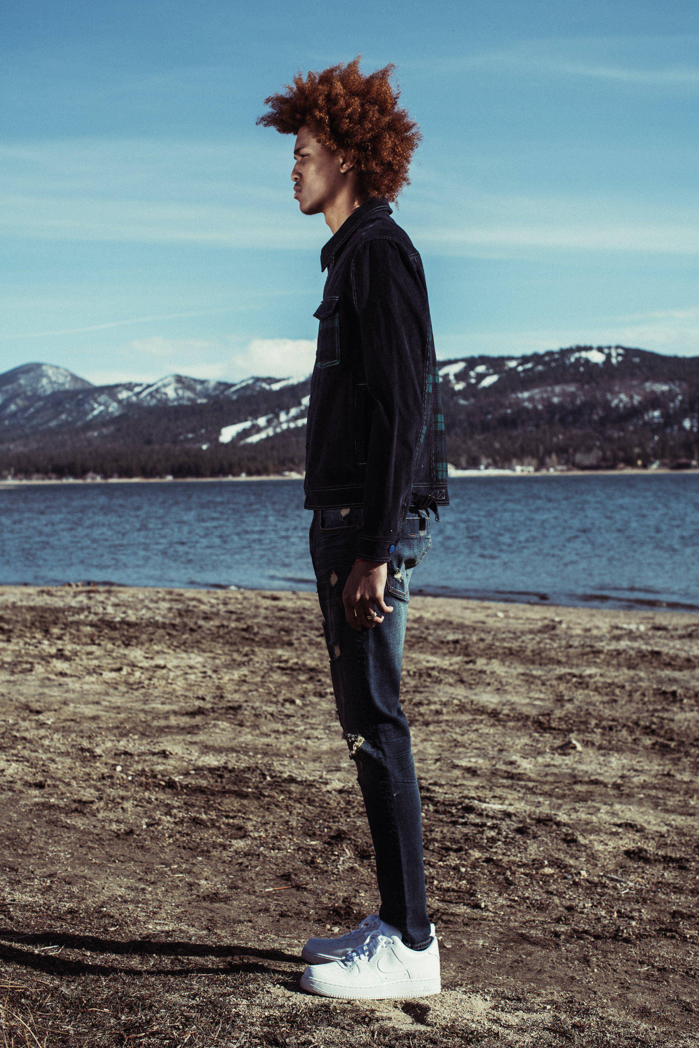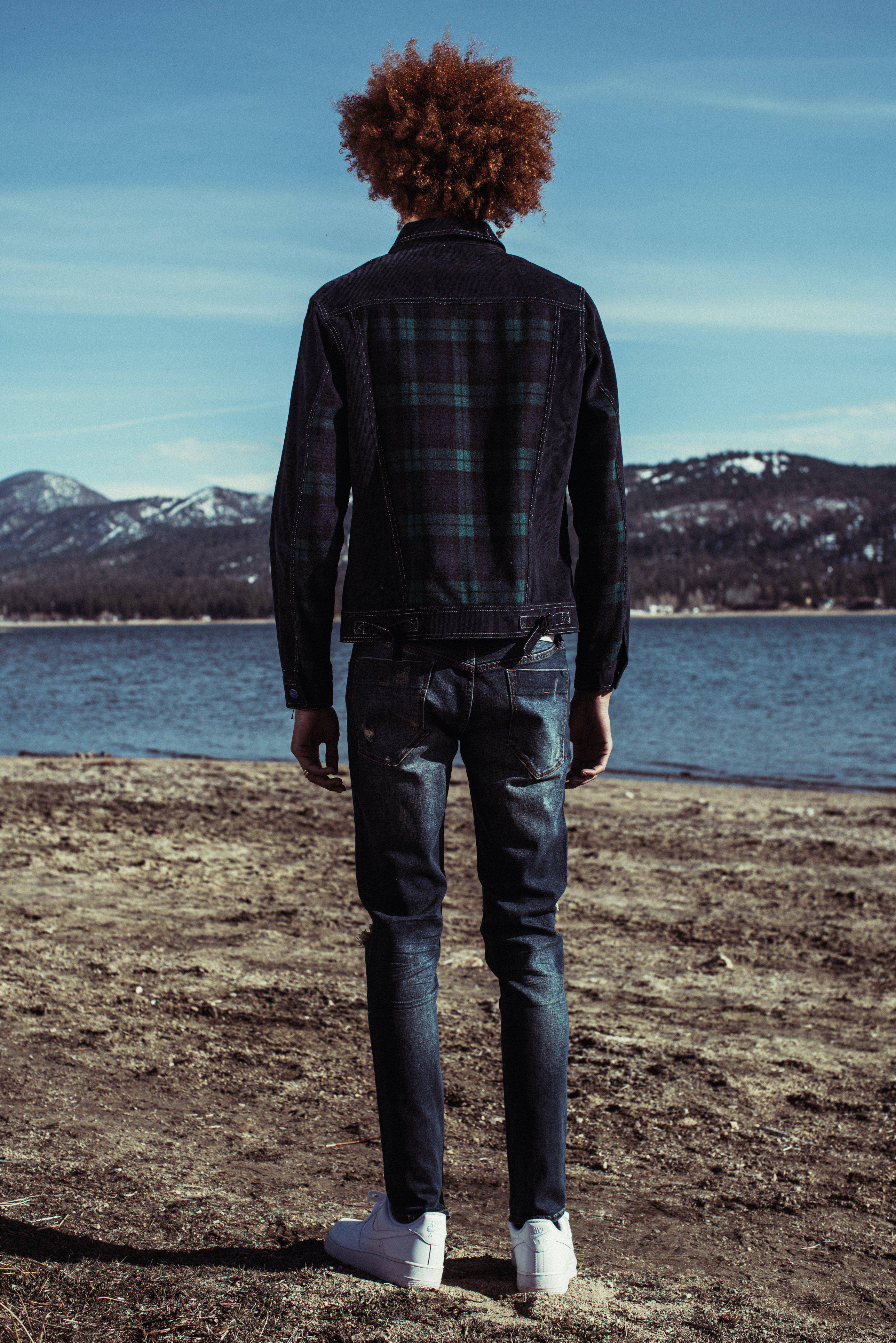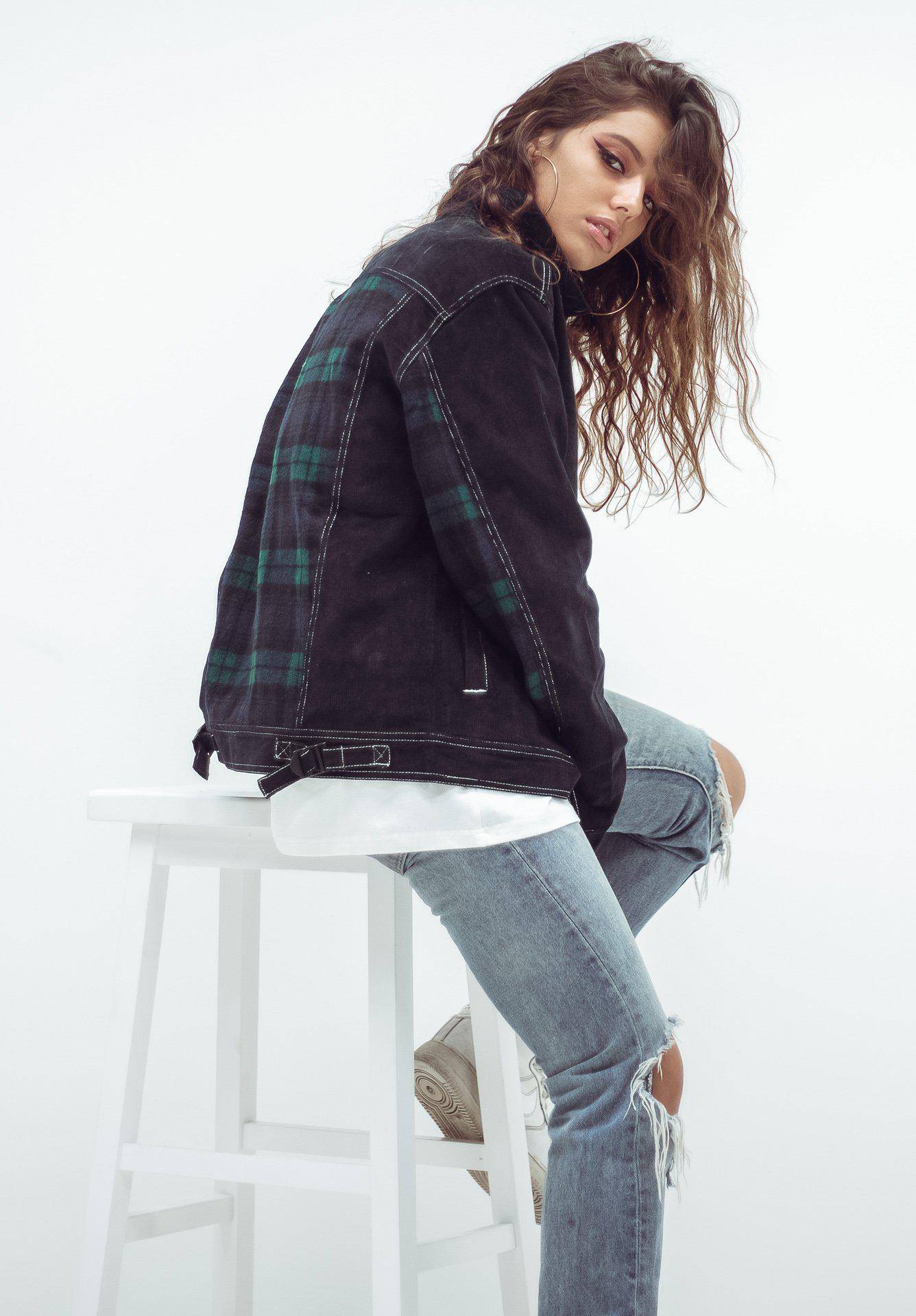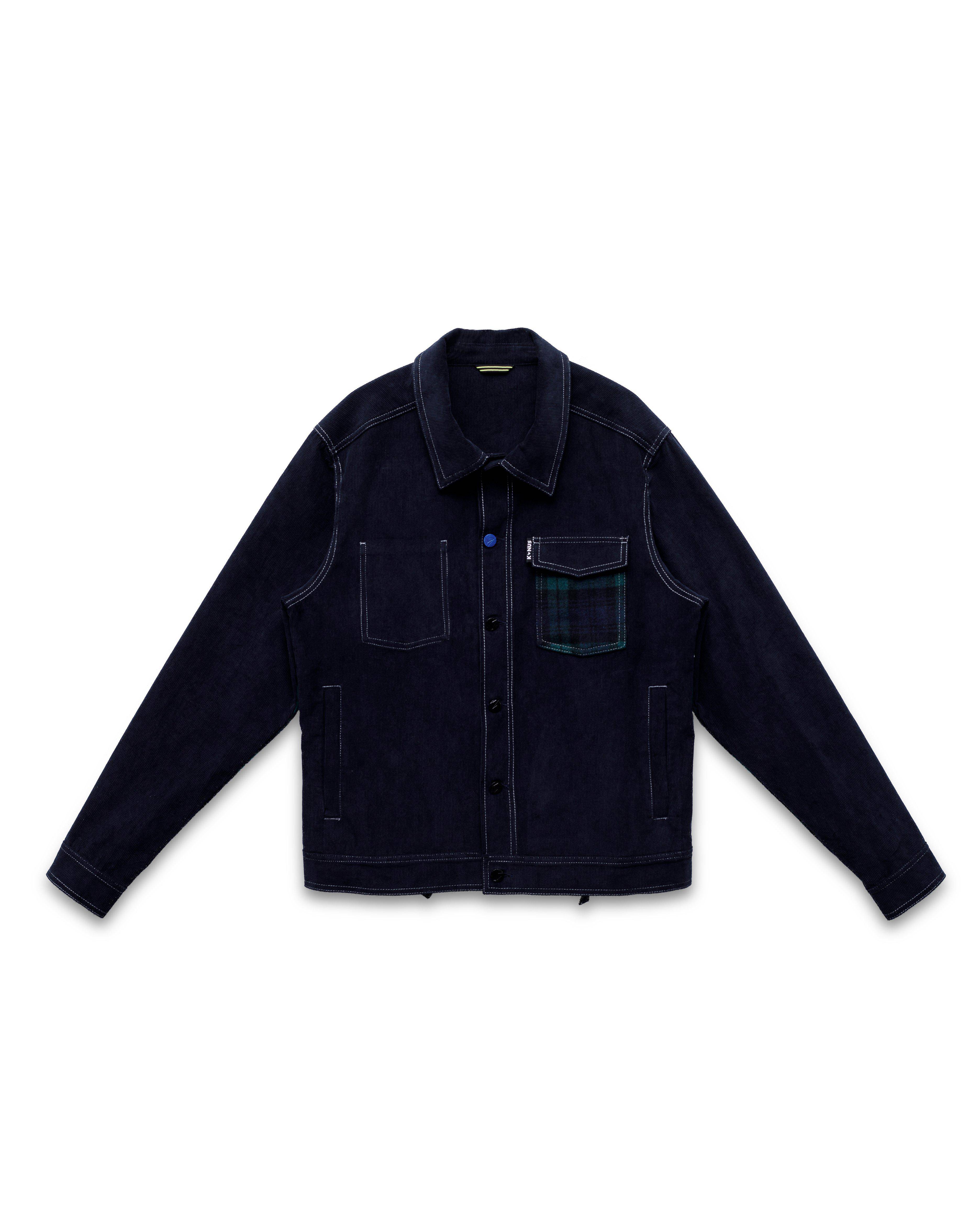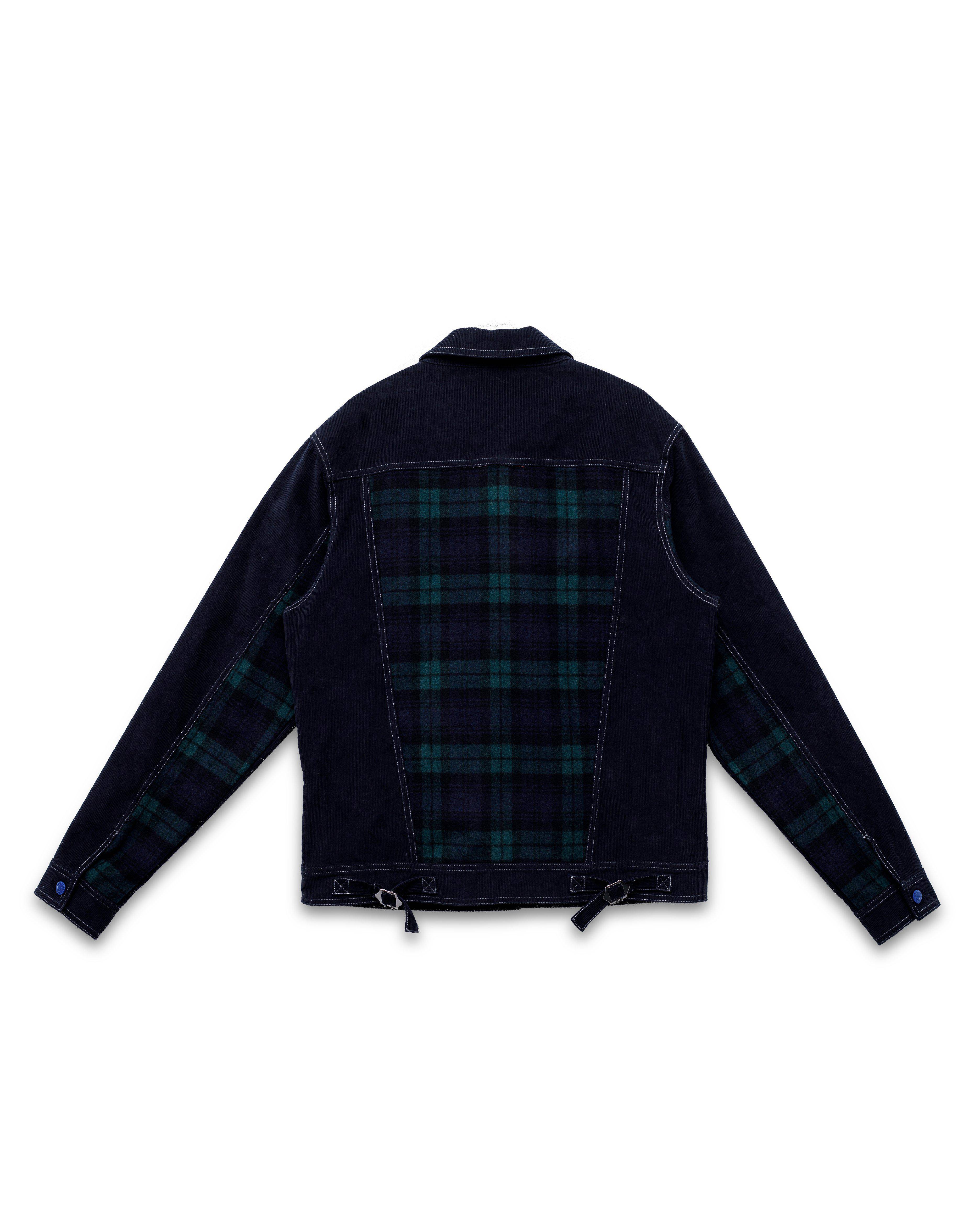 Trucker jacket in corduroy with contrast wool blend plaid paneling detail features contrast color sewing thread, chest pockets and welt hand pockets.