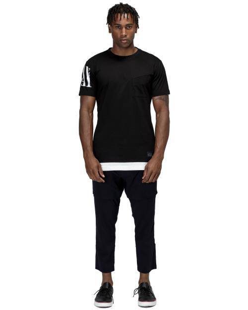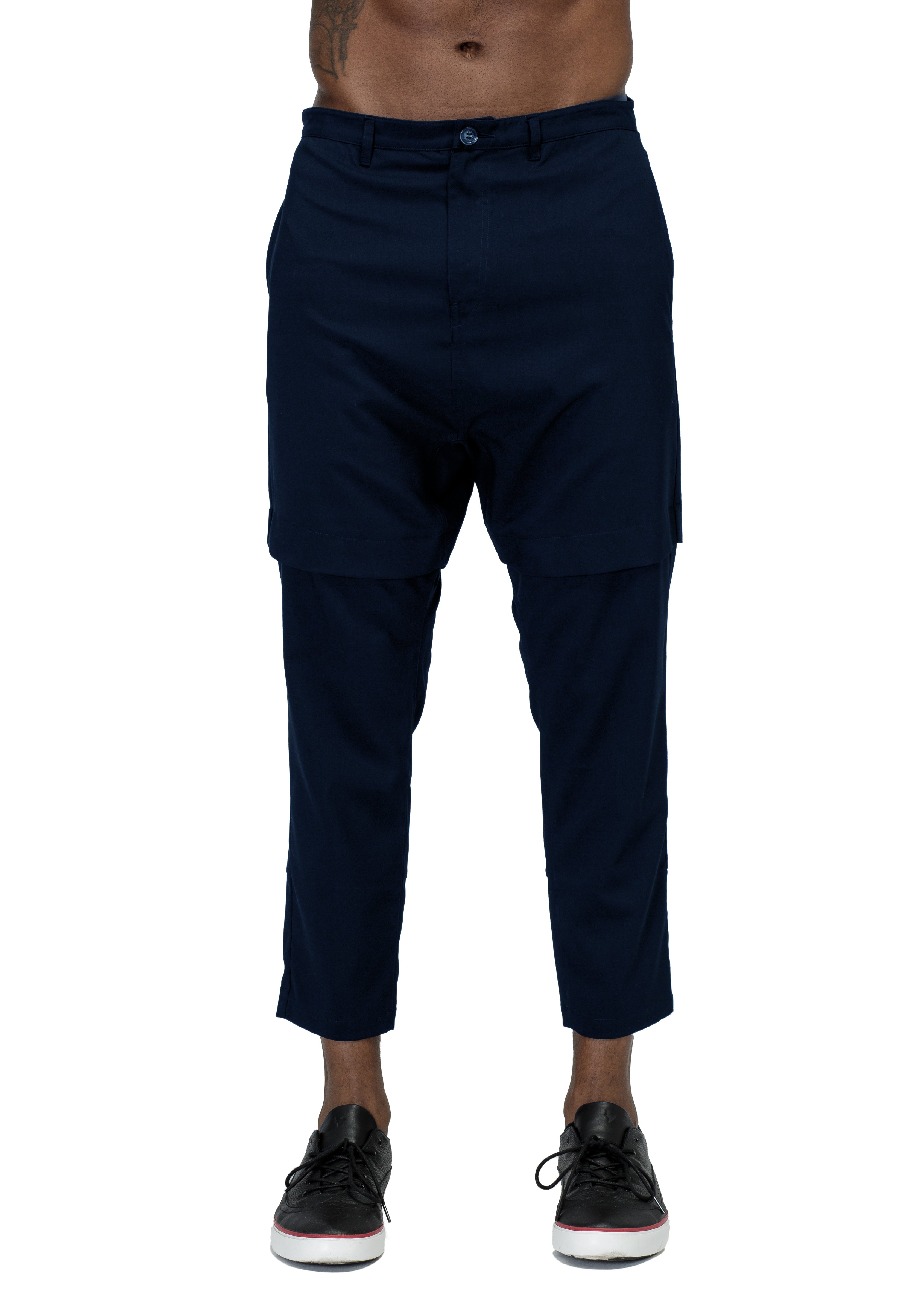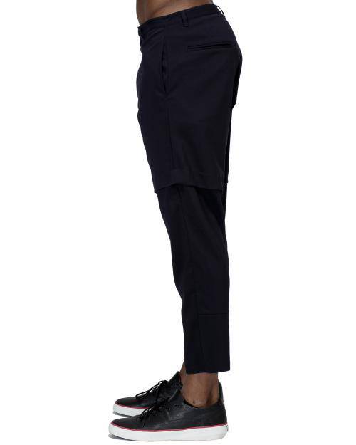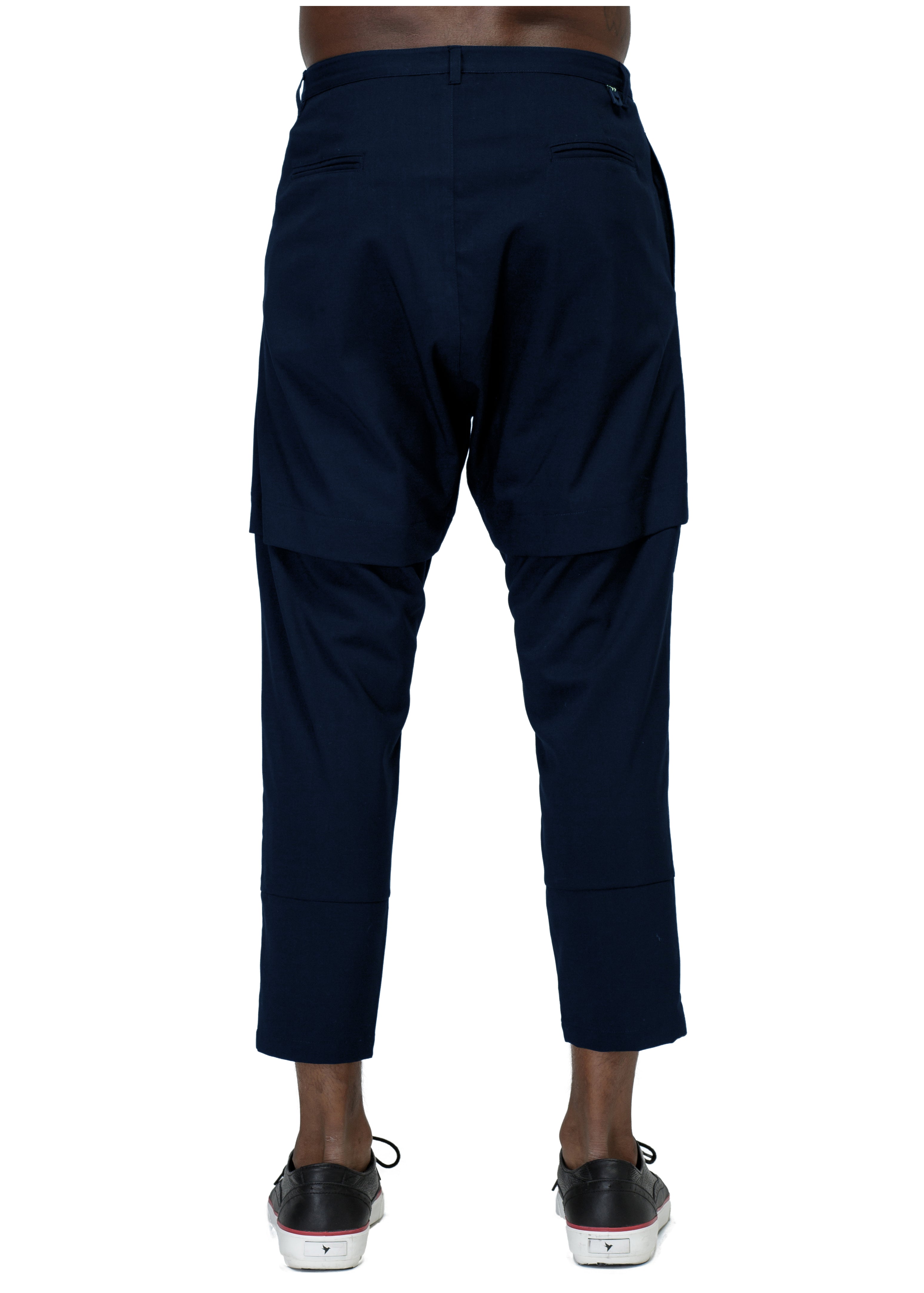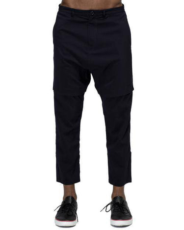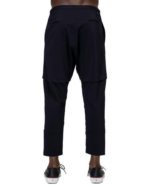 Featuring a slight drop-crotch design, these pants are crafted with faux double layers and a metal trim at the waistband.