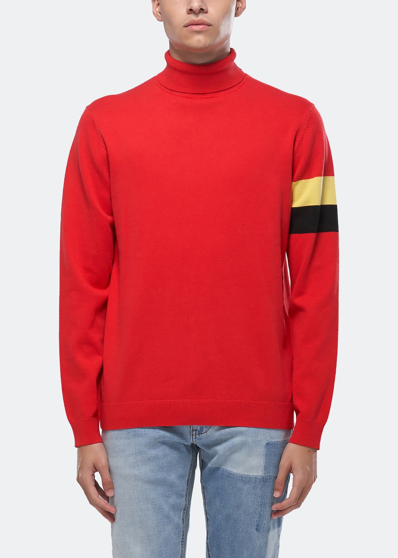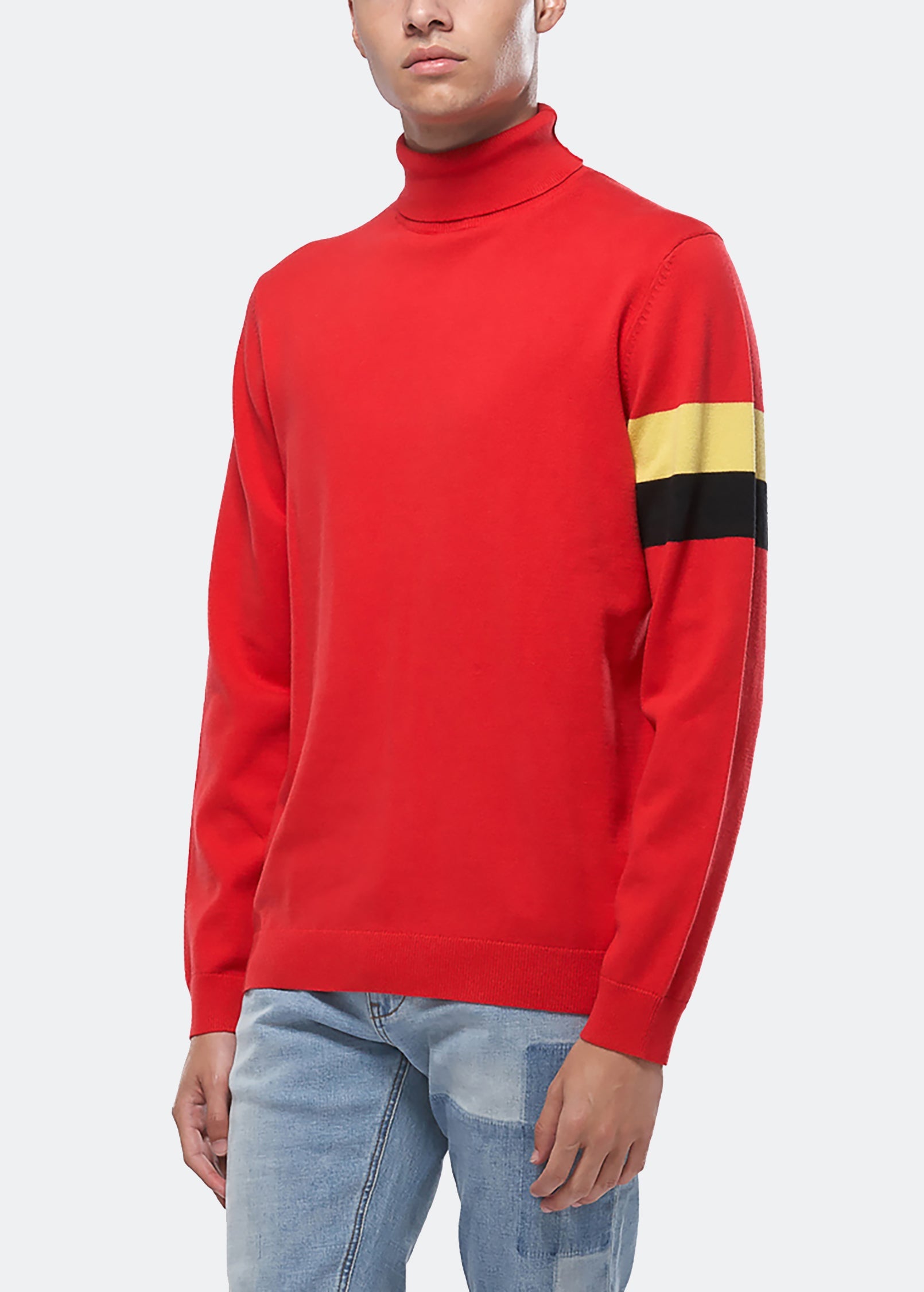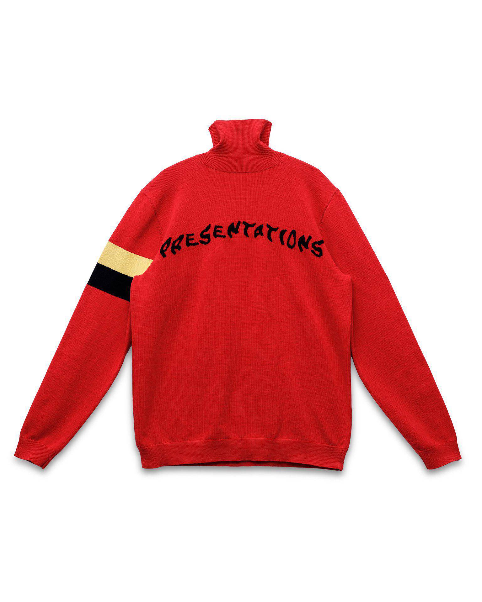 Fully fashioned long sleeve turtle neck sweater with contrast color armband and "PRESENTATIONS" knitted in on the back.