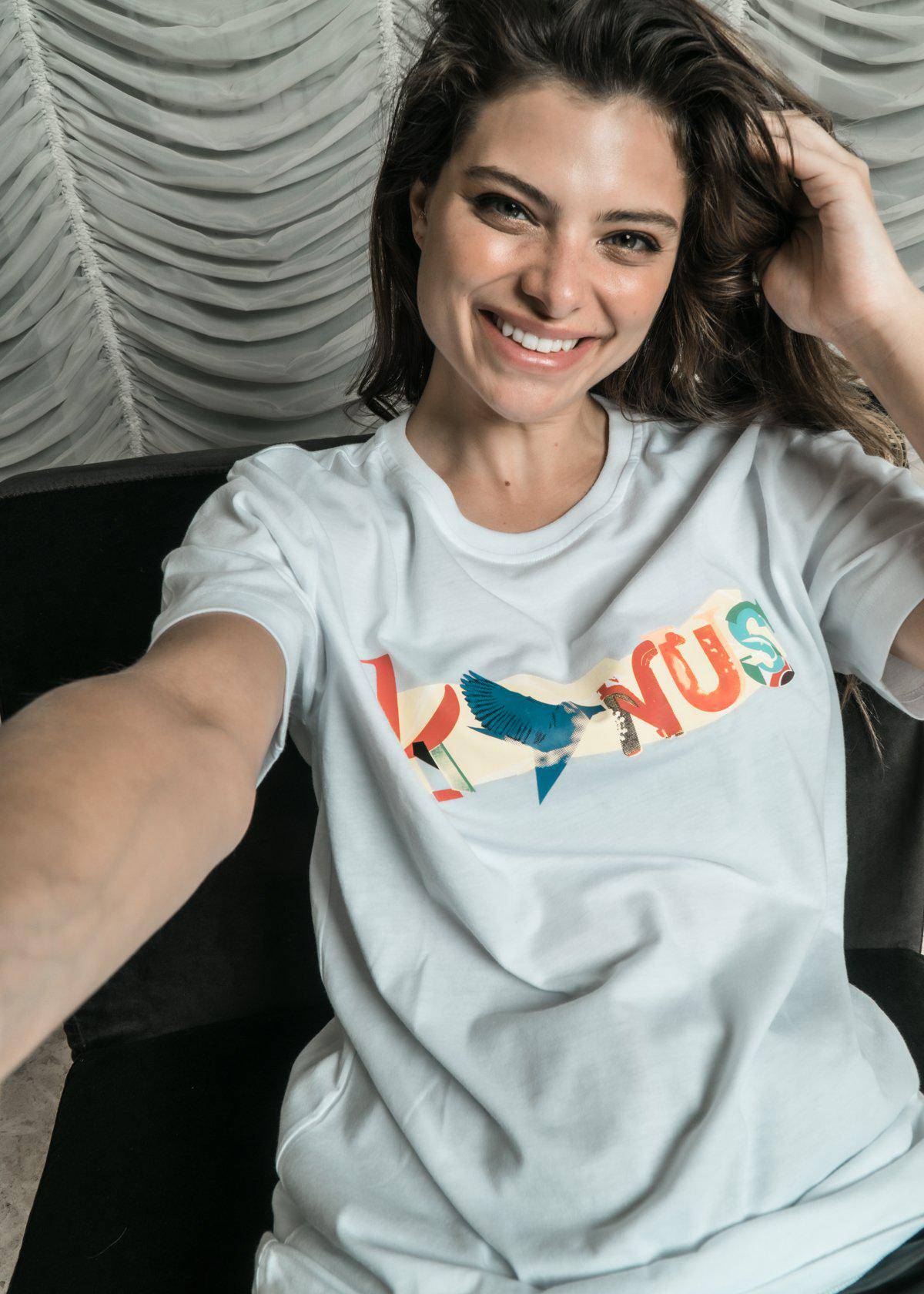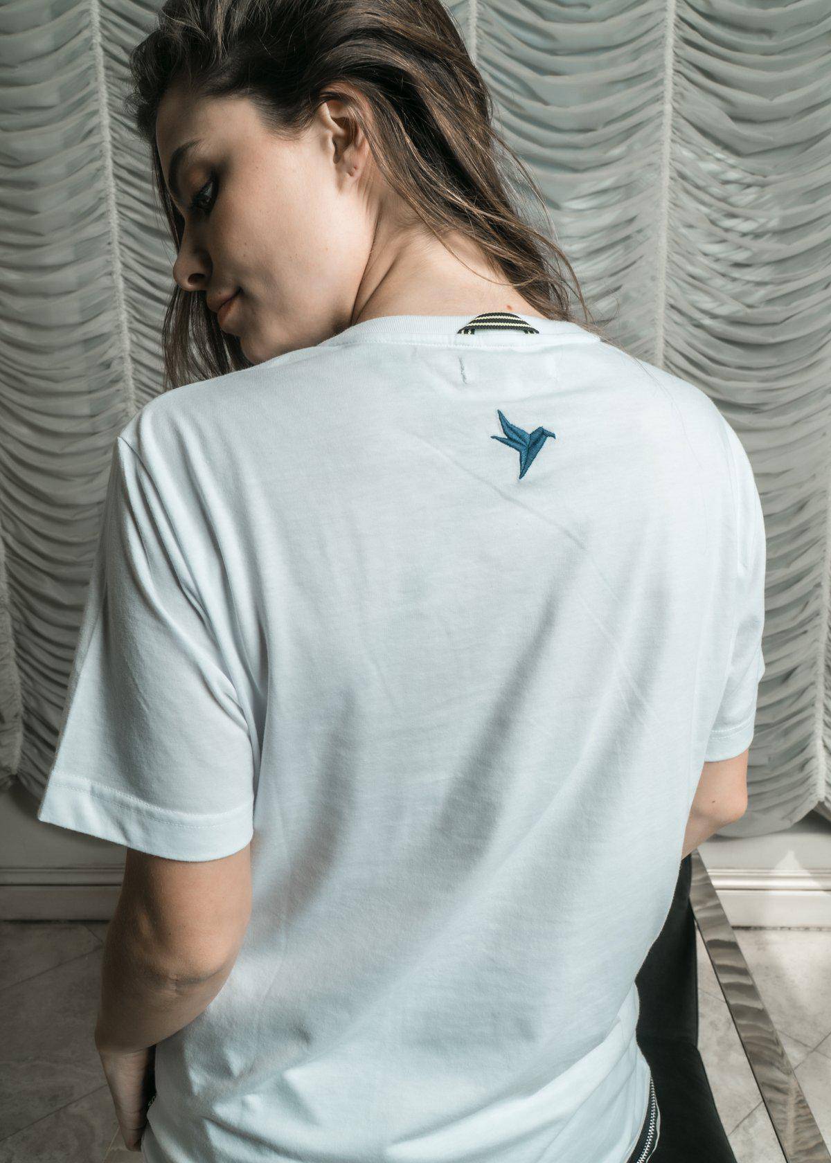 Indulge in the refined design of this white, short sleeve crew neck tee adorned with the elegant "KONUS" brand name on the chest and the brand's bird logo embroidered on the back. Elevate your style with this premium piece.