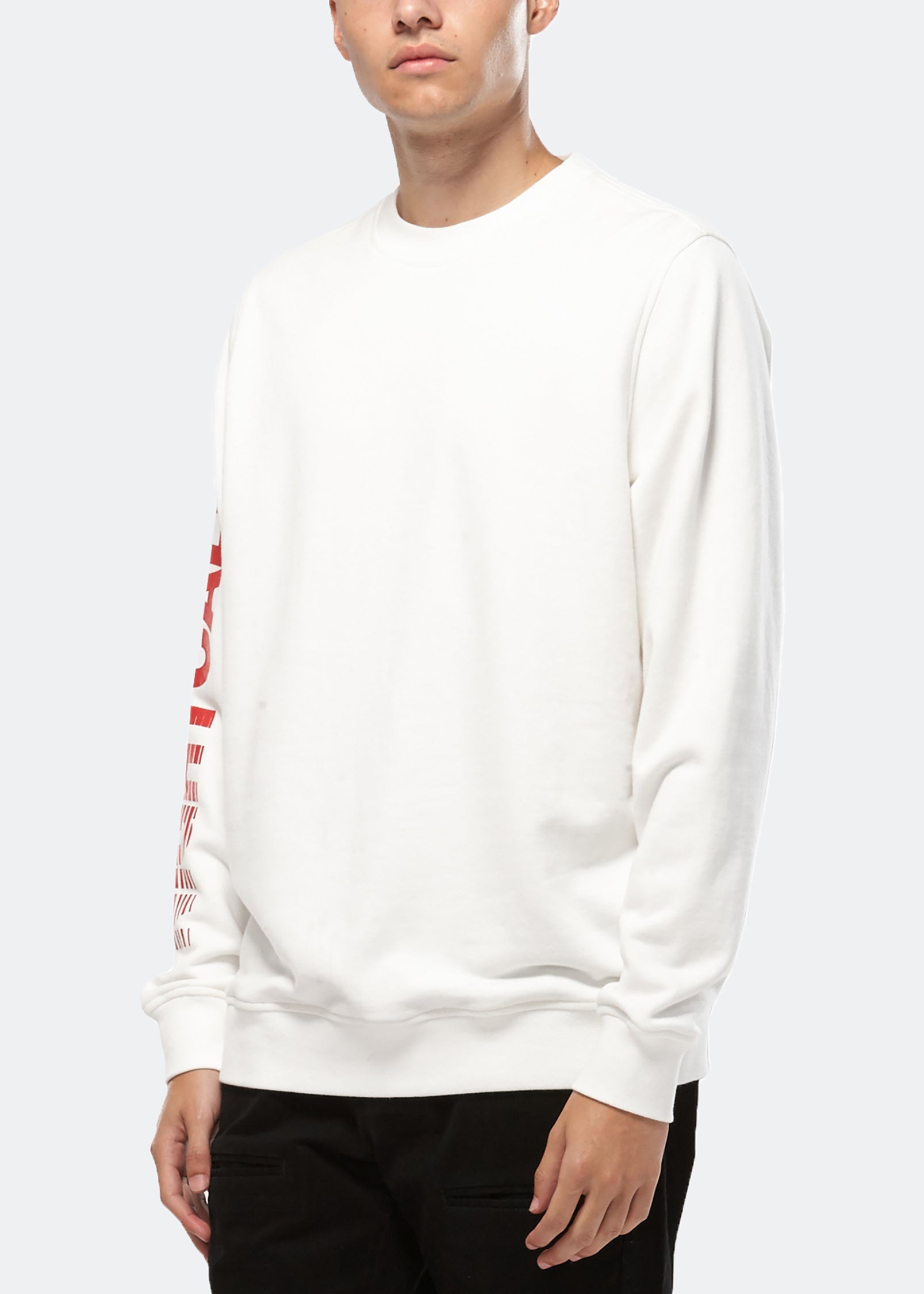 French terry sweatshirt with screen print on back and wearer's right sleeve