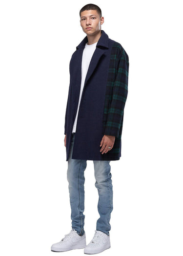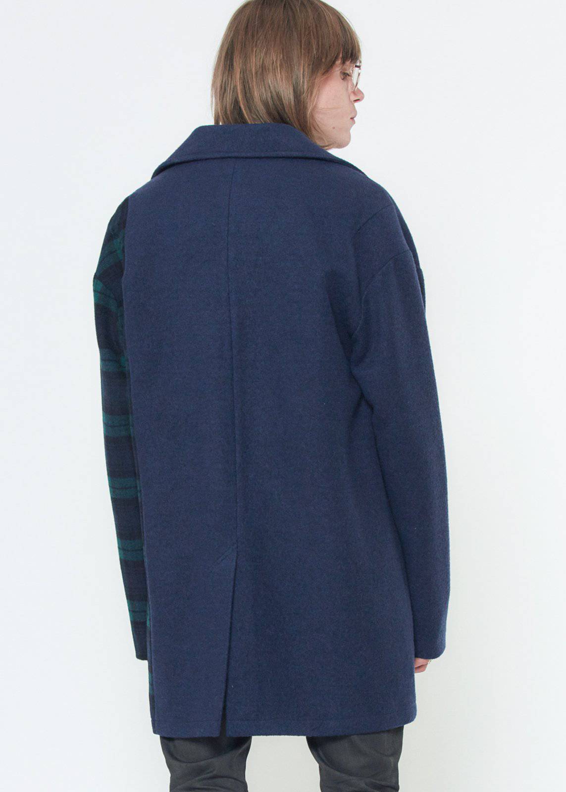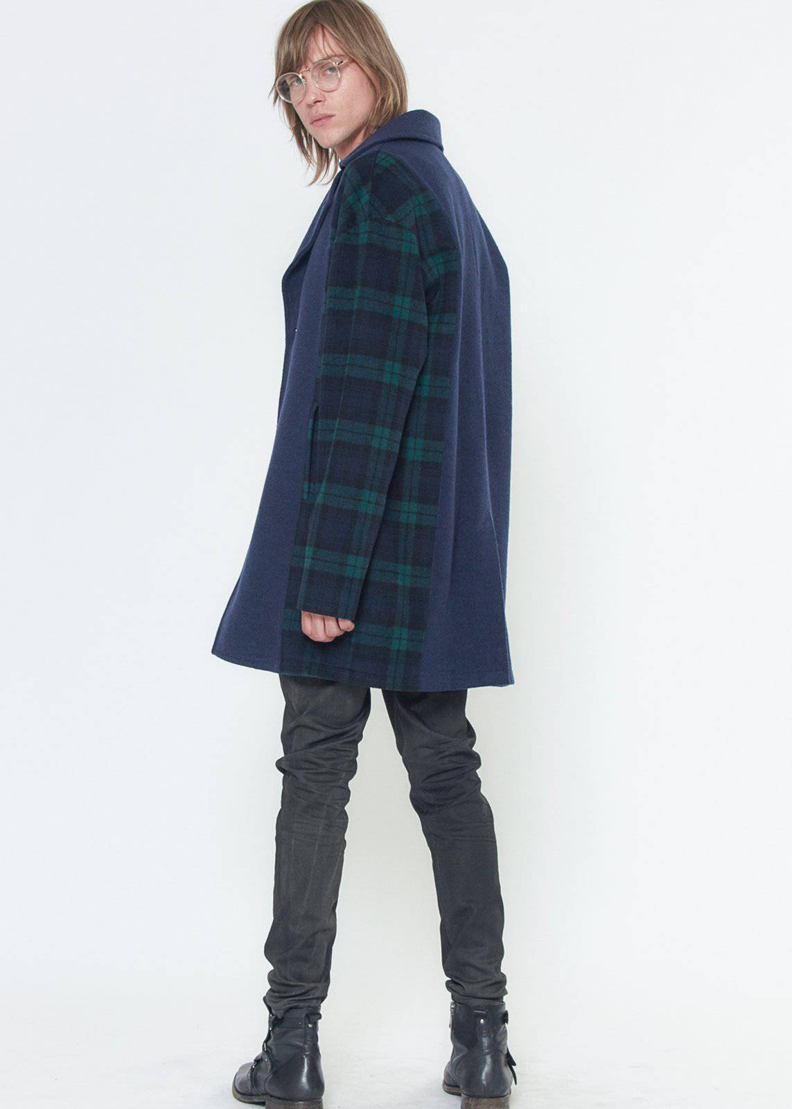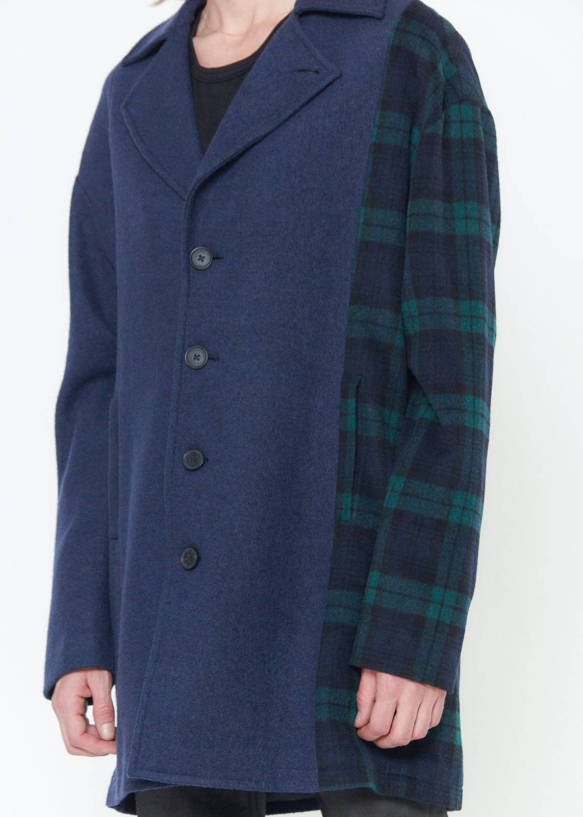 Slightly oversized wool blend mid length single breasted coat with color blocking detail in plaid features welt hand pockets
