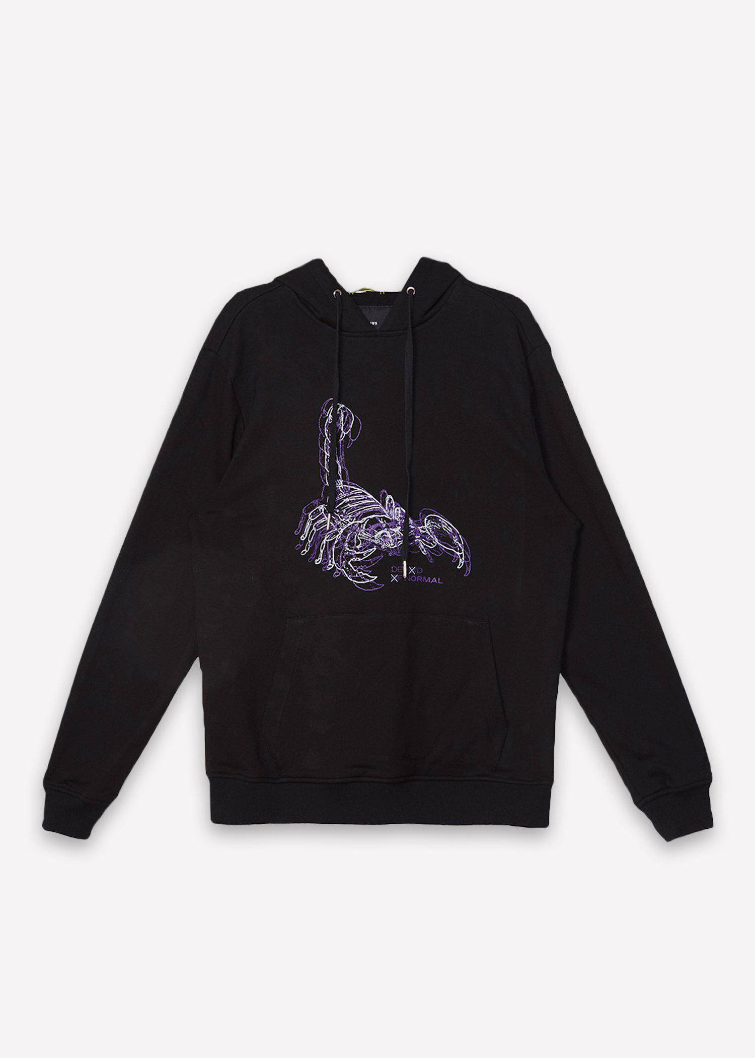 French terry pullover hoodie with kangaroo pocket with line art of scorpion screen printed on the chest