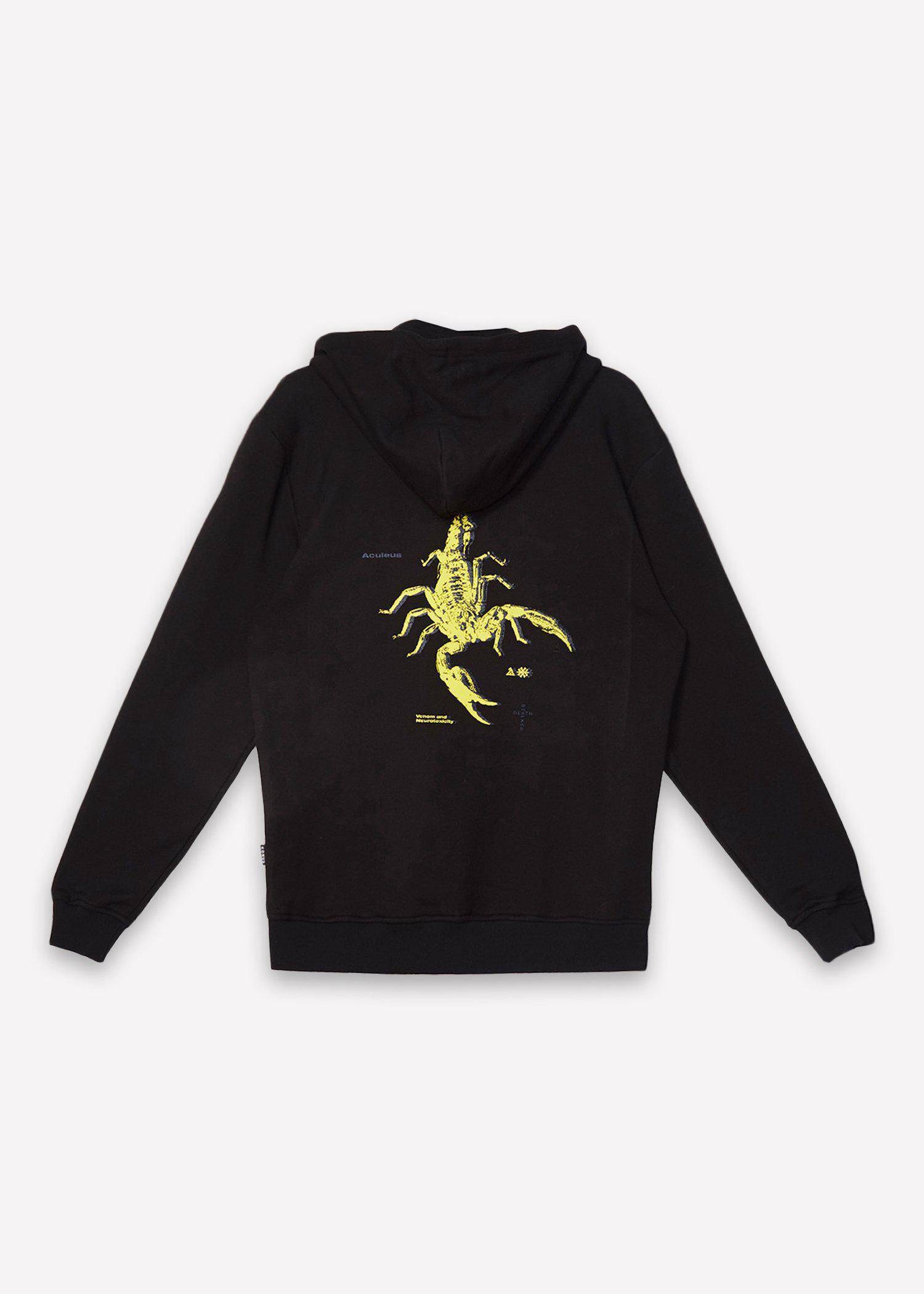 French terry pullover hoodie with kangaroo pocket features a scorpion screen print on the back.