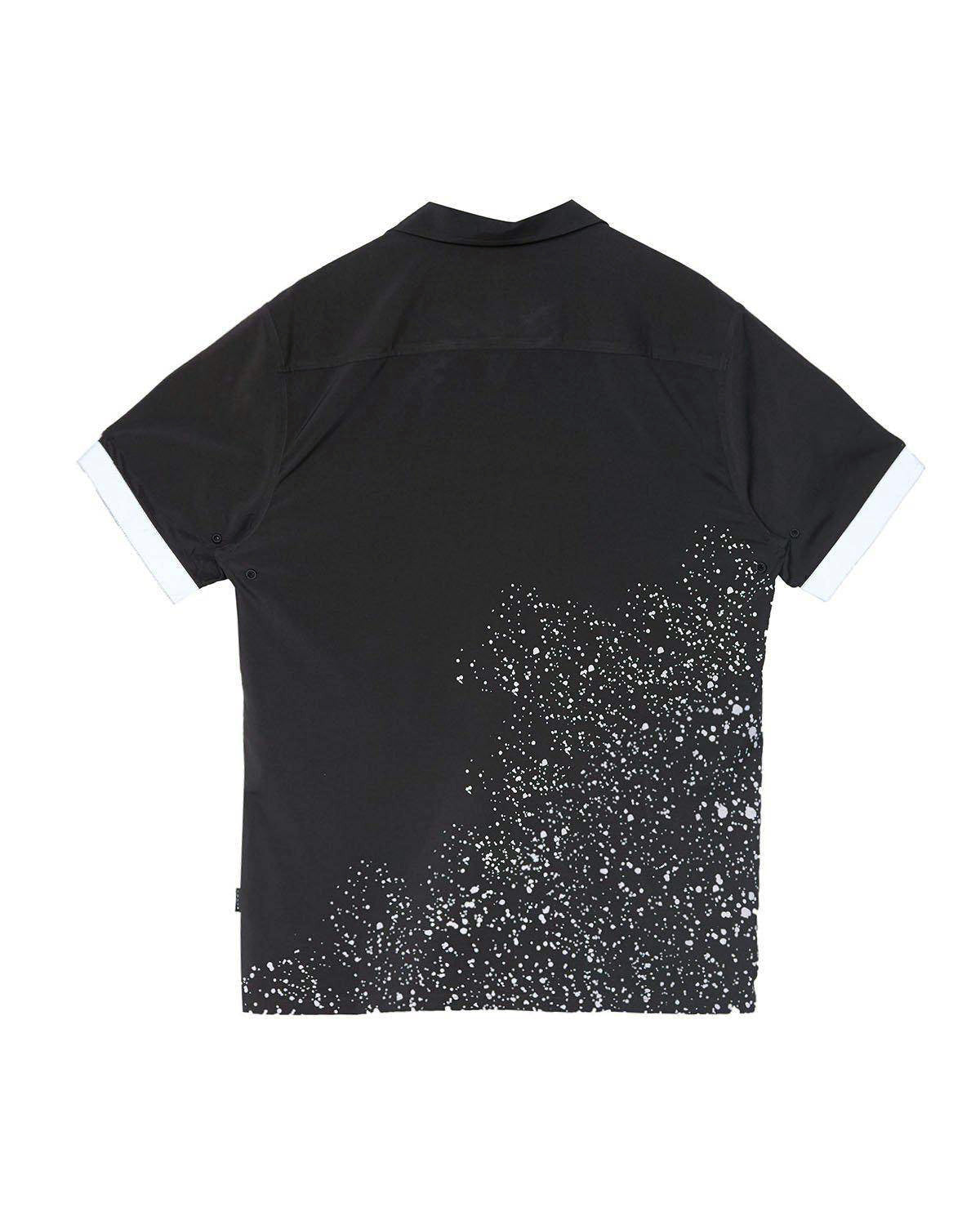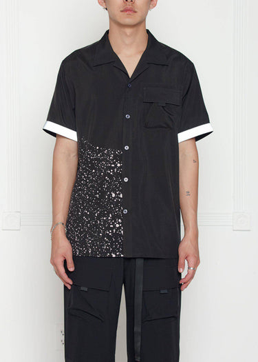 Short sleeve revere collar shirt with splatter print on front and back features reflective tape sewn on cuffs