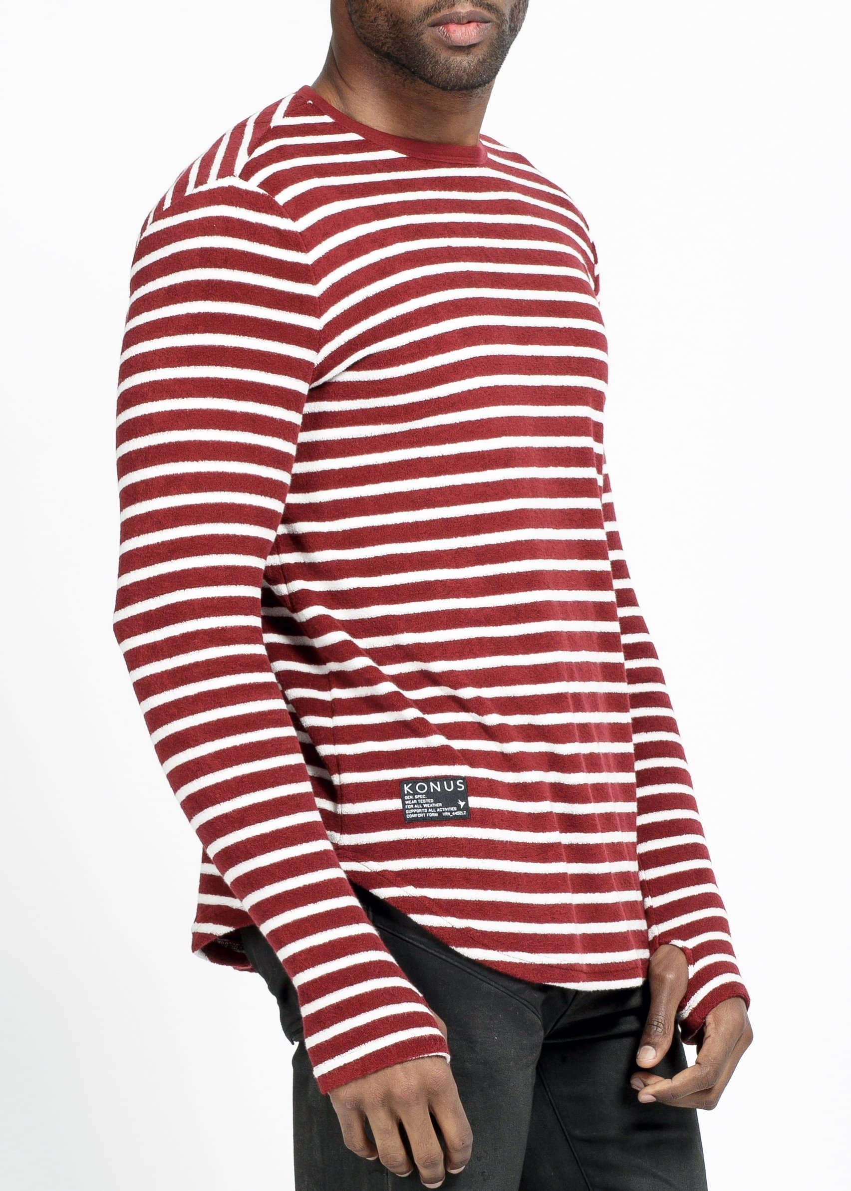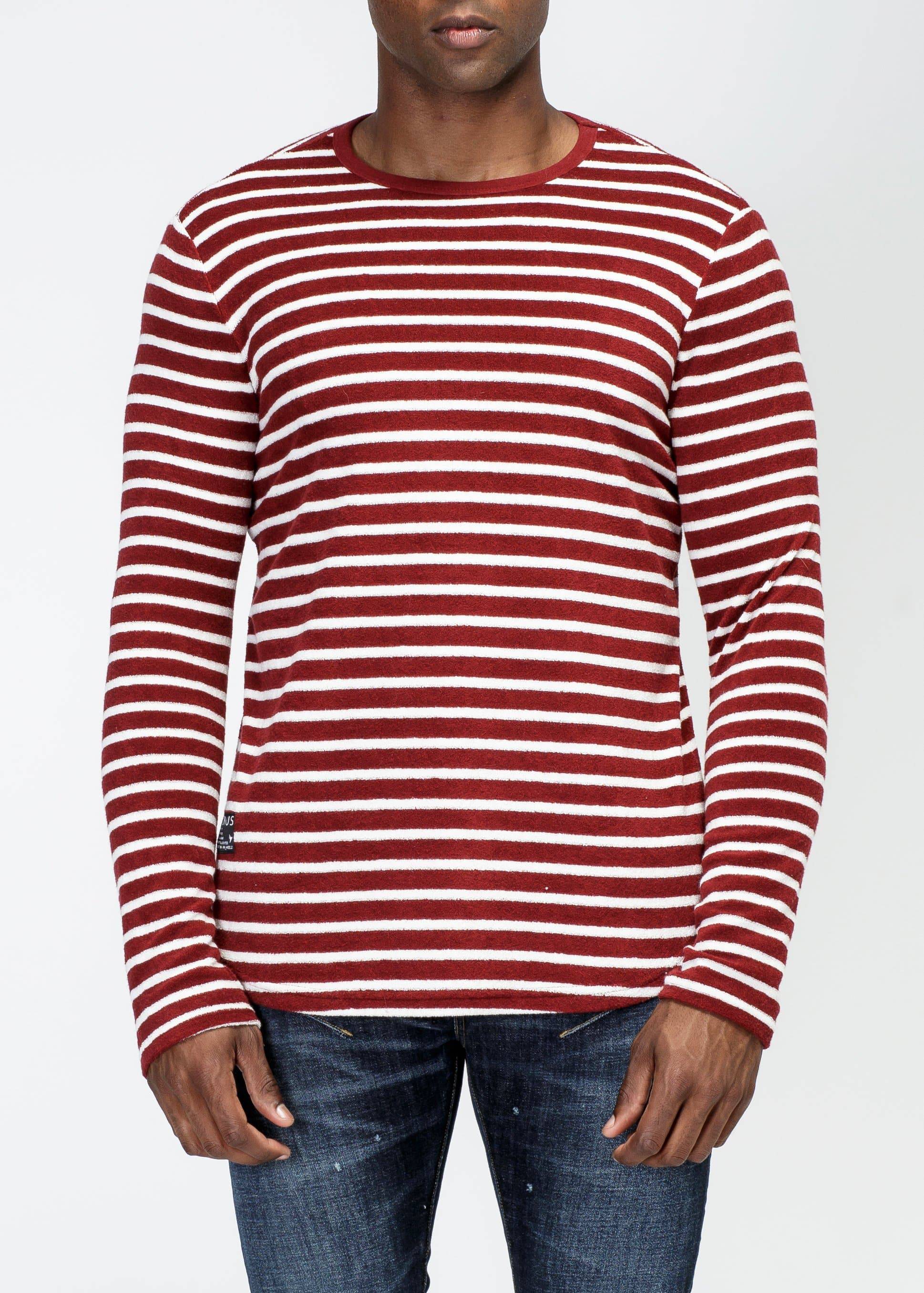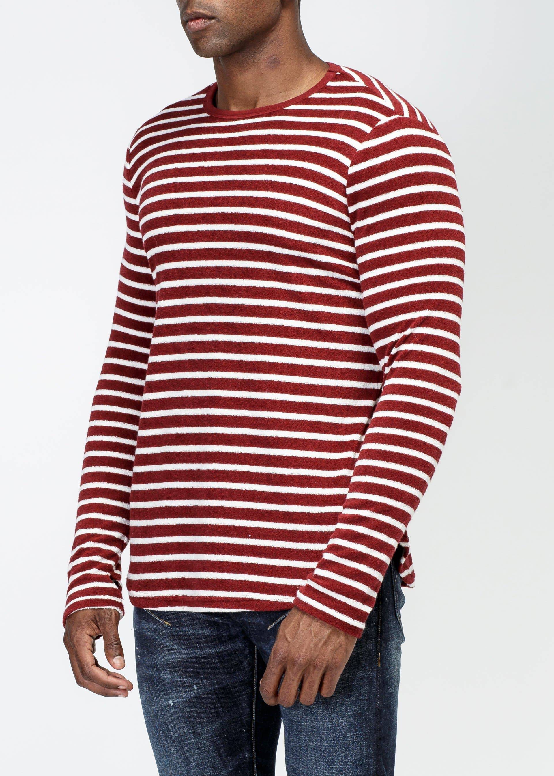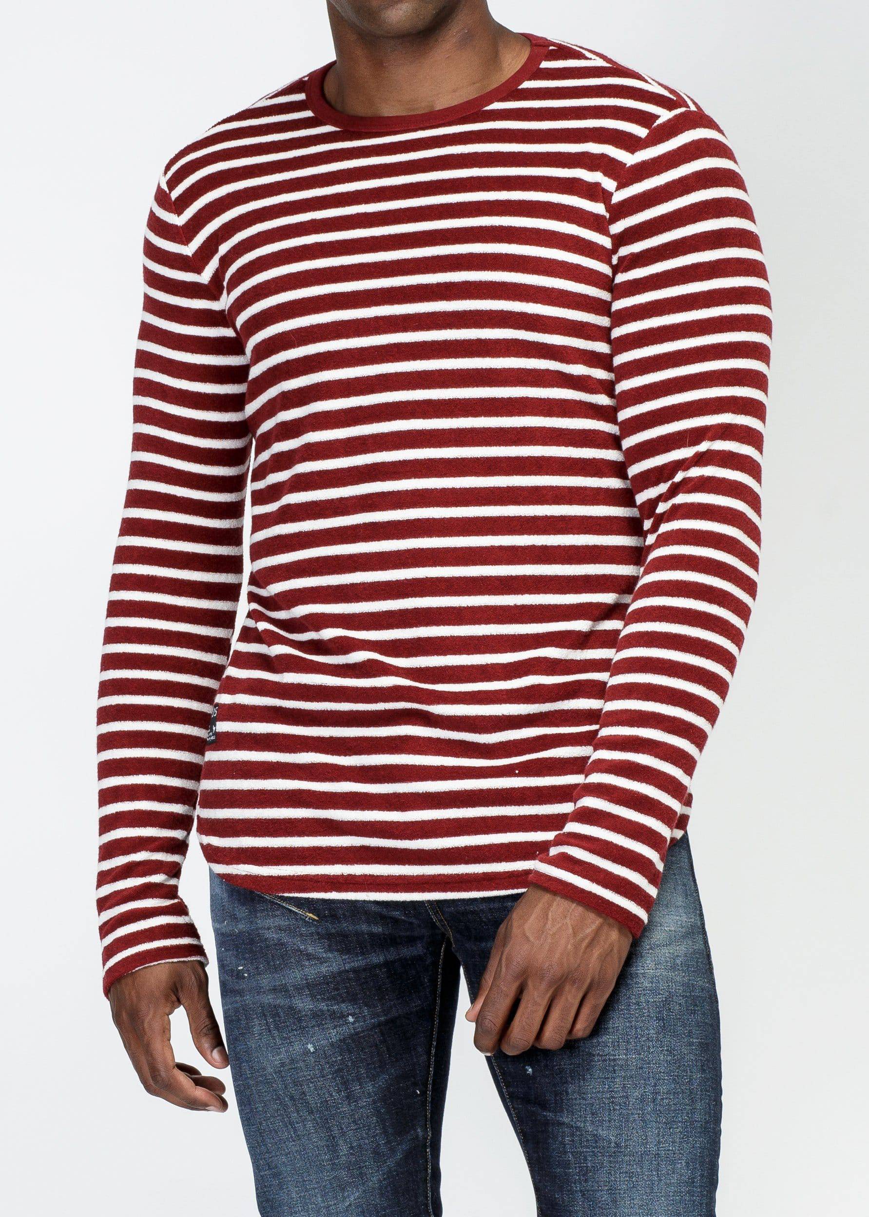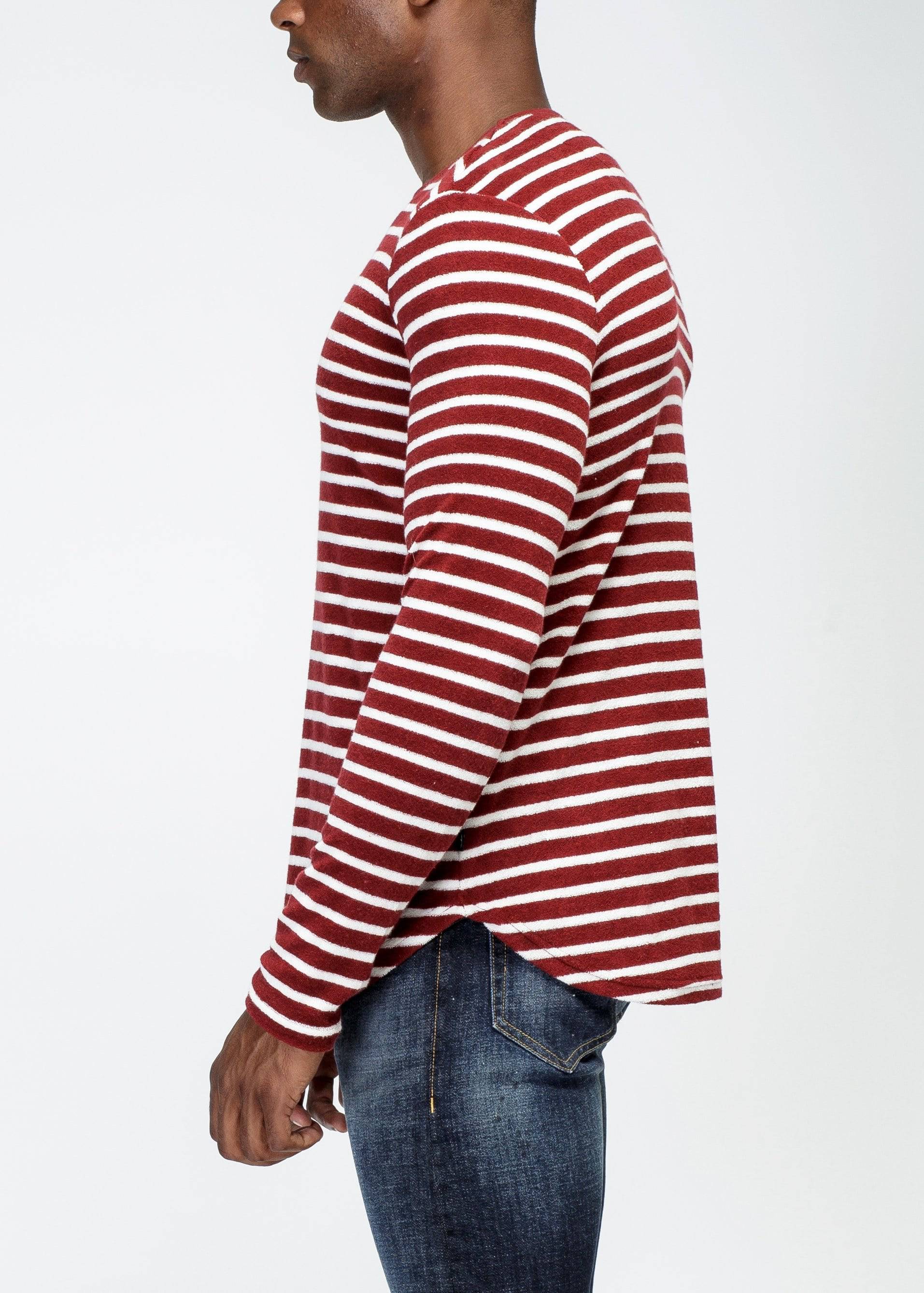 Men's scalloped long sleeve yarn dye stripe terry tee with accent label at hem area