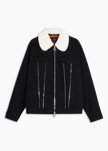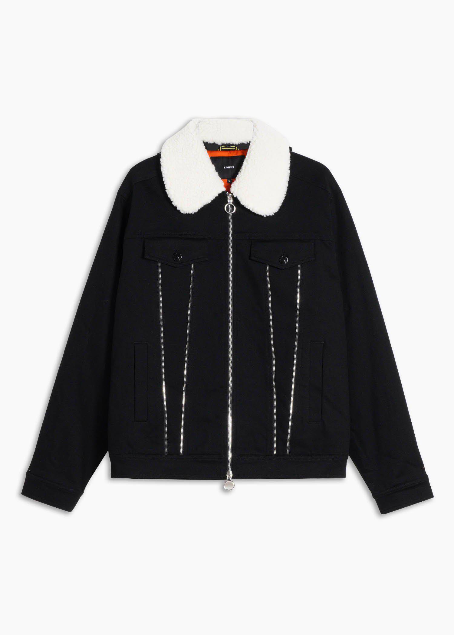 Light-filled twill trucker jacket with off-white Sherpa collar features zip-up front closure and zipper details on the front and back. This piece is a must-carry for winter fashion