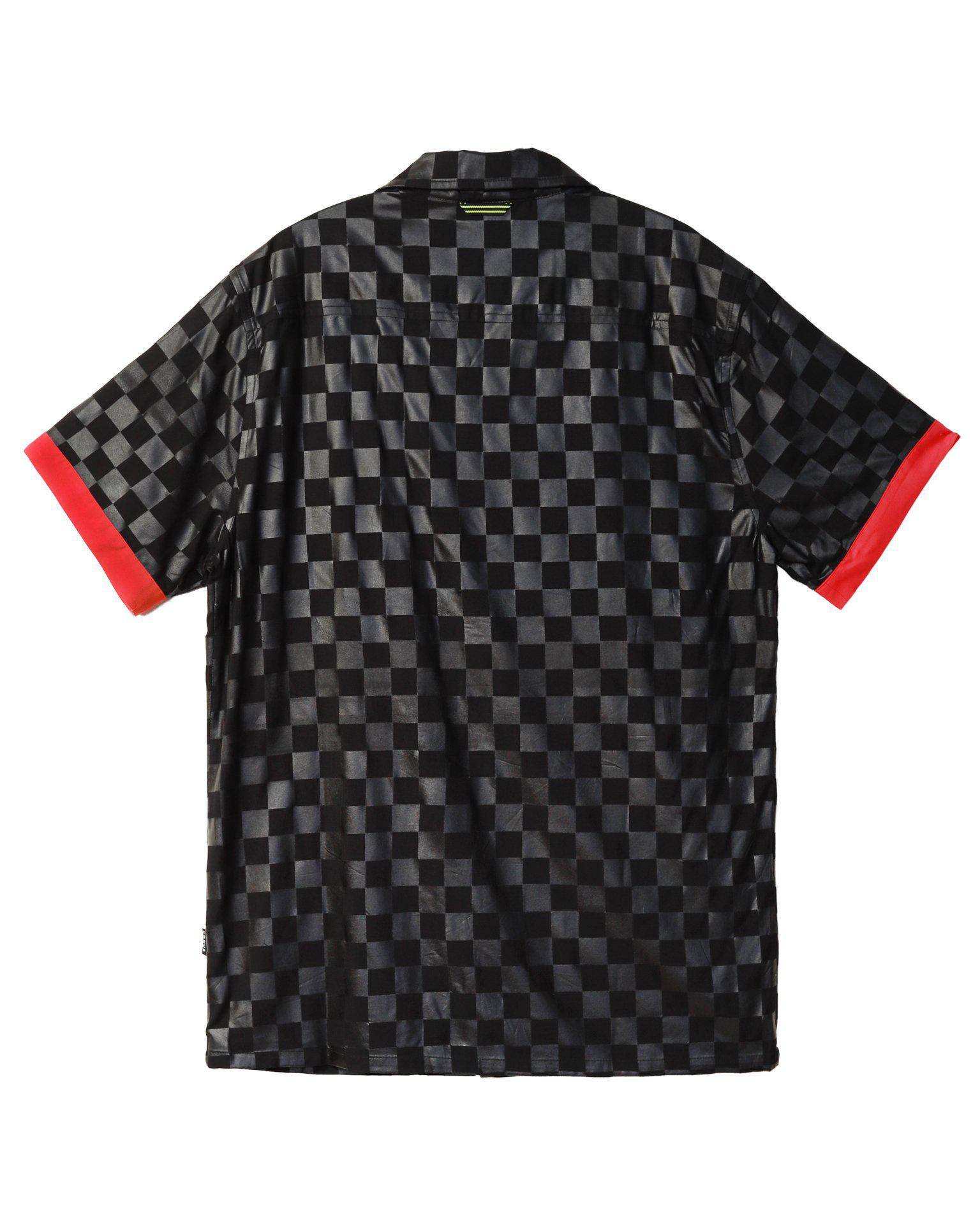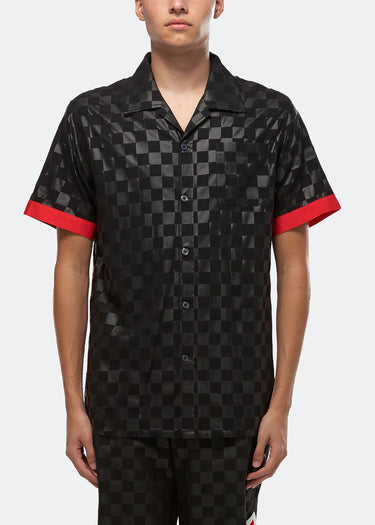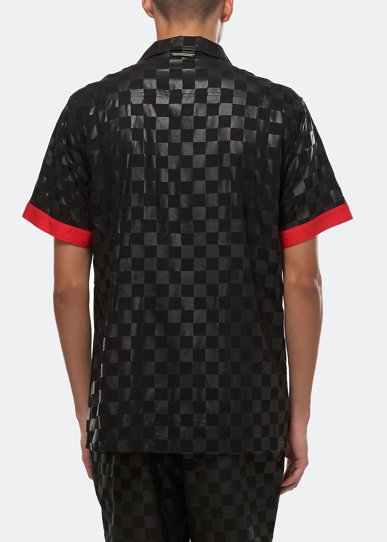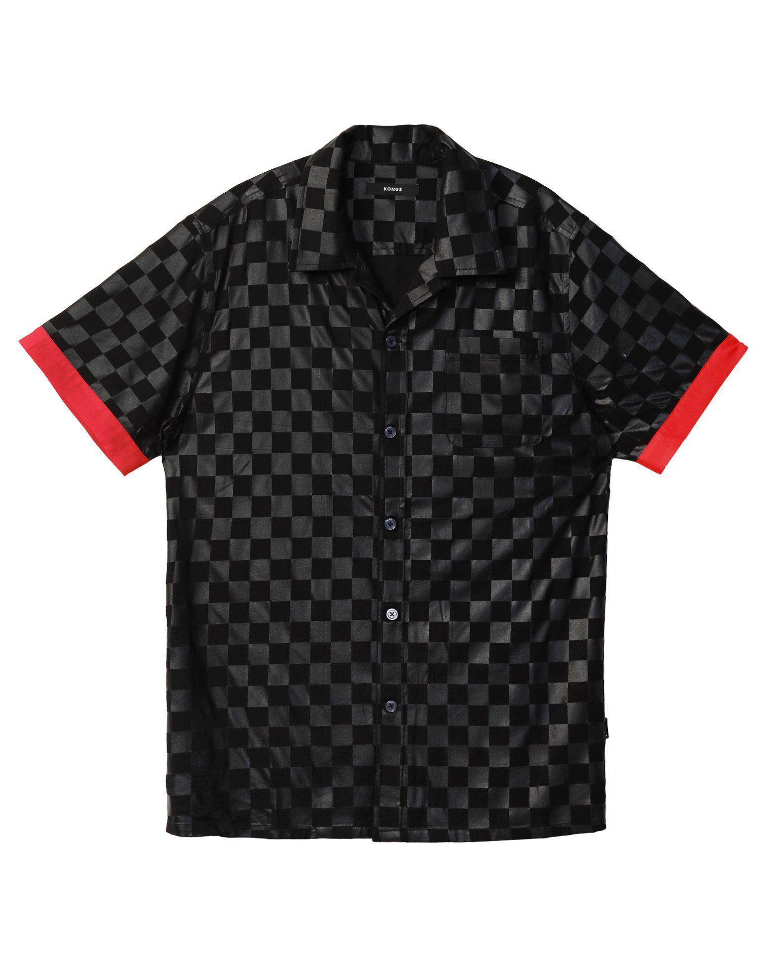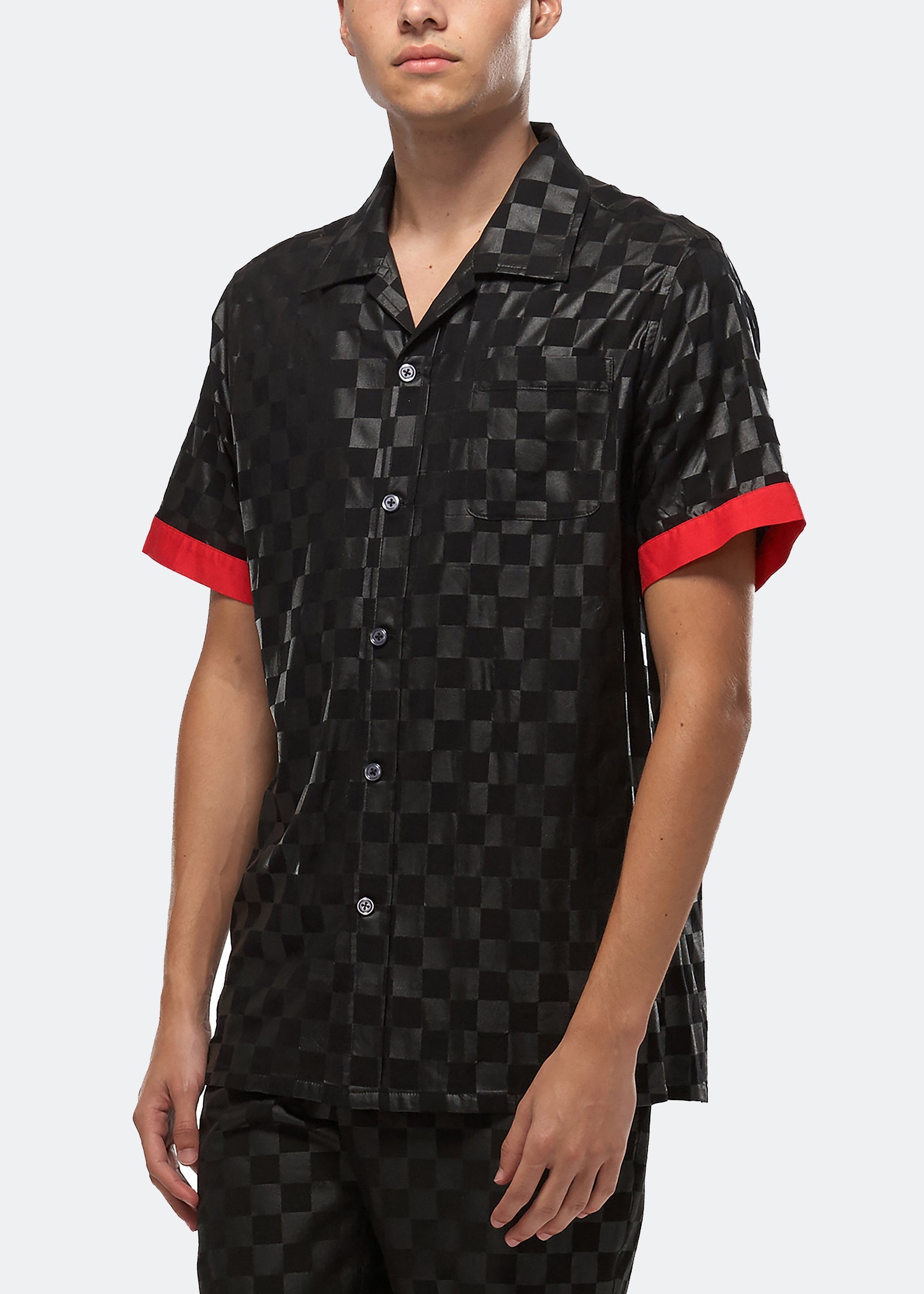 Short sleeve revere collar shirt in black tonal checker printed fabric features red contrast fabric on cuffs