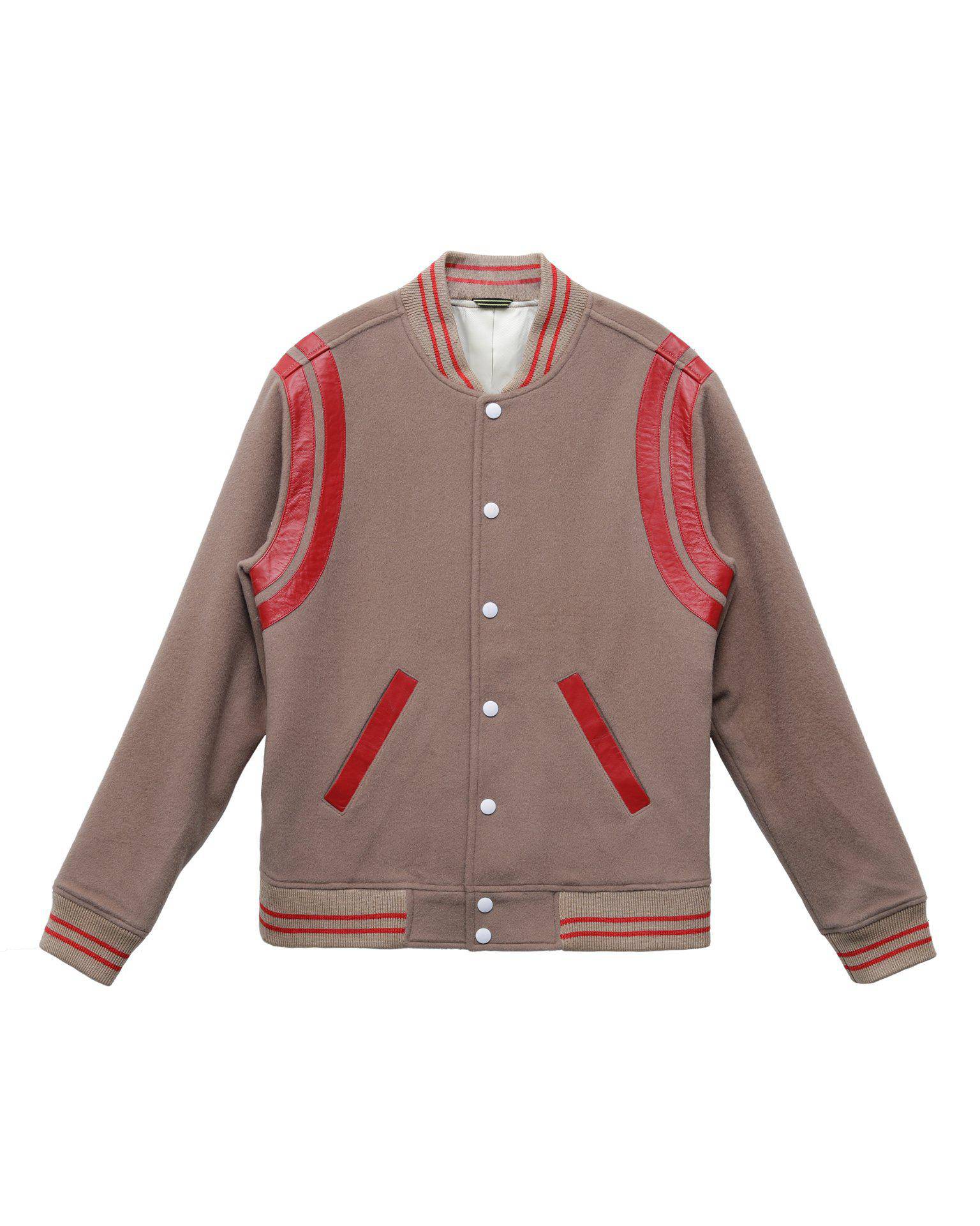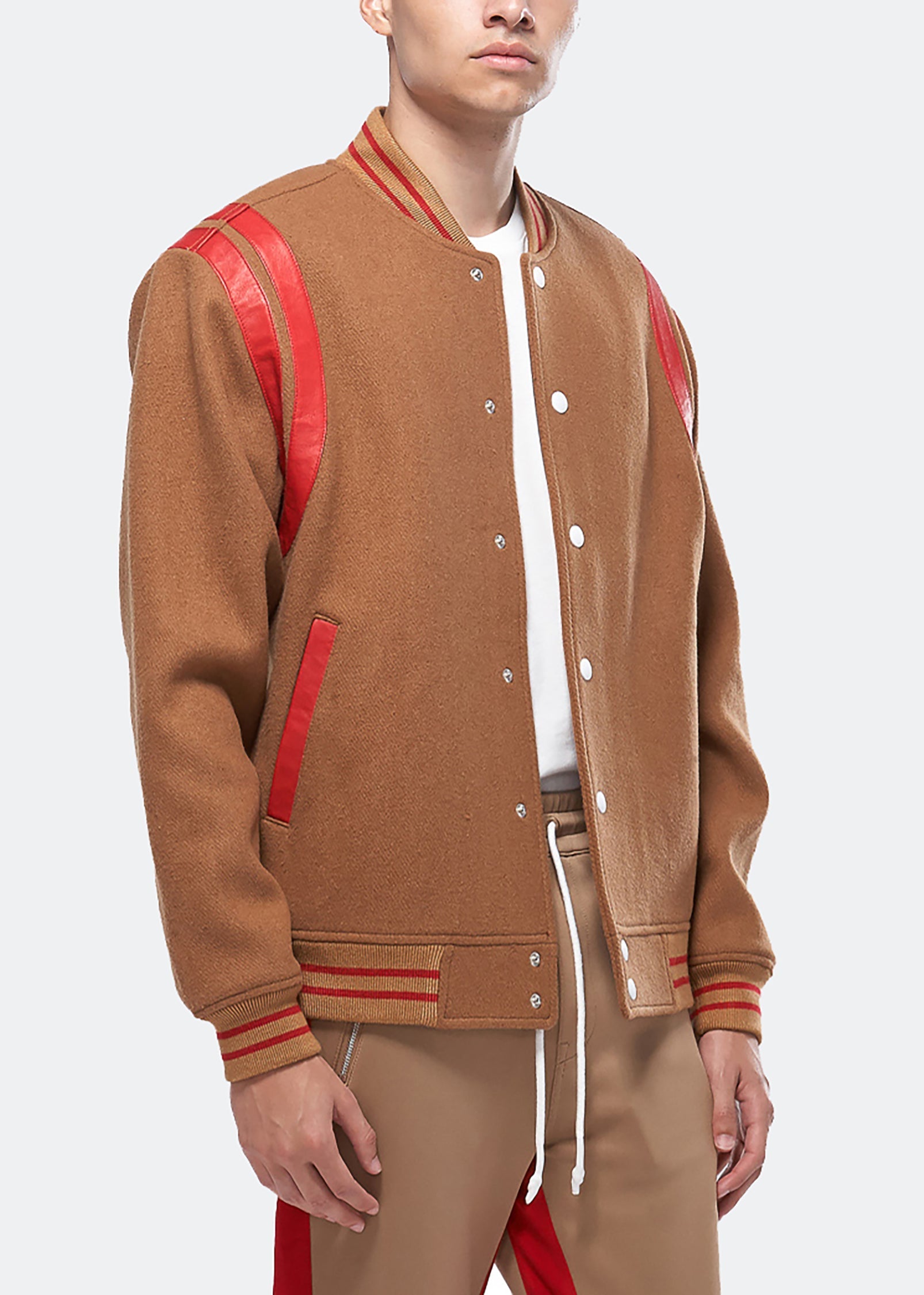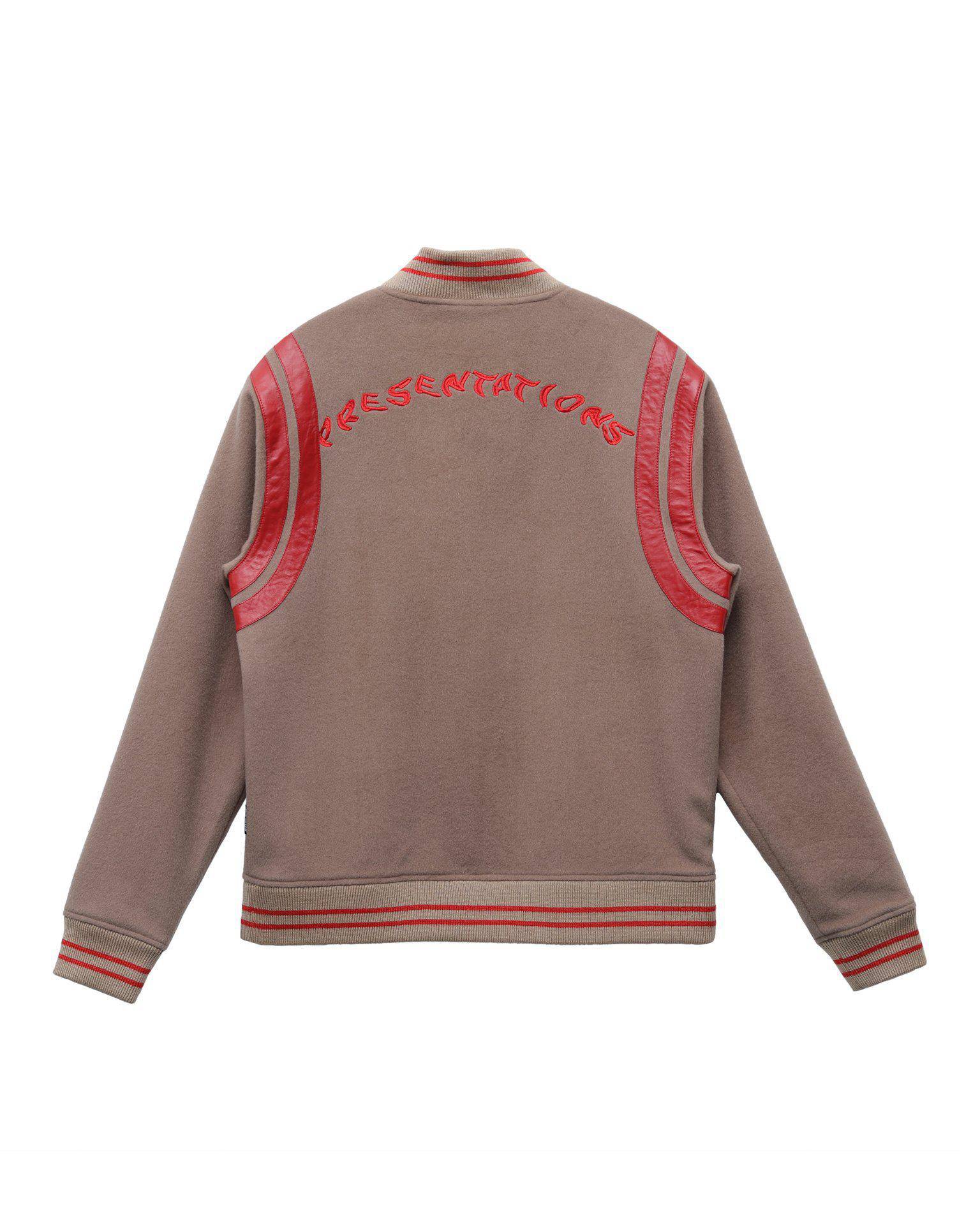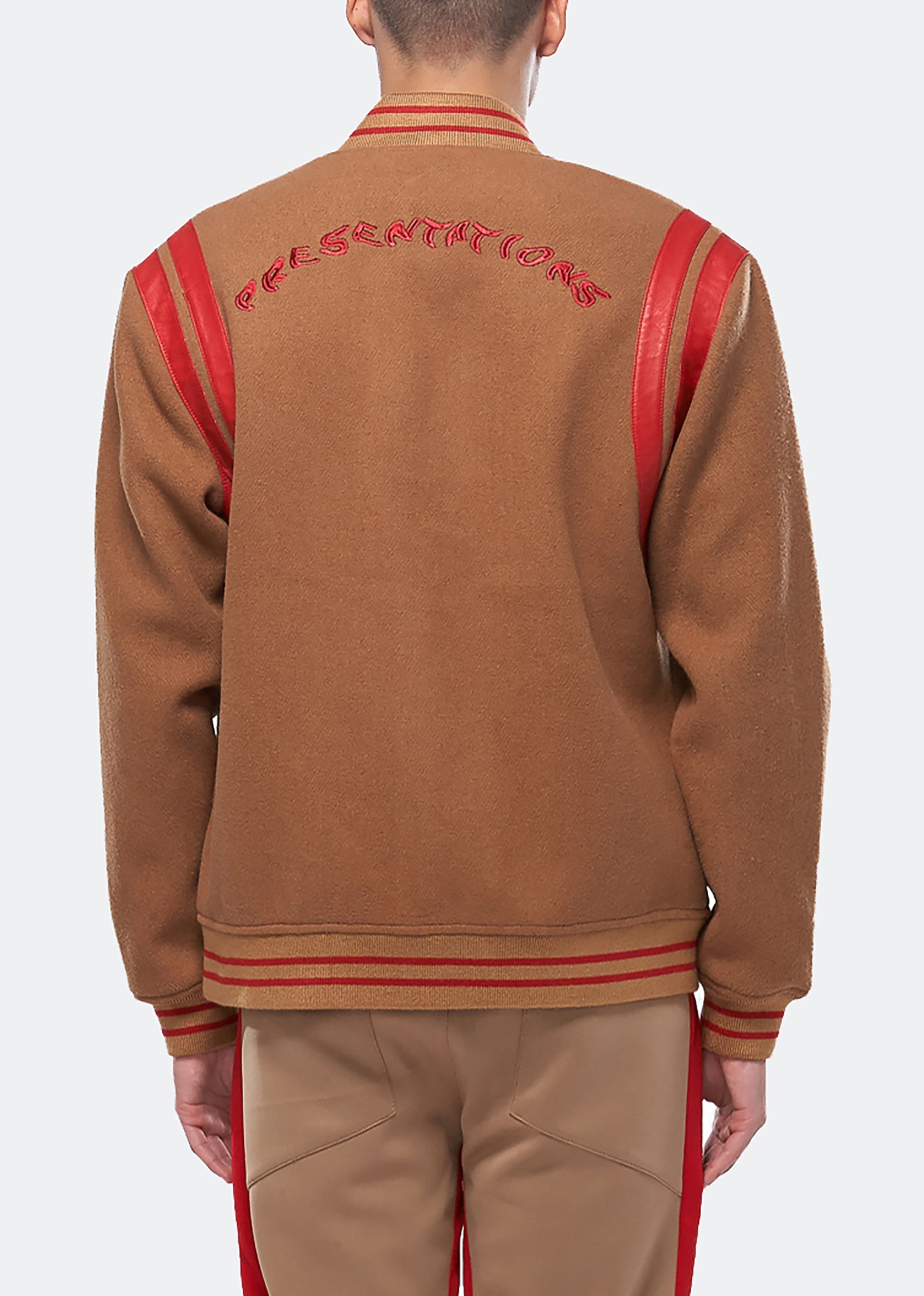 Wool blend varsity jacket with leather trims around armholes and front welt pockets. Also features striped ribbing at cuffs and waist and "PRESENTATIONS" embroidered on the back.