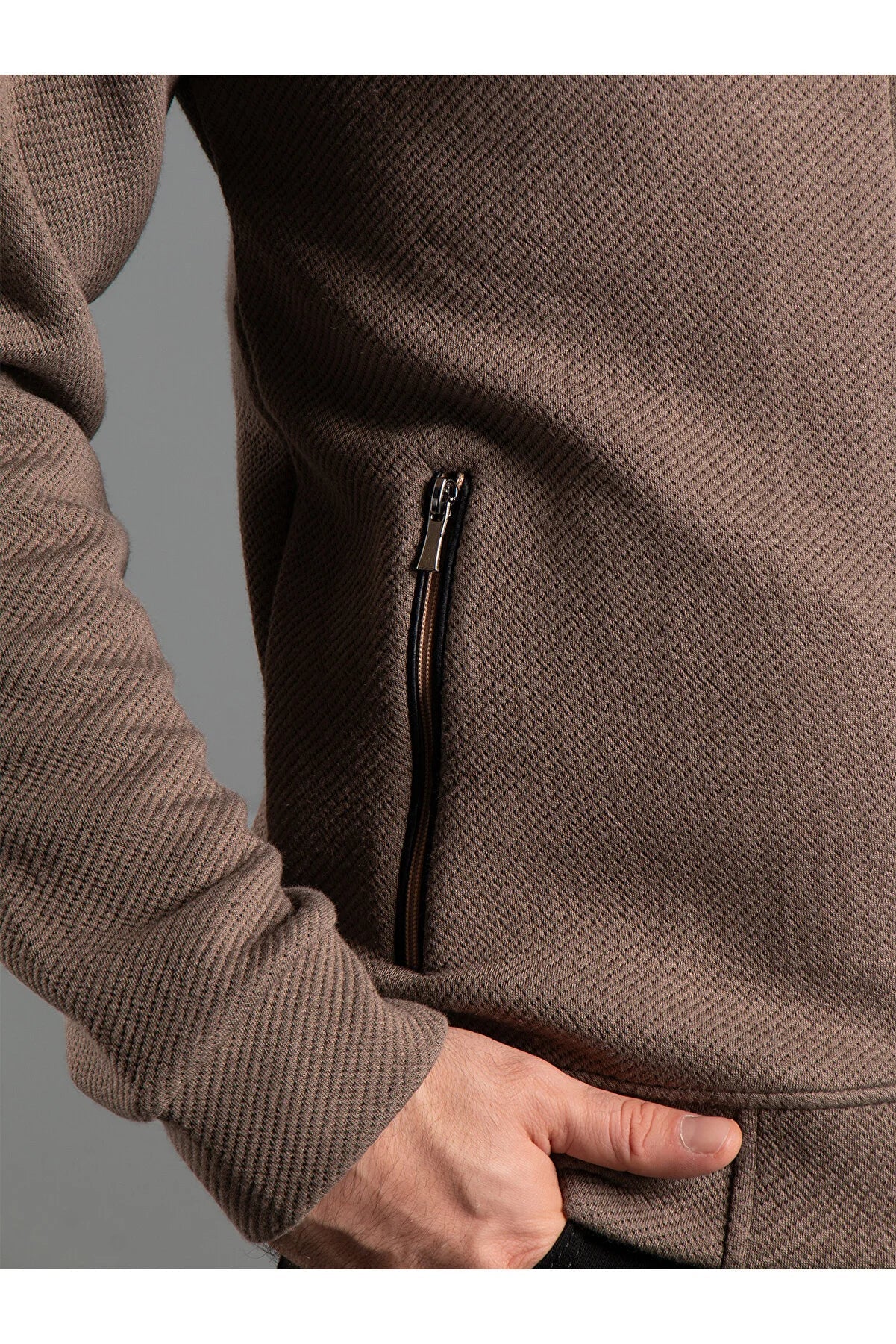 - It is crafted using a knitting technique and consists entirely of polyester material, with a zippered closure and a fleece weaving type.