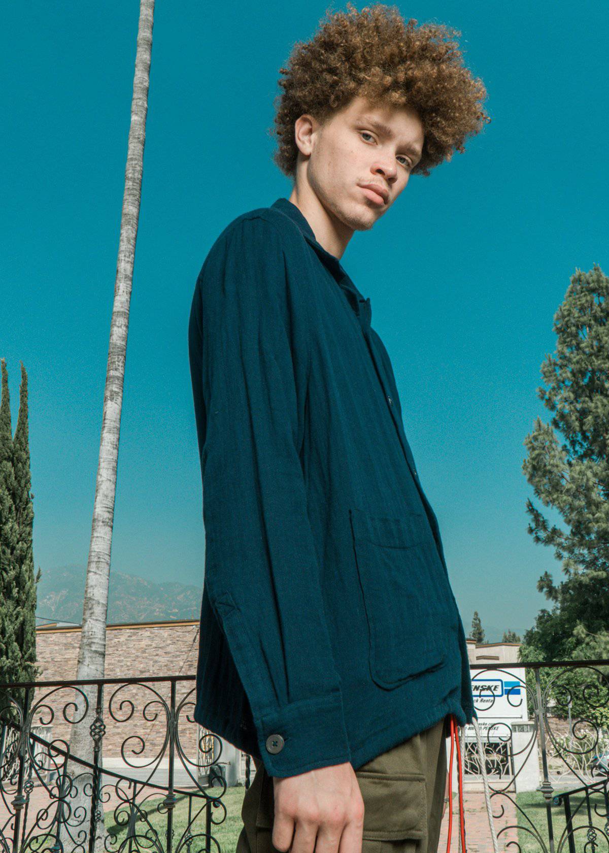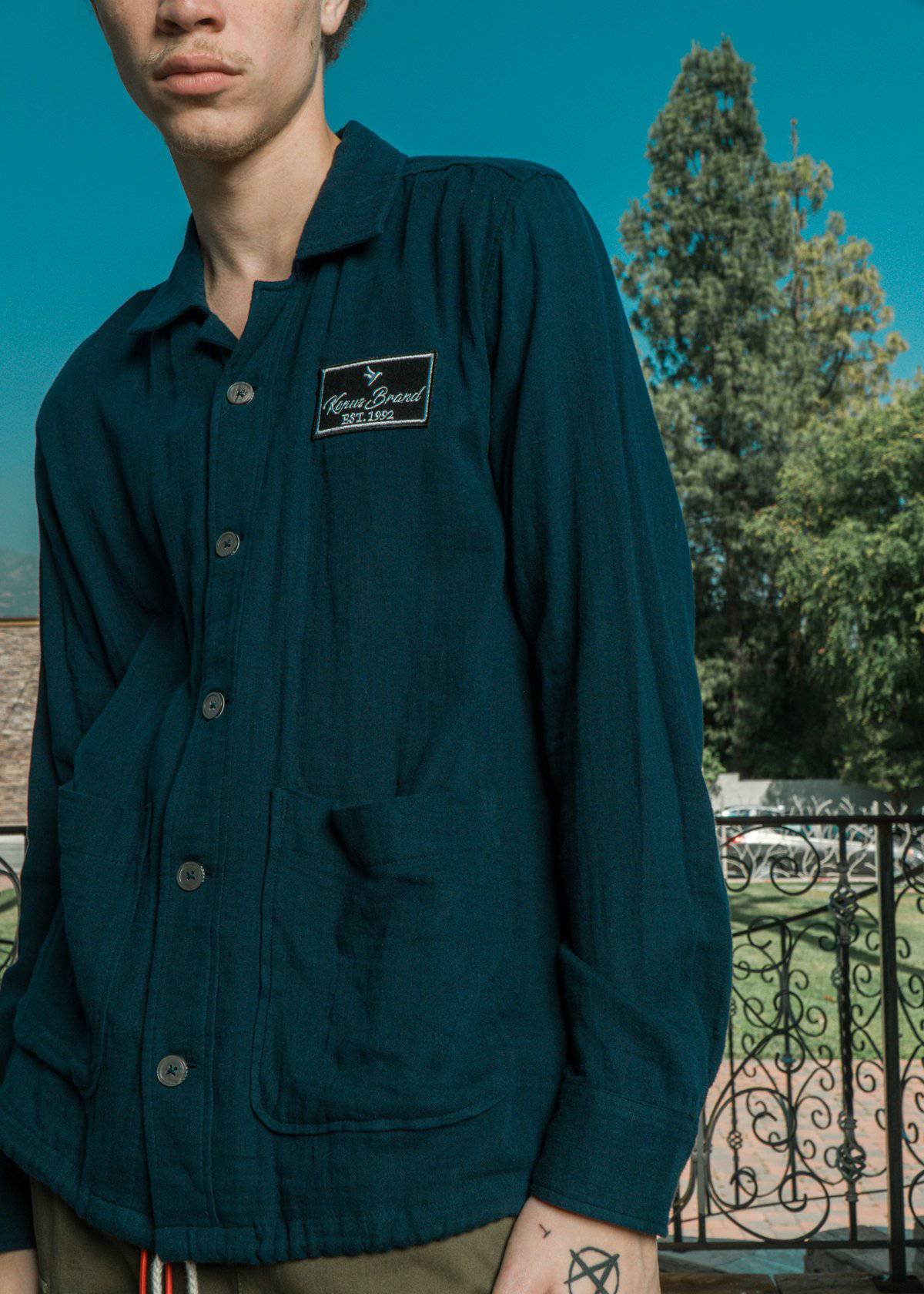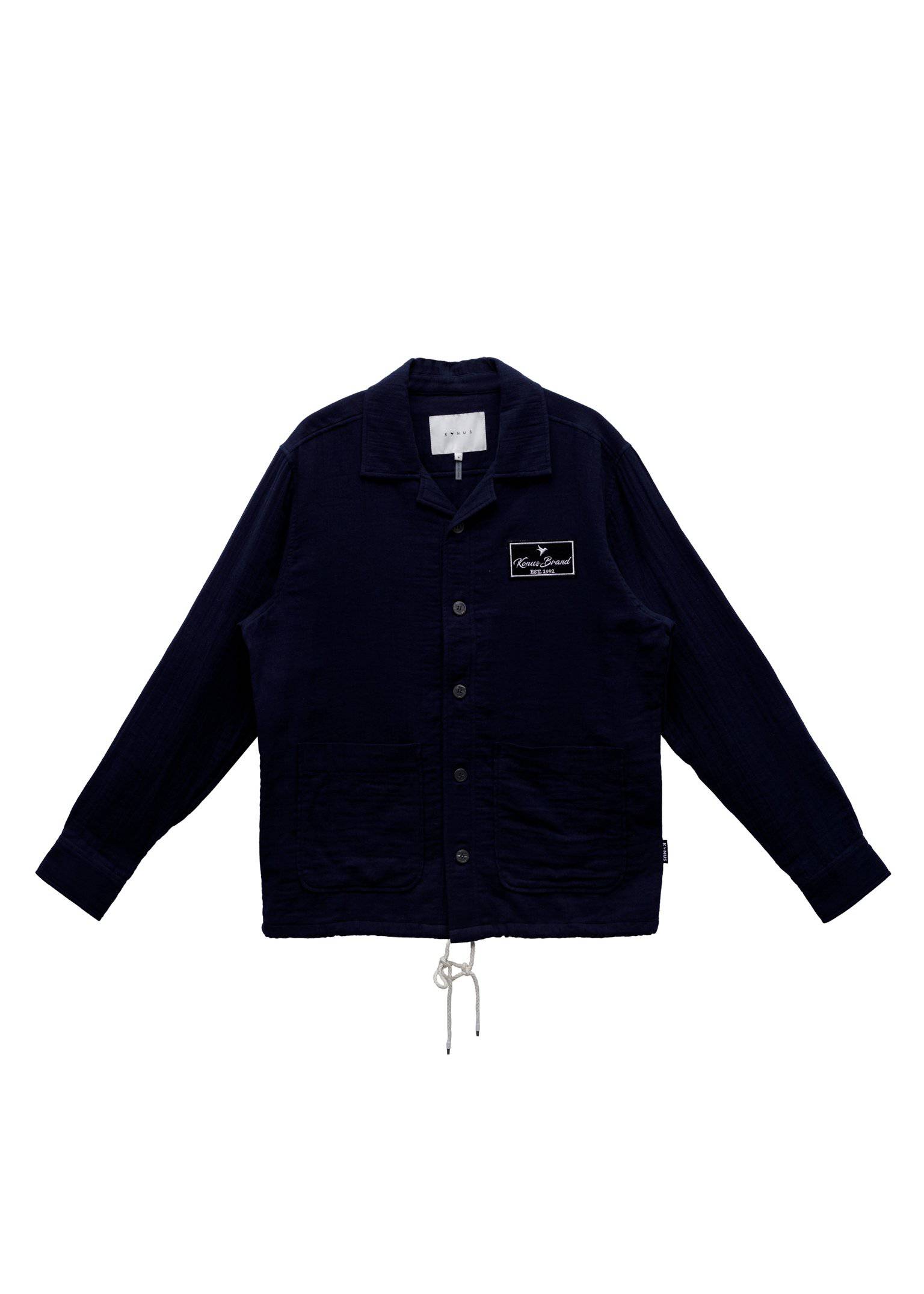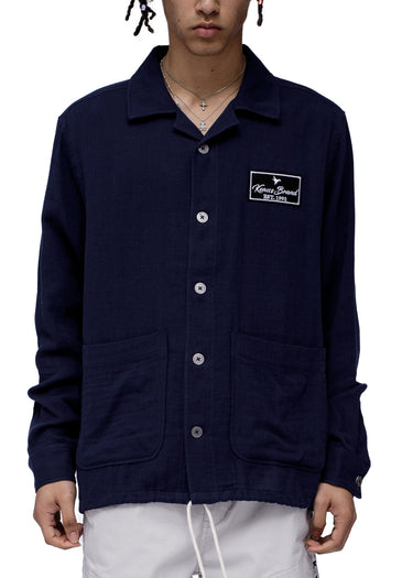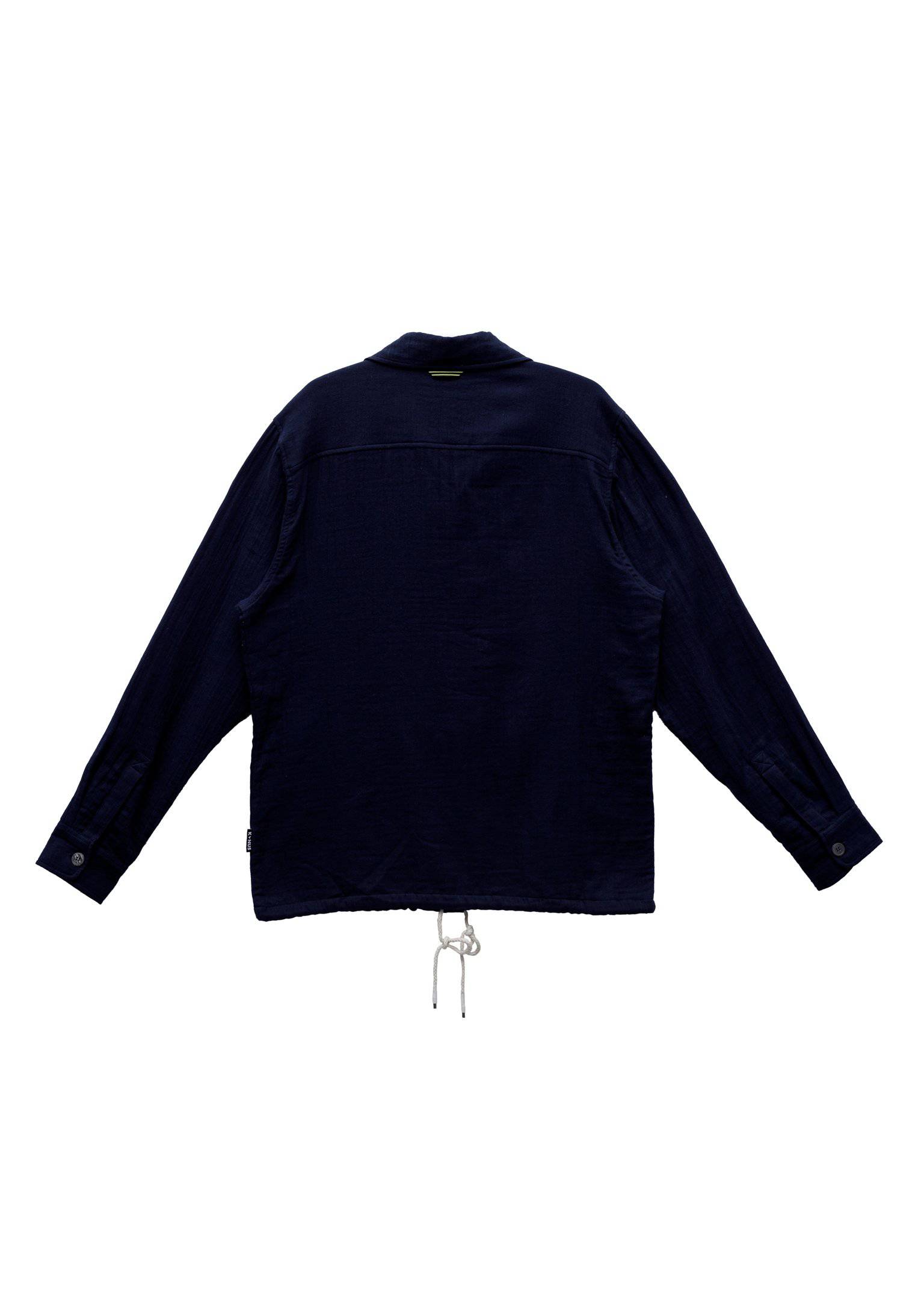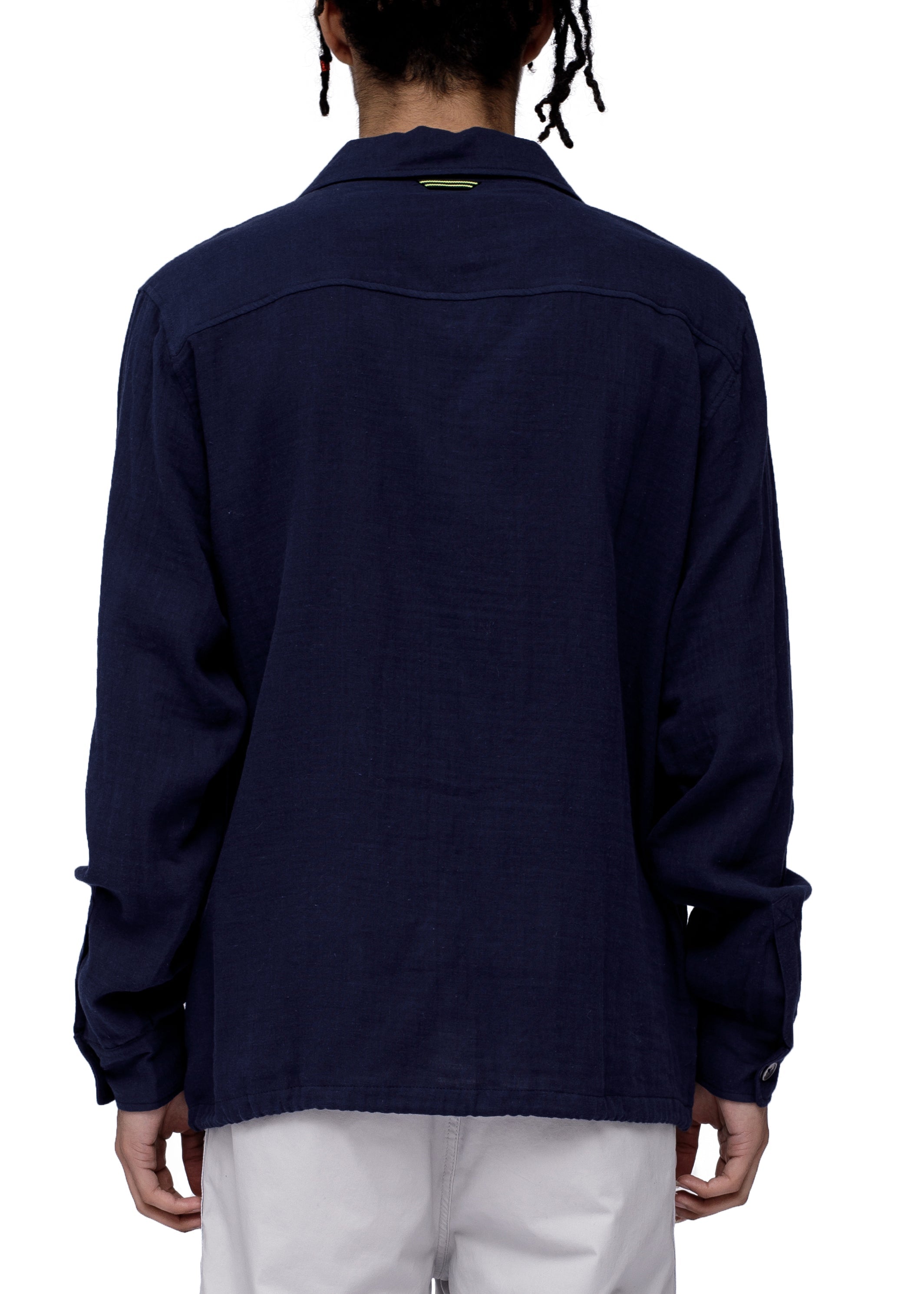 Open collar long sleeve shirt with hand pockets, chest patch and drawcord at hem.