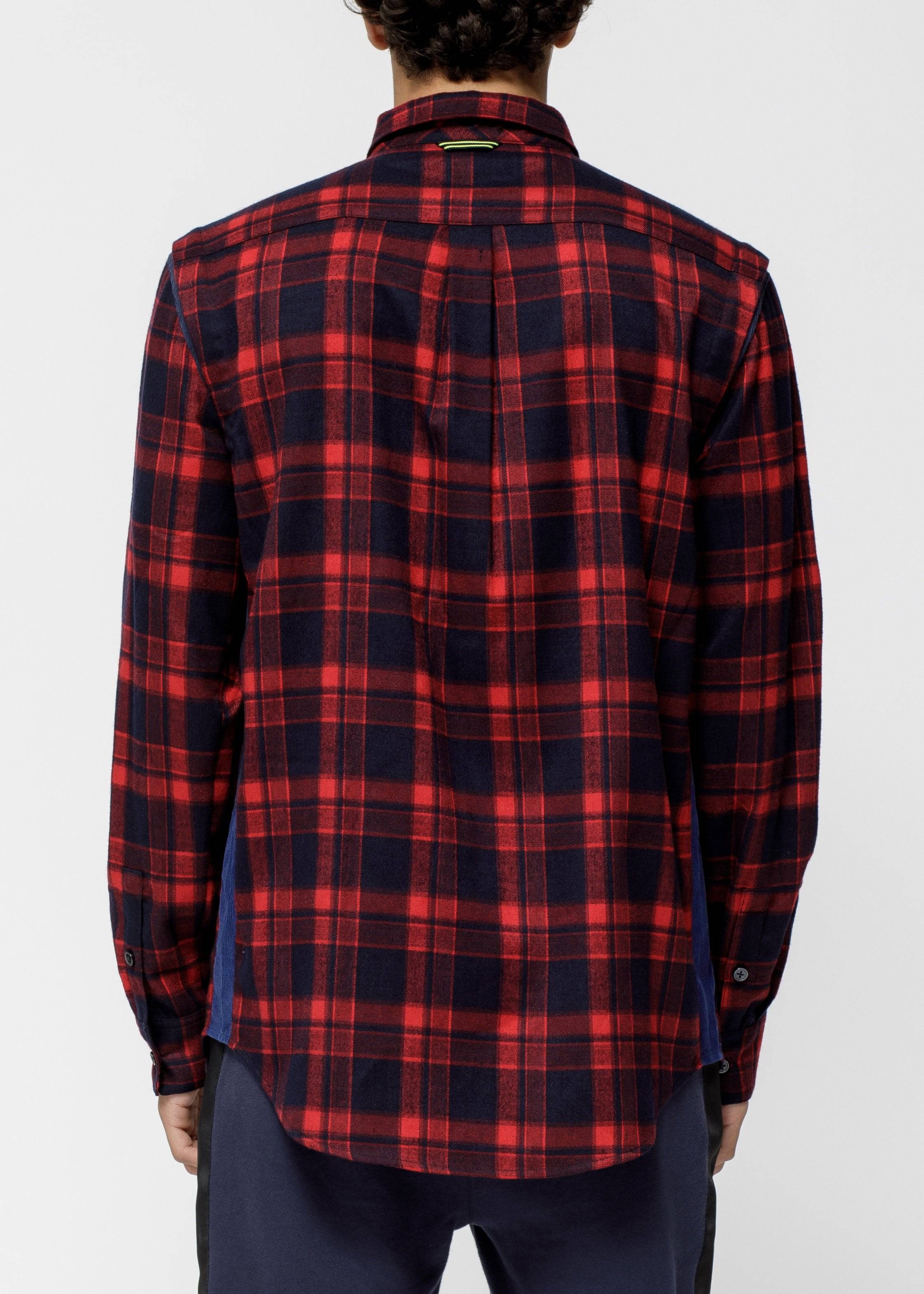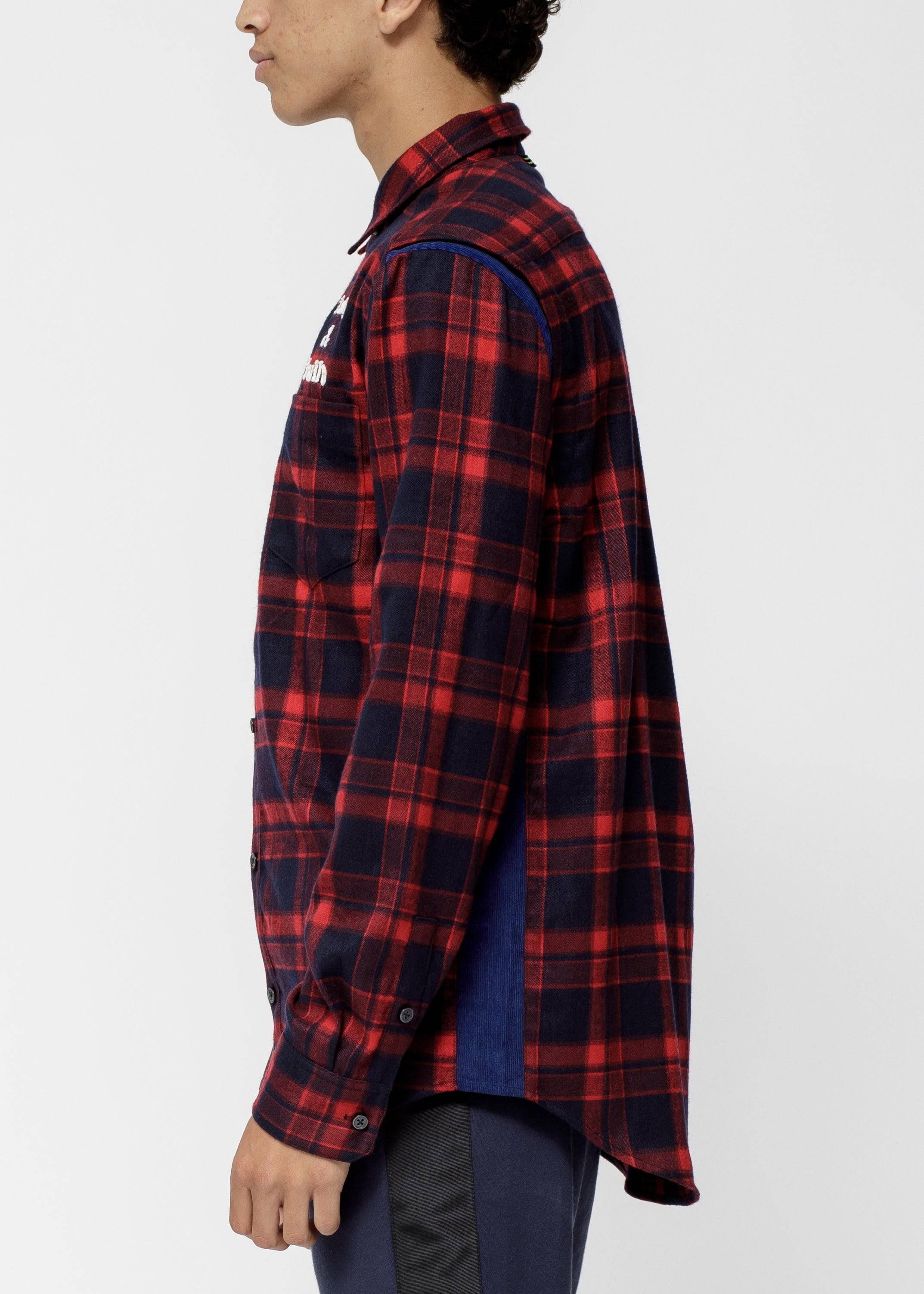 Long sleeve button-up plaid shirt in cotton flannel with contrast corduroy fabric on side panels and shoulder gusset detail.
