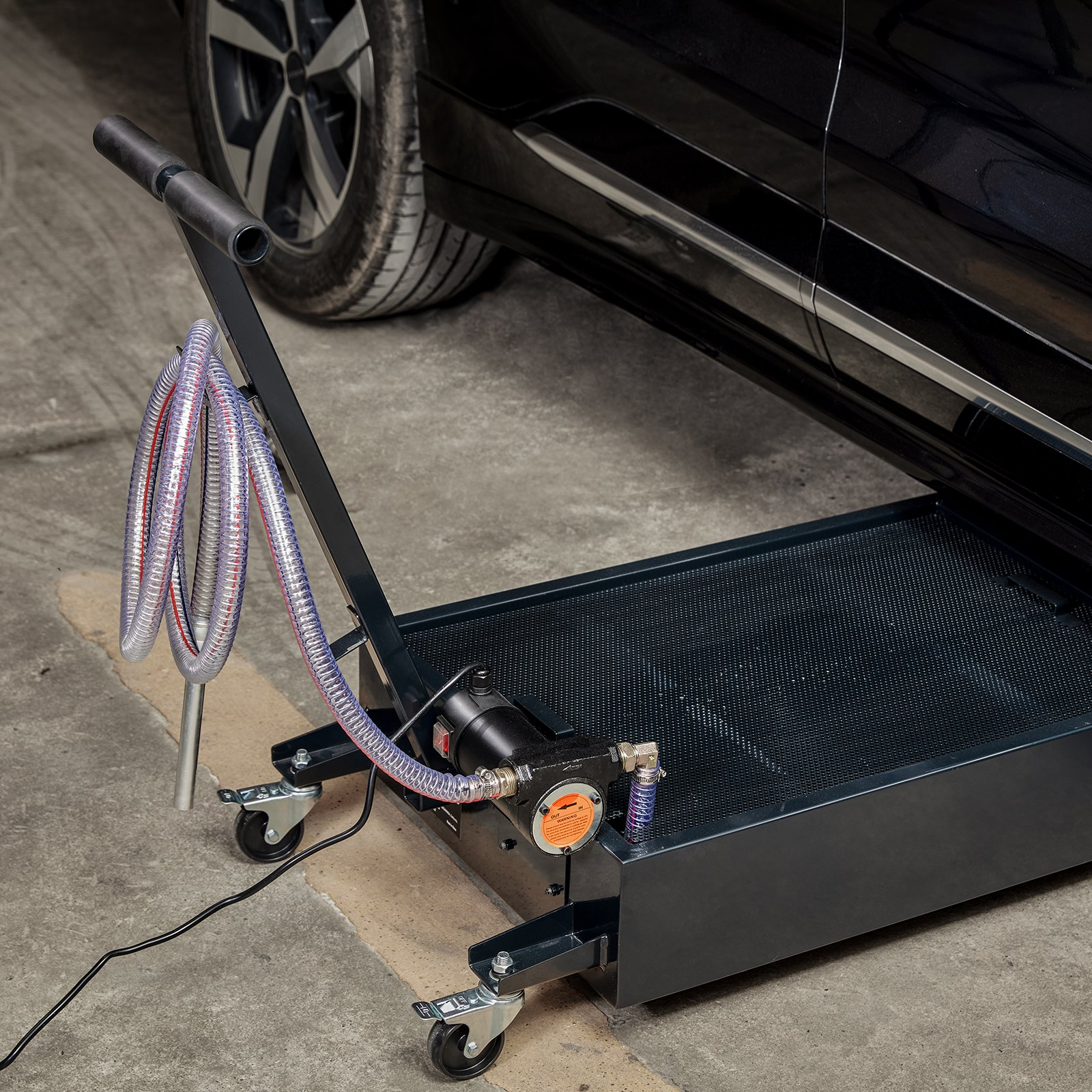 (FINAL PRICES ARE LOWER ON OUR SITE!) VEVOR Low Profile Oil Drain Pan, 15 Gallon Oil Drain Pan with Pump, Oil Change Pan with 180W Electric Pump, 8.2ft Hose & Folding Handle, Rolling Oil Drain Cart for Trucks, Buses, RVs