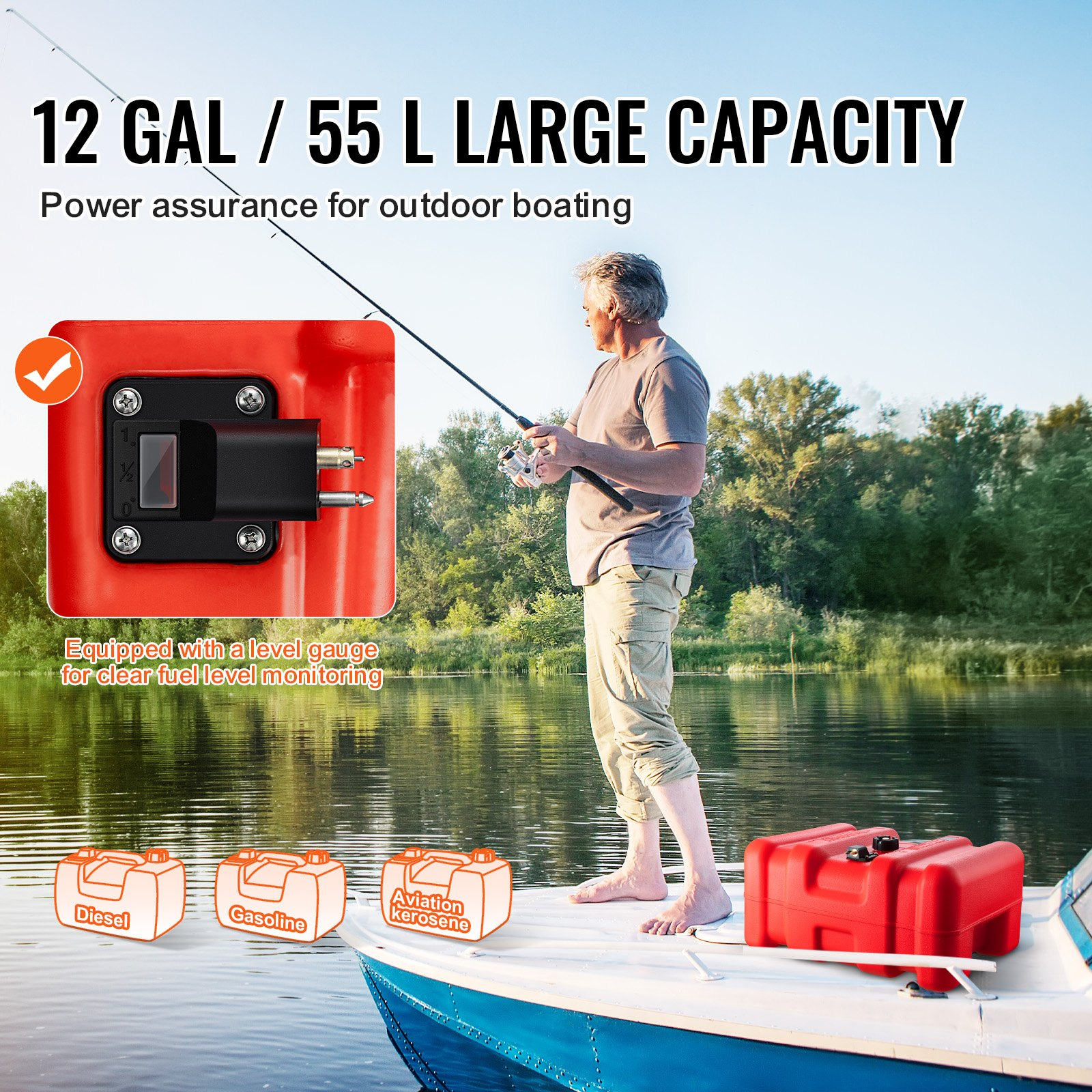 PRODUCT DESCRIPTION VEVOR Marine Fuel Tank, 14.53 Gallon/55L, Portable Boat Fuel Gas Tank for Outboard Engine Boats, Plastic Outboard Marine Boat Fuel Tank with Hose, Easy to Carry for Yacht, Fishing Boat, Deck Boat, Red