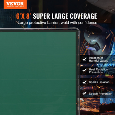 PRODUCT DESCRIPTION VEVOR Welding Screen with Frame, 6' x 8' Welding Curtain Screen, Flame-Resistant Vinyl Welding Protection Screen on 4 Swivel Wheels (2 Lockable), Moveable & Professional for Workshop/Industrial, Green