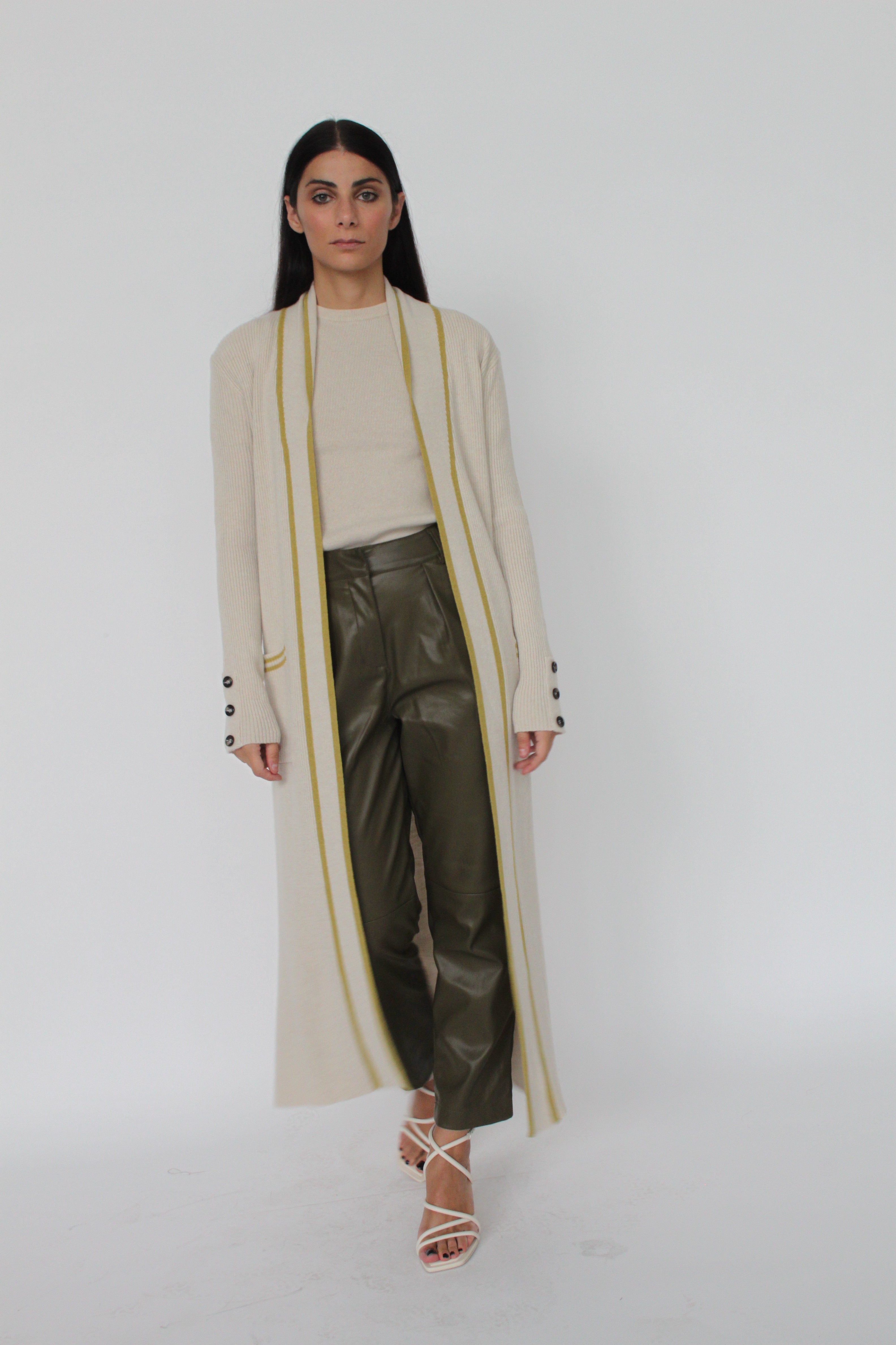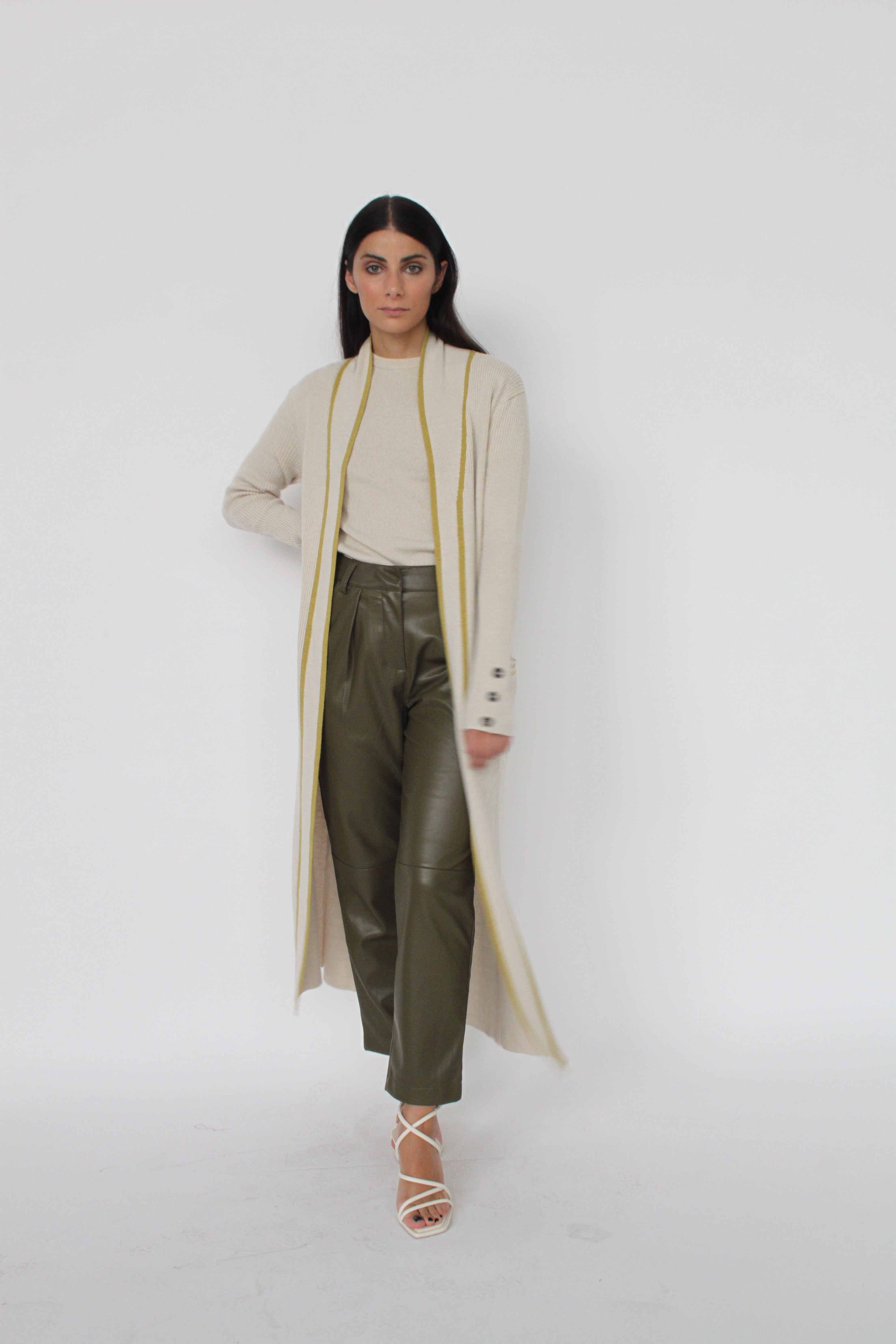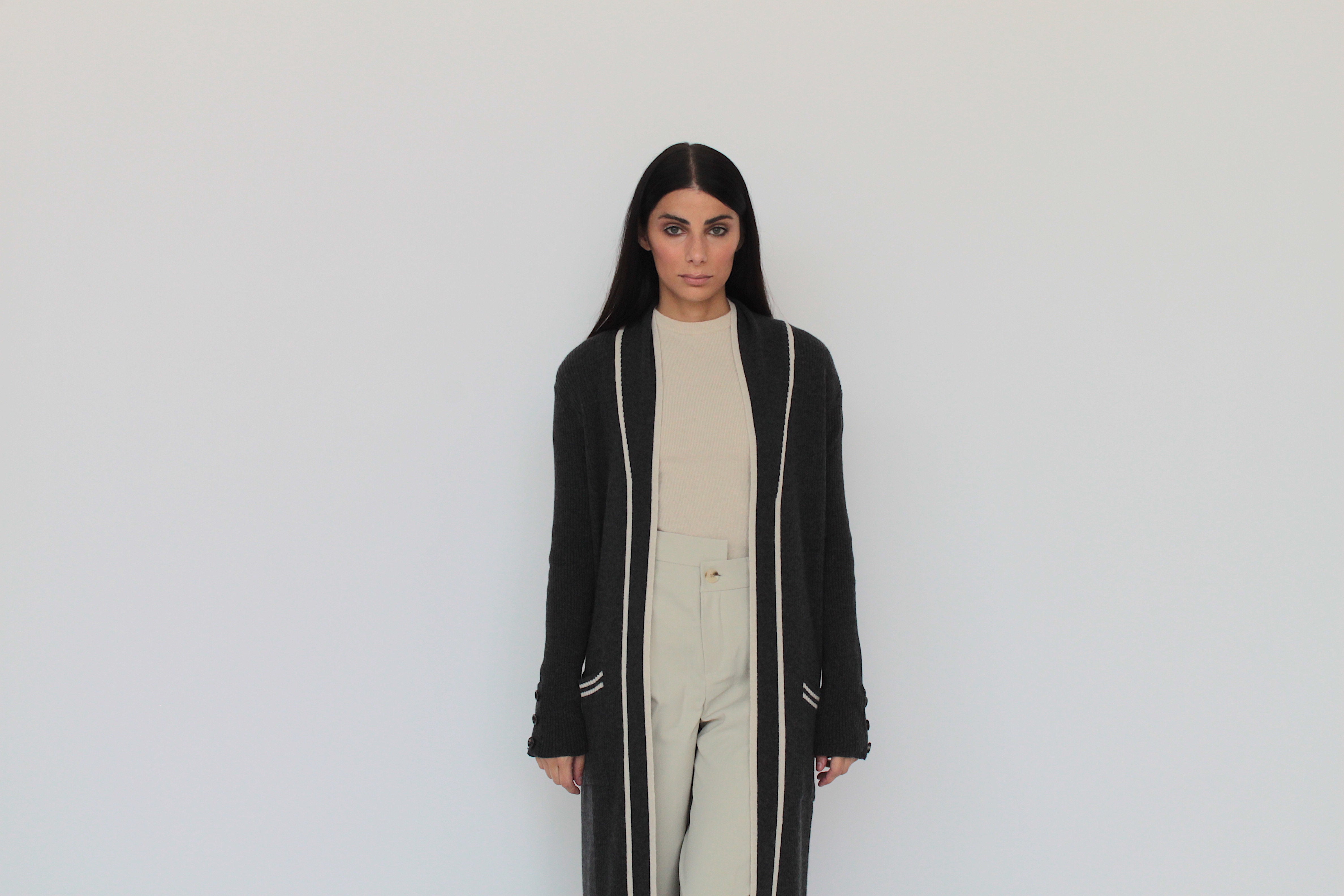 Long coat cardigan with contrasting color detail, buttons on the cuffs with pockets and martingale on the back.