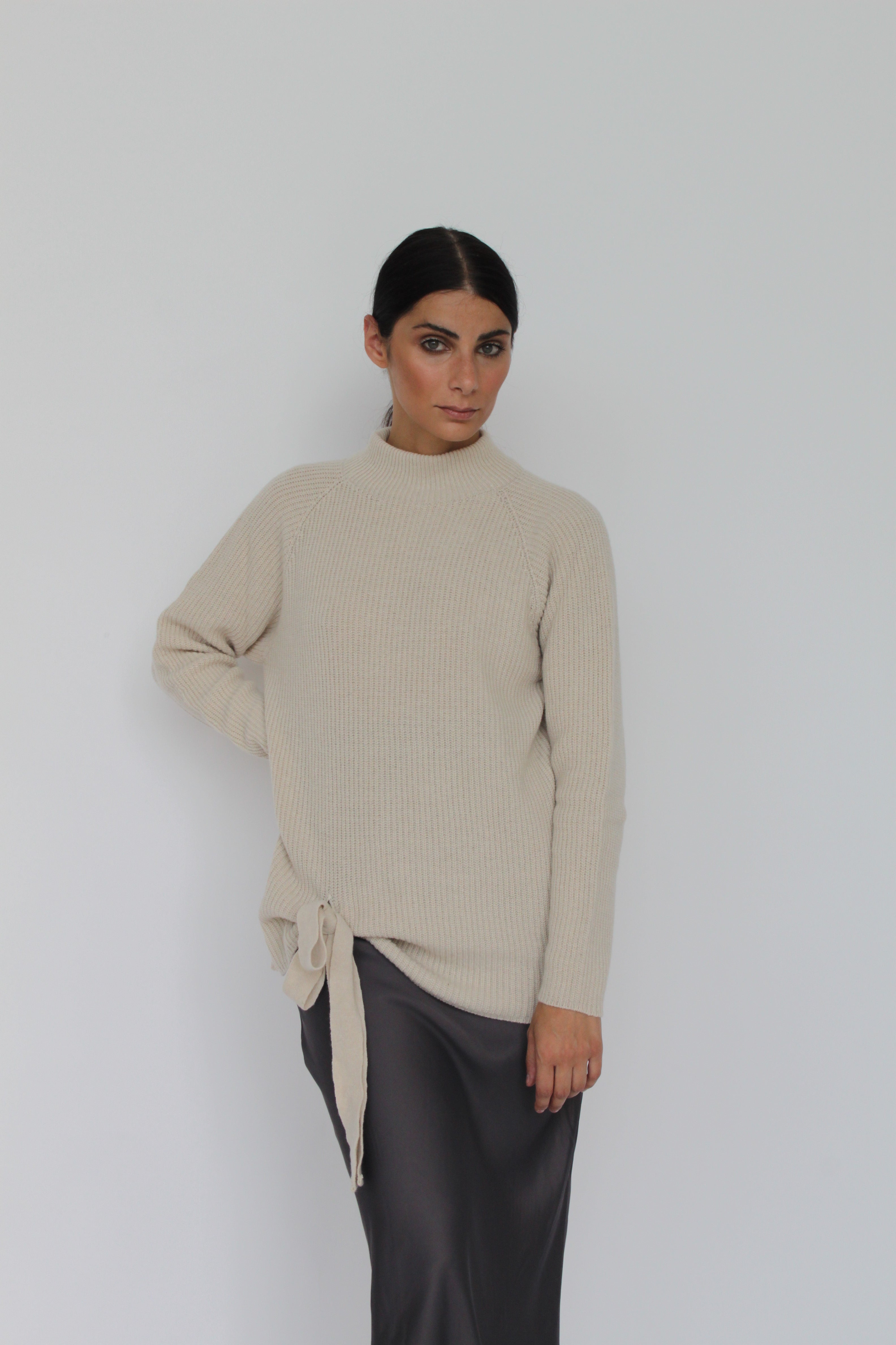 Ribbed turtleneck sweater in cashmere blend with knot on the front and half neck, with a very comfortable fit.