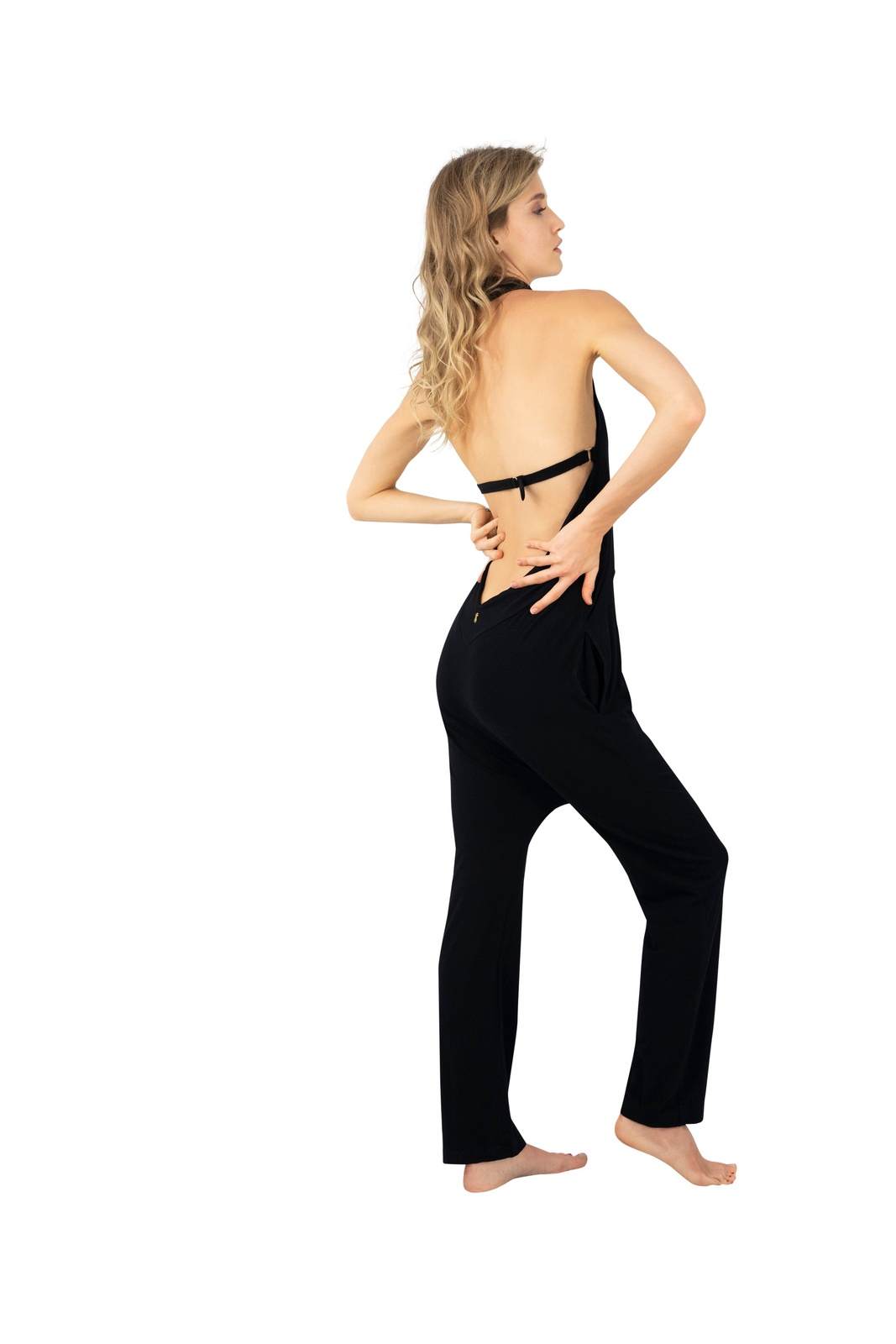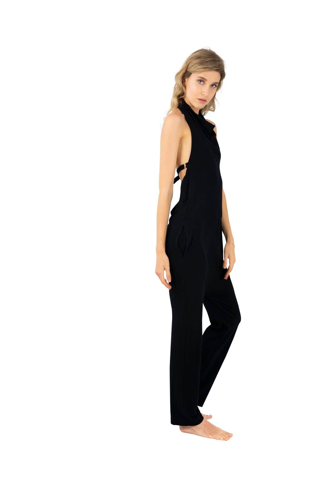 Womens Black Harem halter neck style onesie by Ekoluxe sustainable clothing brand Womens Black Harem halter neck style onesie by Ekoluxe sustainable clothing brand