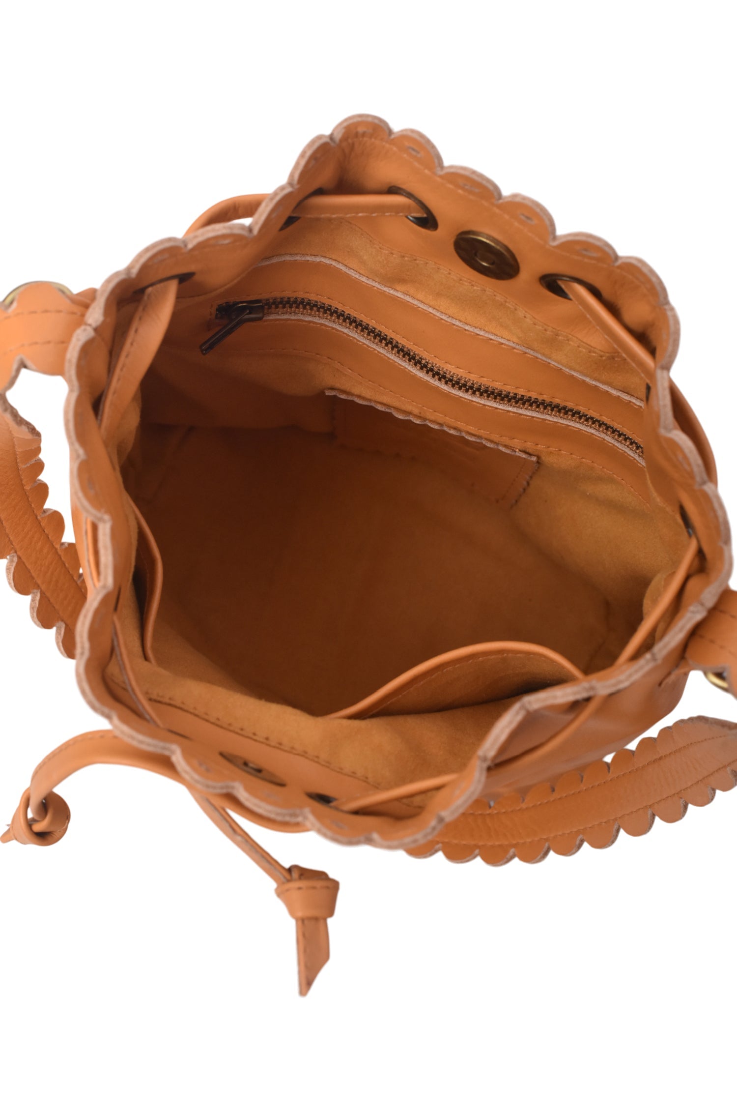 Our pretty and elegant Luisa bucket bag is crafted into unstructured silhouette from genuine soft leather. It is detailed with dreamy cut outs and adorned with scallops. The inside of the bag offers a spacious interior with wall zip pocket and two slip pockets. It is simply perfect to wear on the weekends and on your city adventures.