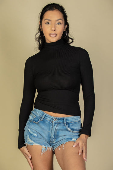 ribbed turtleneck top, fitted long sleeve top, classic turtleneck, chic layering piece, stylish basics, casual elegant wear, sleek ribbed knit