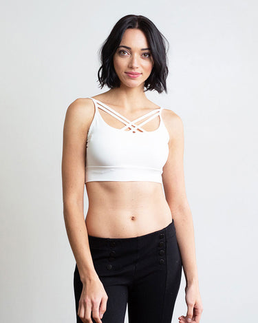A woman wearing a white sports bra top with a Strappy Criss Cross Cami Bralette design. A woman wearing a white sports bra top with a Strappy Criss Cross Cami Bralette design.
