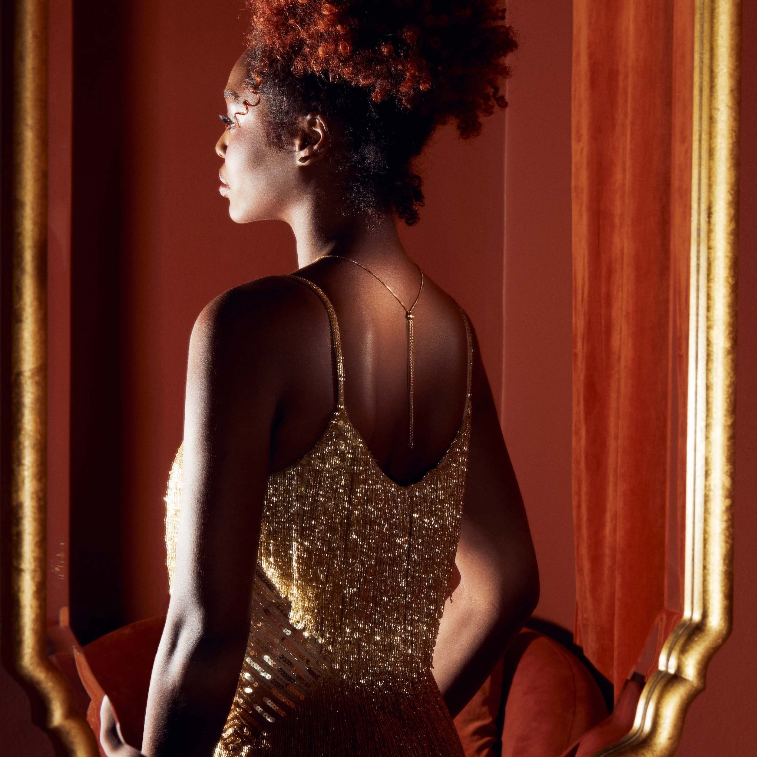 With a touch of audacity and a hint of playfulness, the sleek Stella Lariat Necklace embraces your neckline, skillfully highlighting and accentuating every curve and angle.