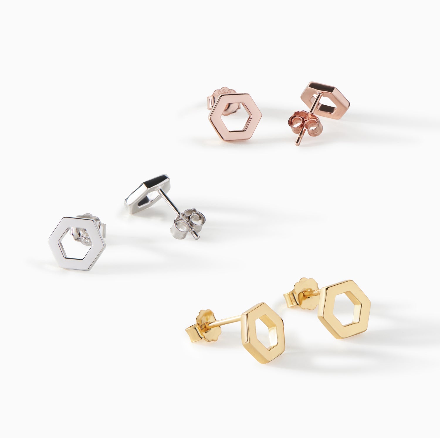 Experience the perfect combination of minimalistic charm and sophisticated style with the exquisite Helena Studs. Delicately crafted, these studs showcase our signature high polished hexagon shape, effortlessly capturing attention with their understated elegance. With their minimalistic design, these studs possess an inherent versatility that allows them to seamlessly transition from day to night, ensuring you're always adorned with the perfect accessory.