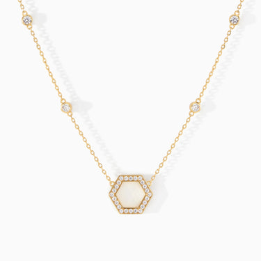 For maximum elegance and maximum glamour find your way into The Natalie Necklace. At its center you'll discover the brilliance of a focal hexagon pendant, its presence magnified and celebrated by the addition of four evenly spaced, brilliant bezel-set floating CZ stones, which gracefully dance along its delicate chain.