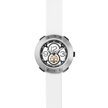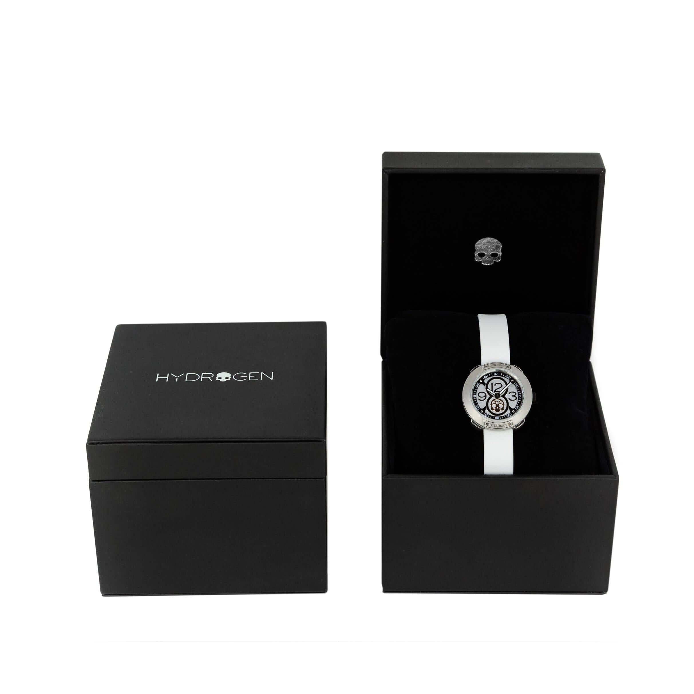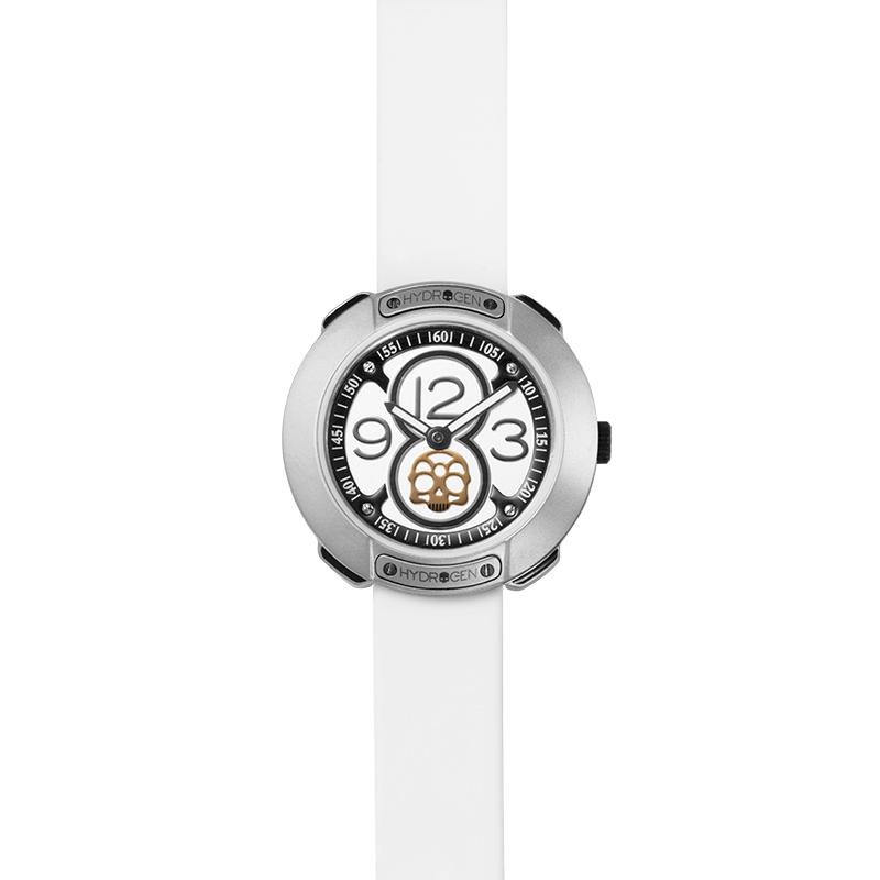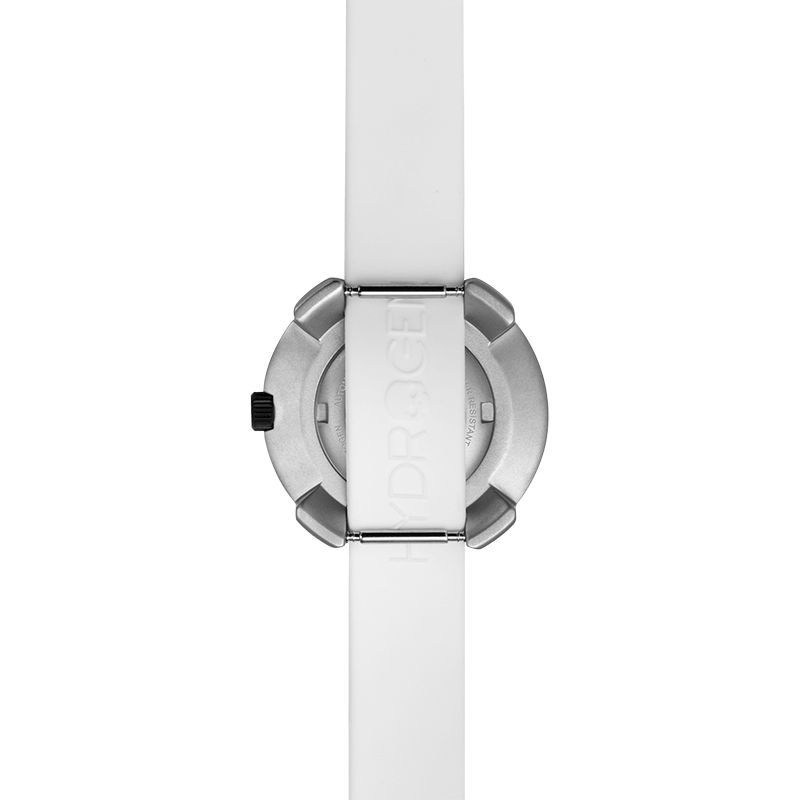A refined timepiece designed in a petite size of 29mm combined with high-performance materials of stainless steel and silicone. This Vista model from Hydrogen Watch features a white silicone strap in a single piece pull through construction and edgy silver dial design and arabic numerals.