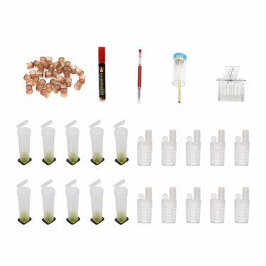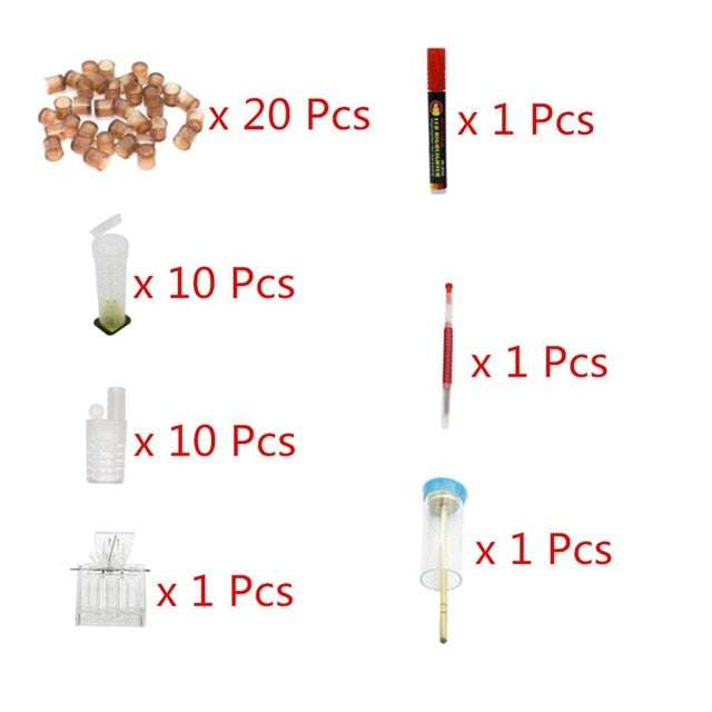 In this combo, you are getting all of these tools. Whether you want to rear queens or mark the previous ones, this combo has you covered. This combo has a queen marker, a grafting tool, twenty rearing cups, ten queen rearing cages, ten travelling cages, a queen catcher, and a marking bottle. All of these tools come with this set.