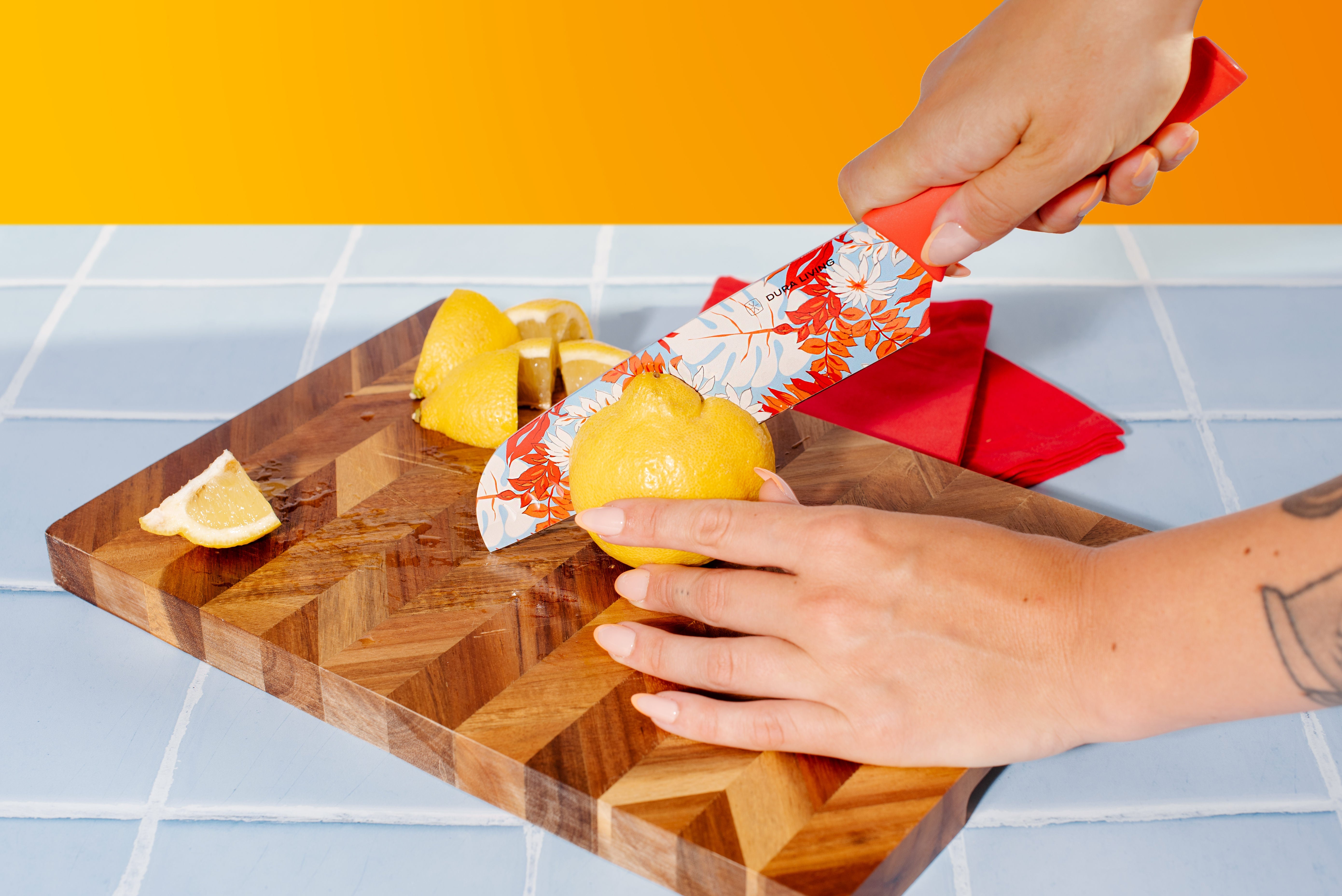 7 inch High Carbon Stainless Steel Santoku Knife: An all-purpose knife that features a uniquely rounded shape and small indentations that allows you to finely slice any ingredient and easily slide it off the blade.