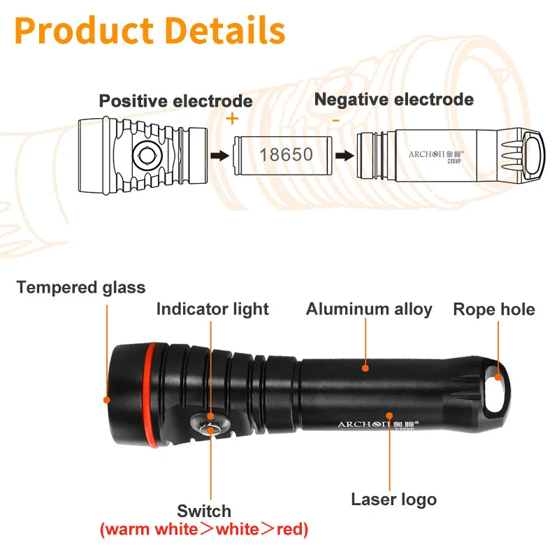 Constructed from durable materials, the ARCHON C15VP is built to withstand the harsh conditions of underwater environments. The body of the flashlight is made from high-quality aluminum, treated with premium anodizing to resist corrosion and physical wear. This robust construction ensures that the light remains functional and aesthetically pleasing even after extended use in saltwater. The lens is made from toughened glass, adding further durability and ensuring clear light transmission.