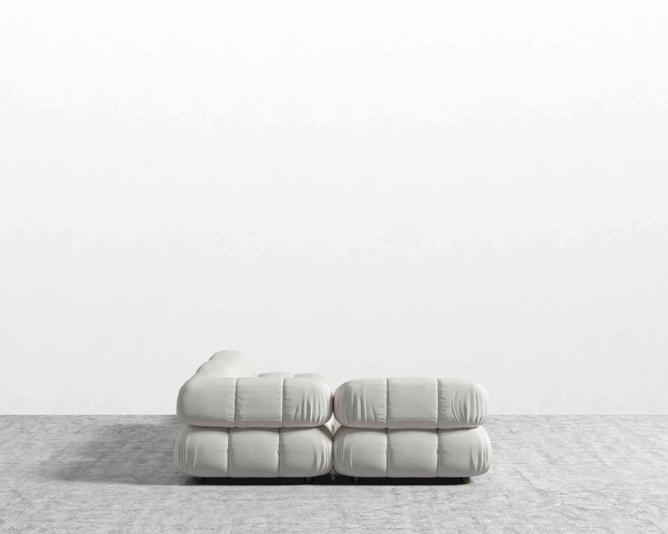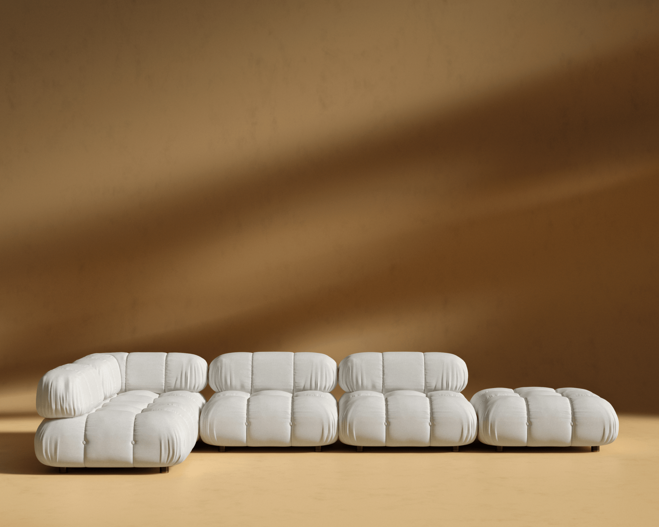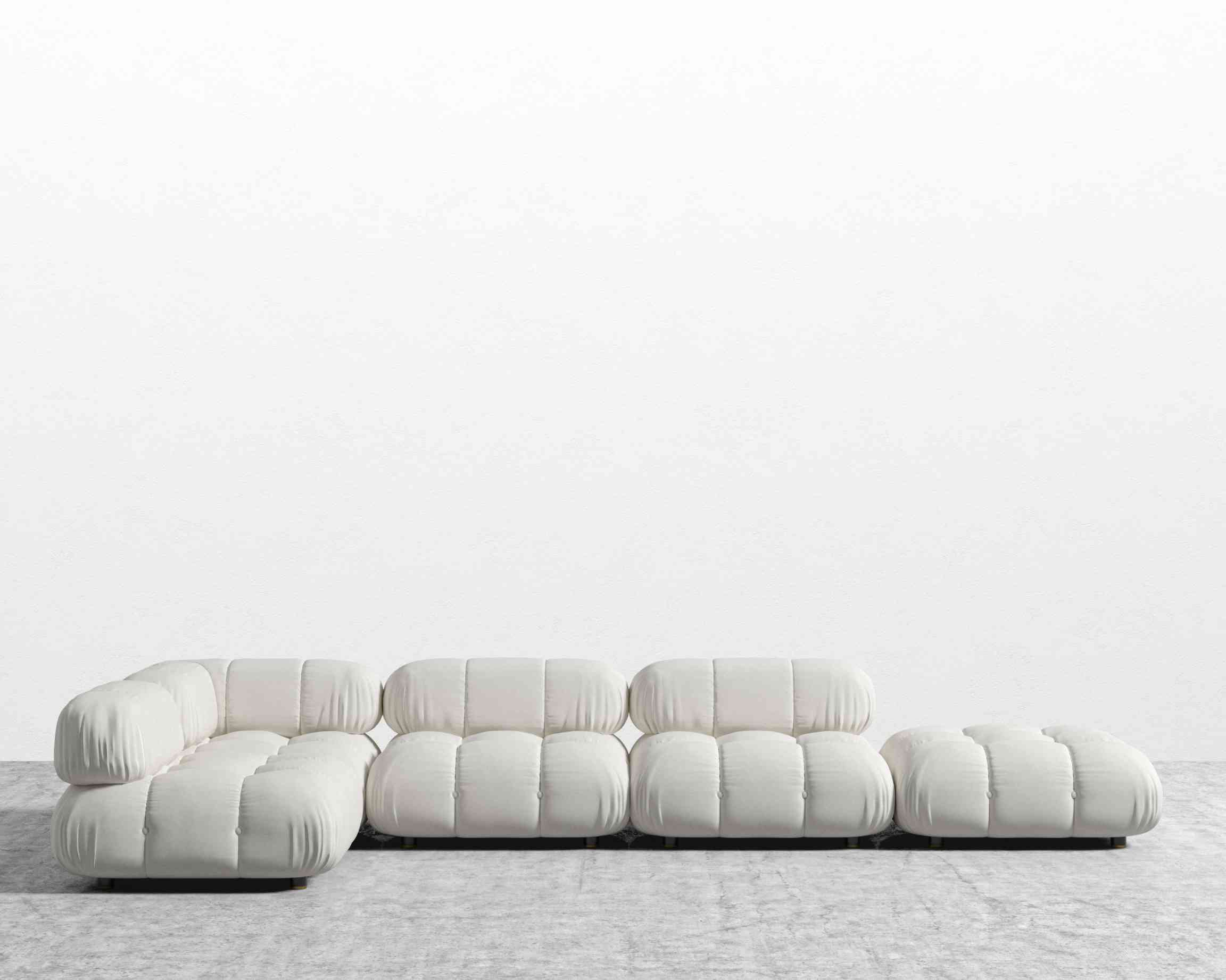 Step into refined elegance with the Belia Modular Sectional, a luxurious Italian-inspired design originally created in the 1970s. This premium sectional, crafted with sumptuously tufted cushioning and unique marshmallow-like curves, combines sophistication with modern comfort. Its kiln-dried hardwood frame, reinforced with dowelled joints, offers enduring durability. With a contemporary low profile, round cylinder legs, and brass trimming, the Belia adds a captivating presence to any space. This preset configuration includes three armless pieces, one corner piece, and an ottoman, but can be customized by purchasing additional pieces separately. Optional accident protection plans are available for added peace of mind.