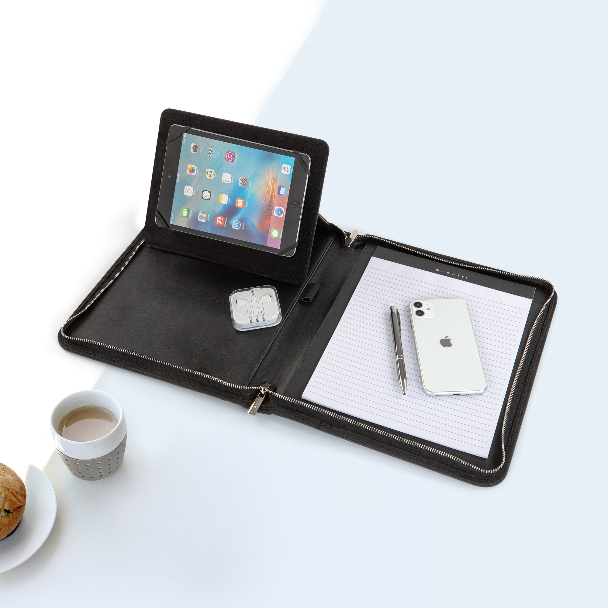 Discover our stylish vegan leather tech writing case featuring a quick access front pocket, zip-around closure, tablet holder, pen loop, and an included letter-sized notepad—perfect for staying organized on the go!