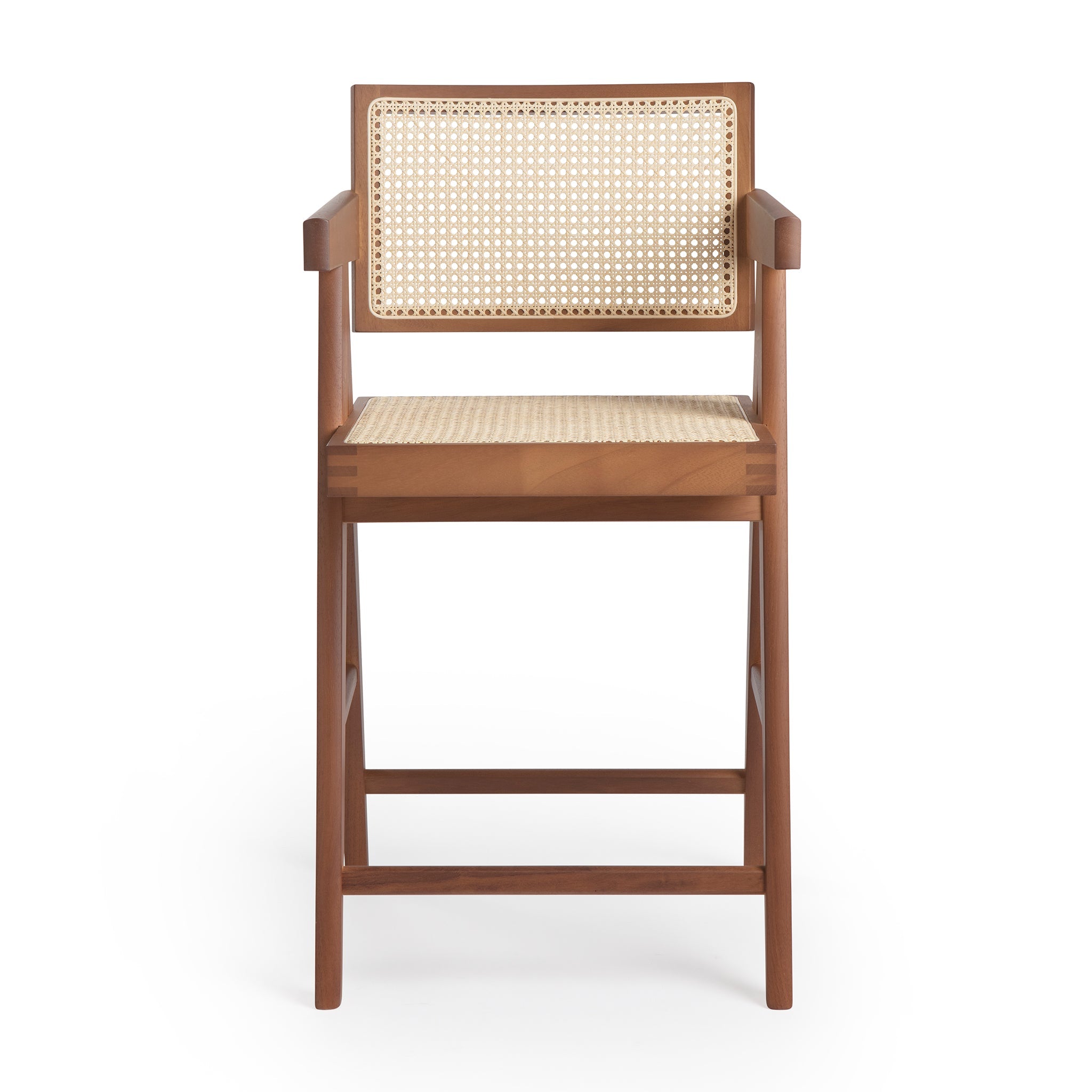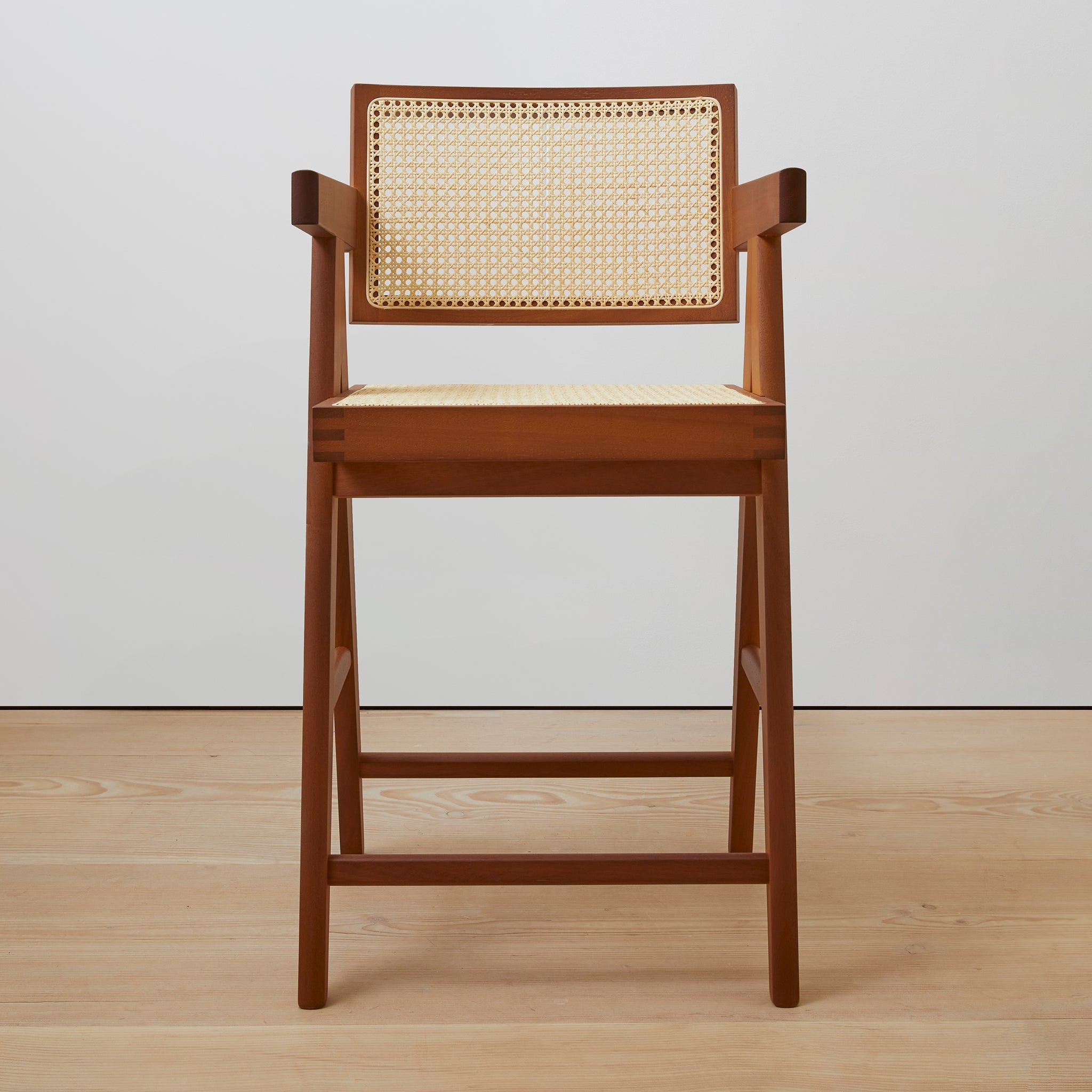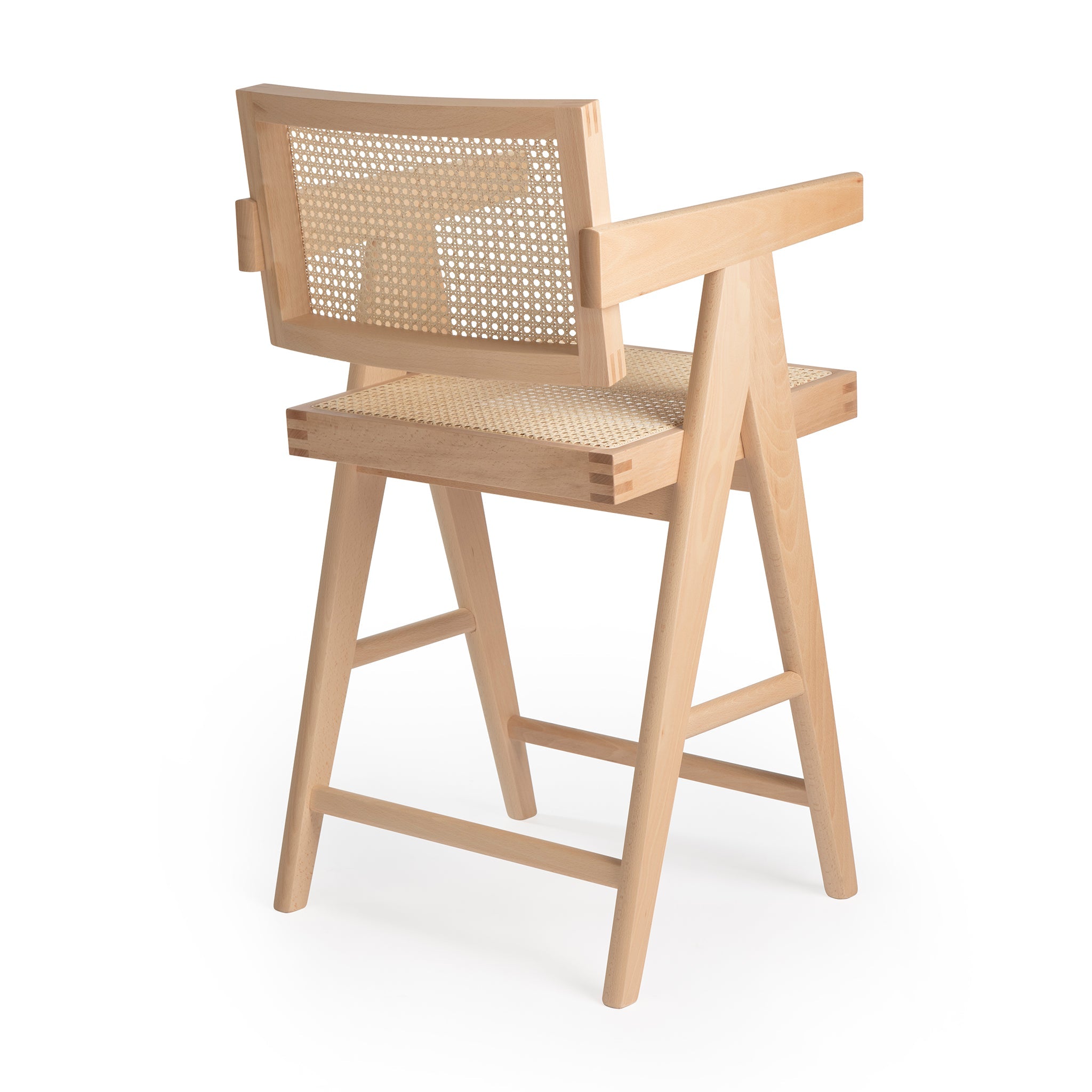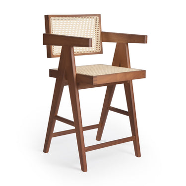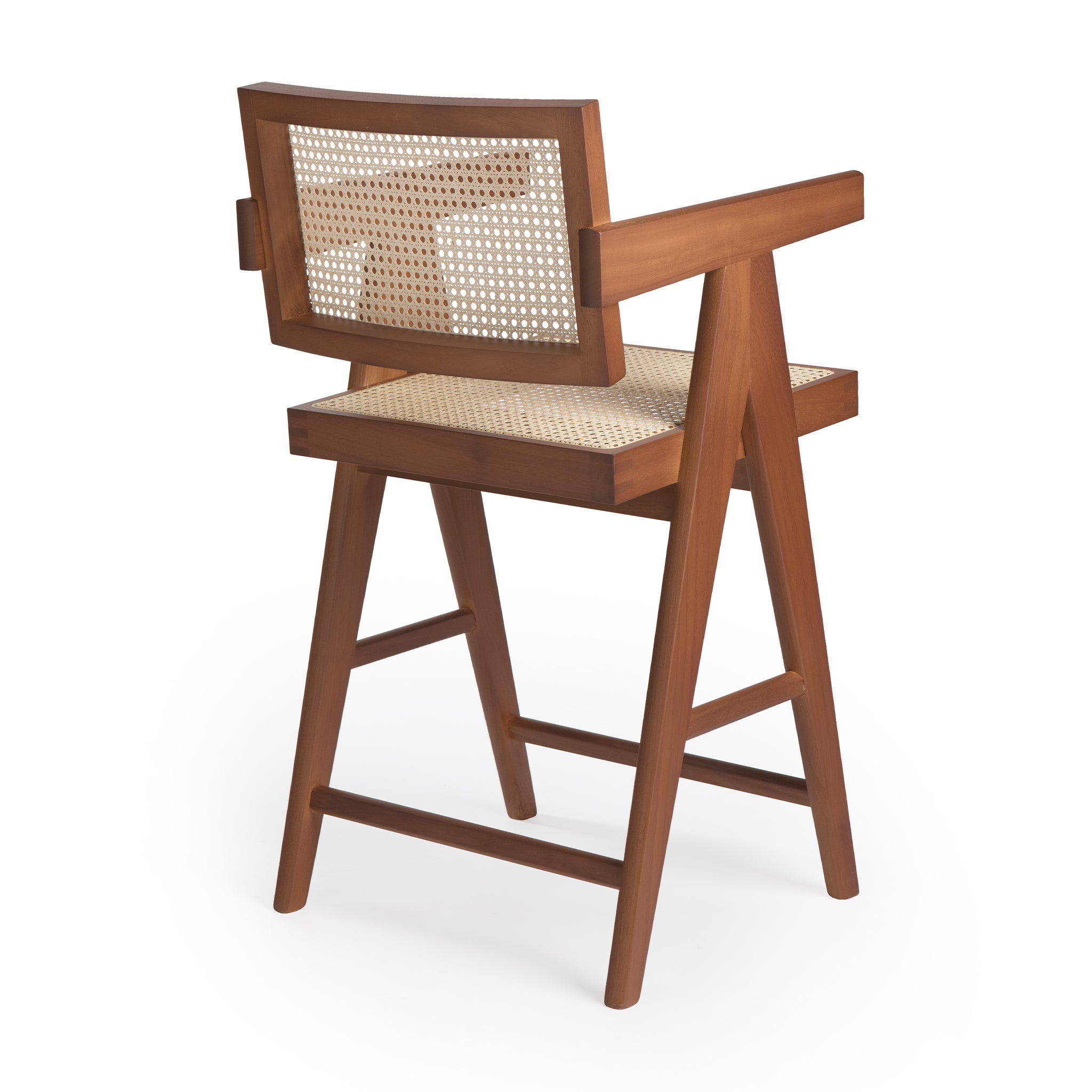 Counter-height armed stool with diamond weave Viennese cane seat and back, available in teak, black, or natural.