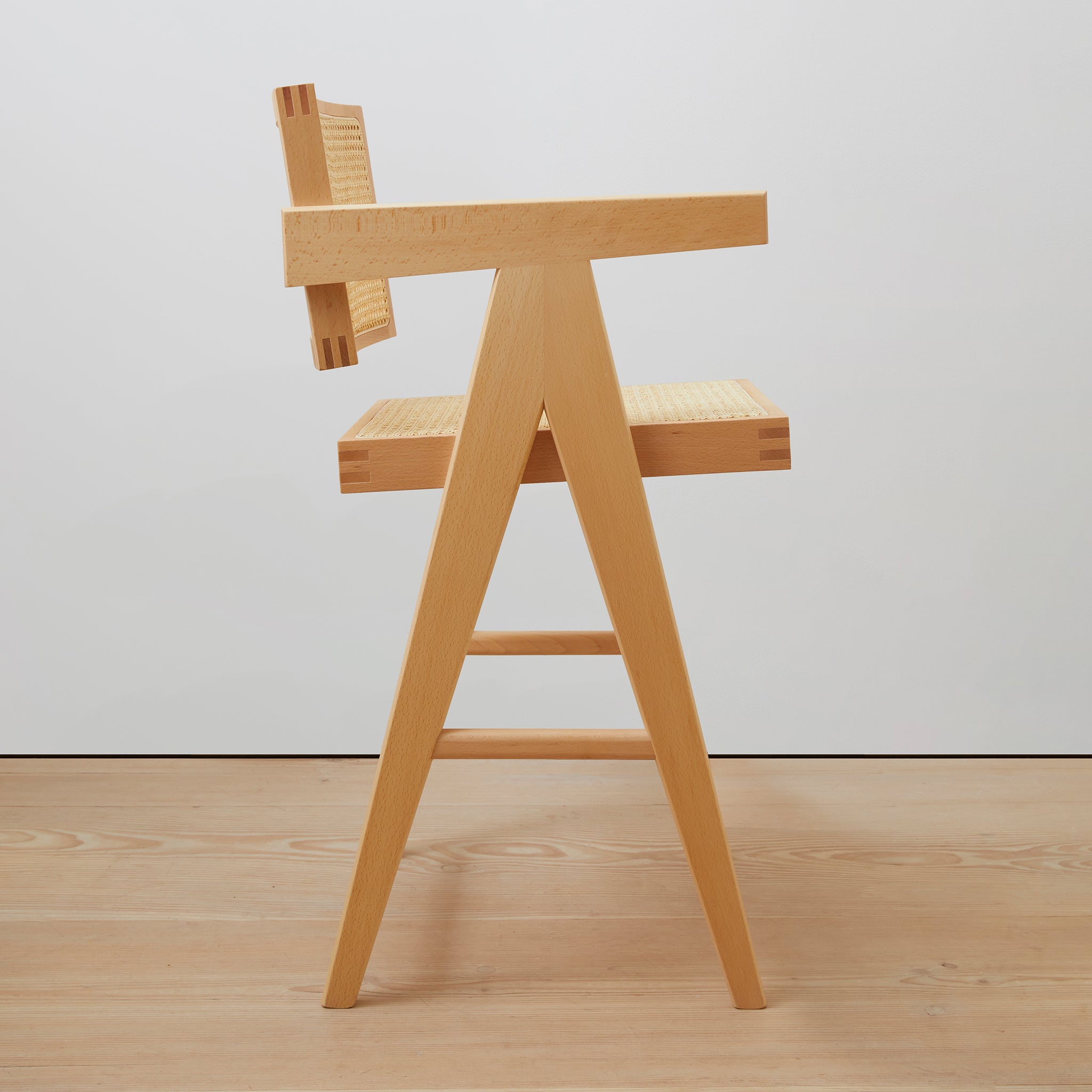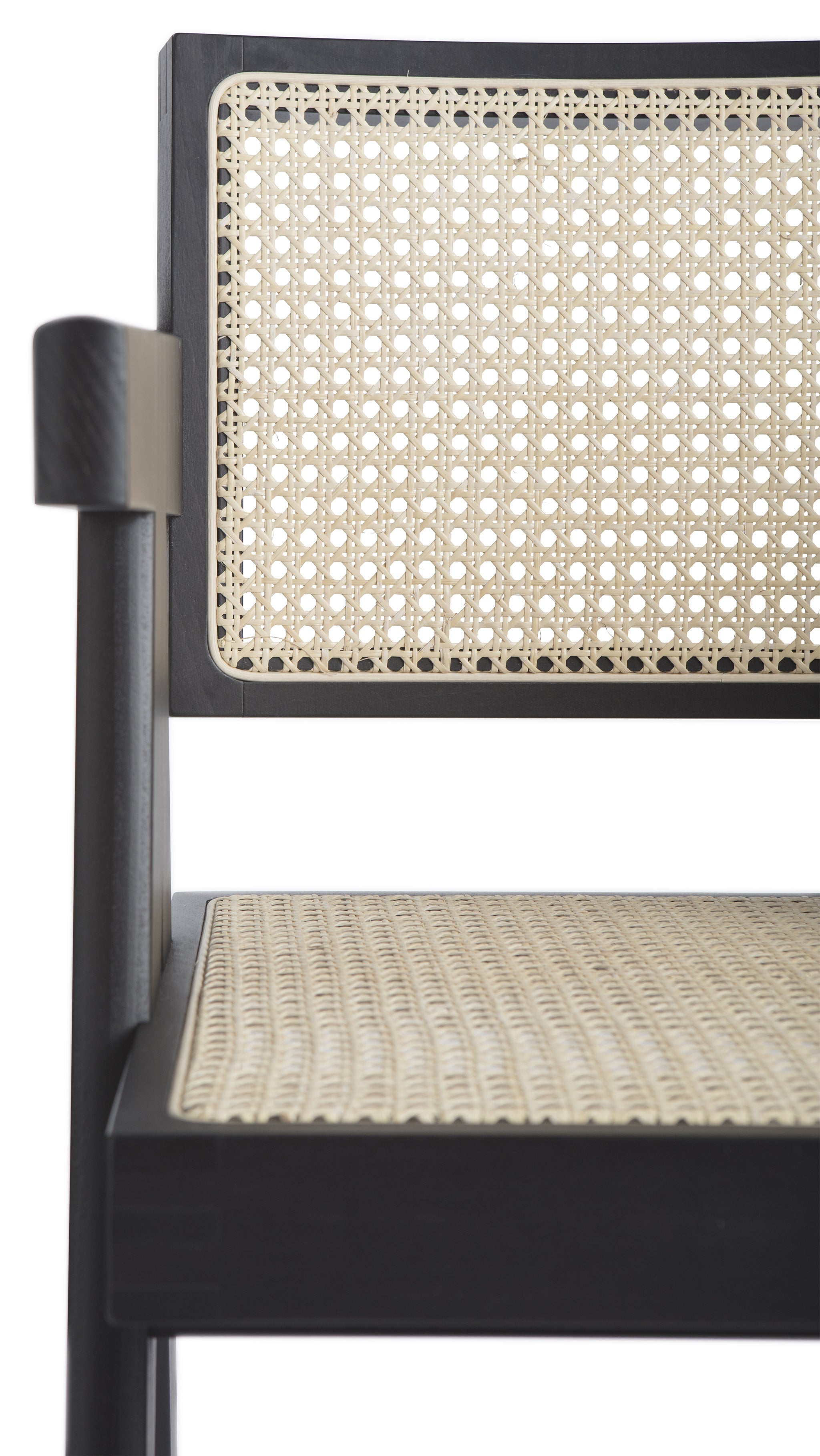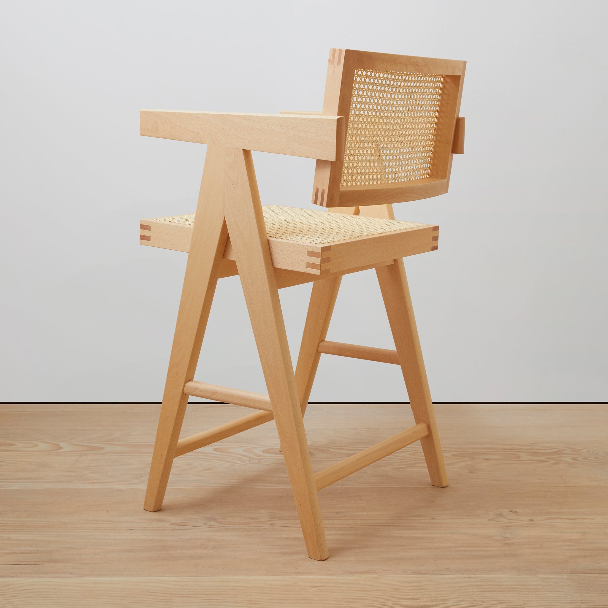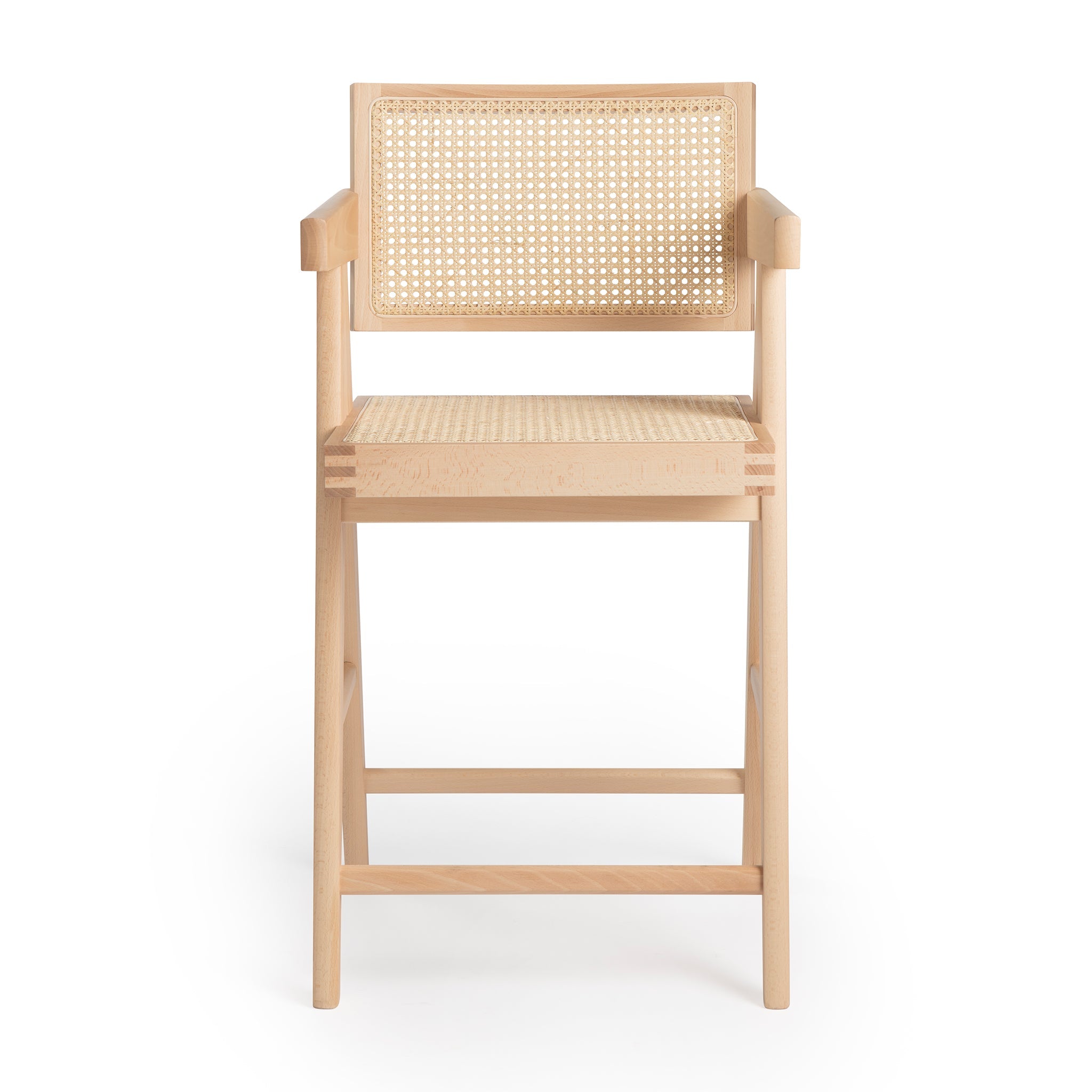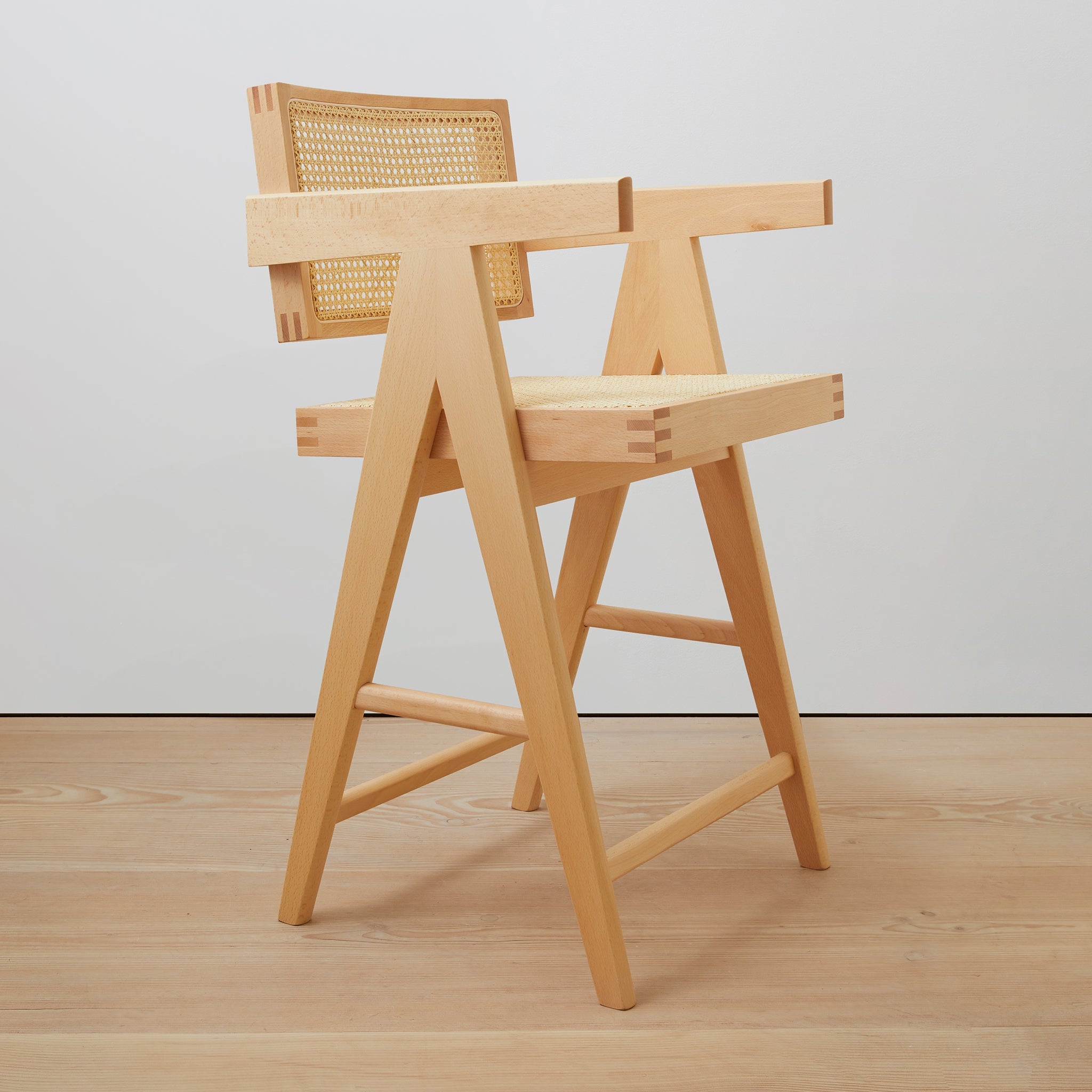 Counter-height armed stool with diamond weave Viennese cane seat and back, available in teak, black, or natural.