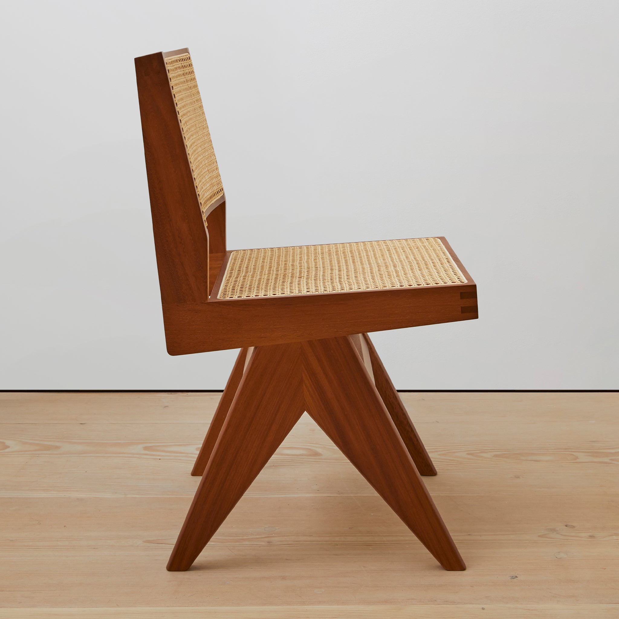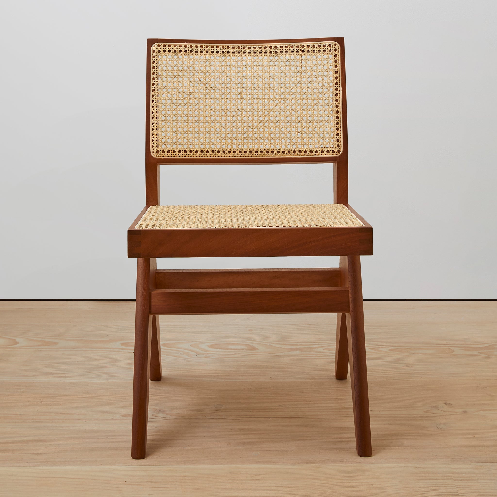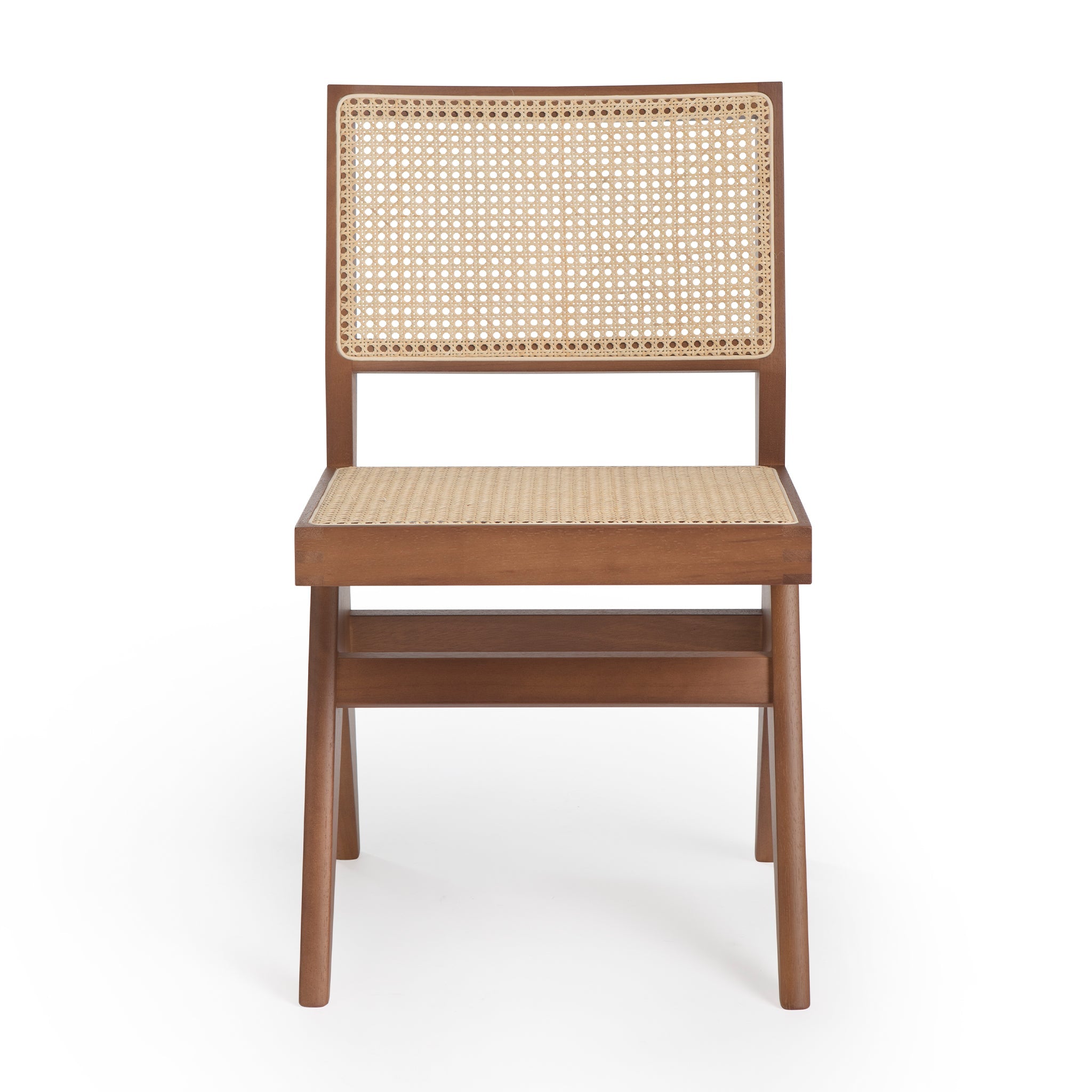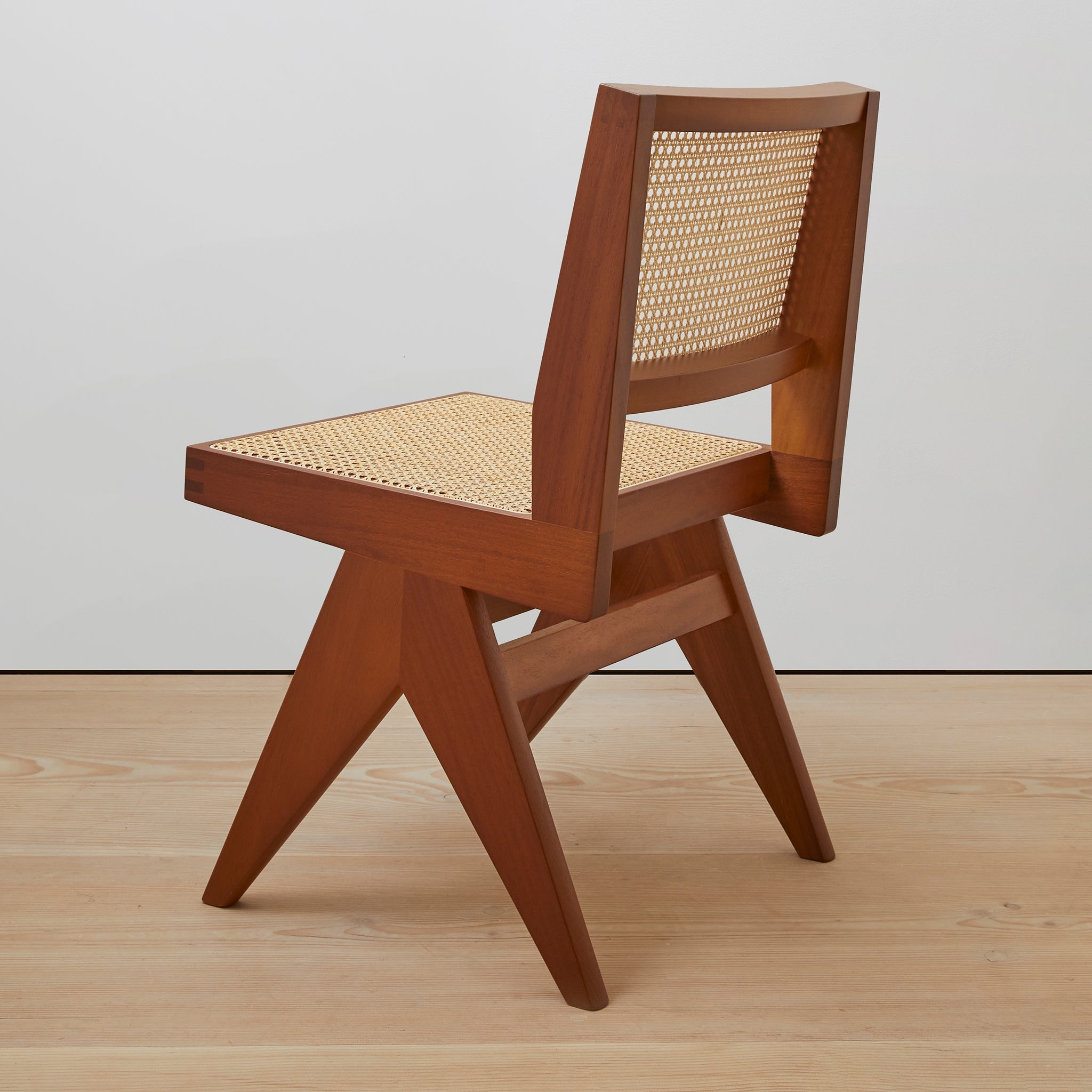 Set of (2) armless chairs with diamond weave Viennese cane seat and back. Offered in teak, black, or natural.