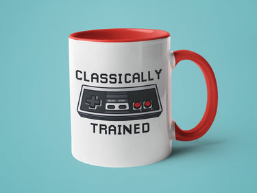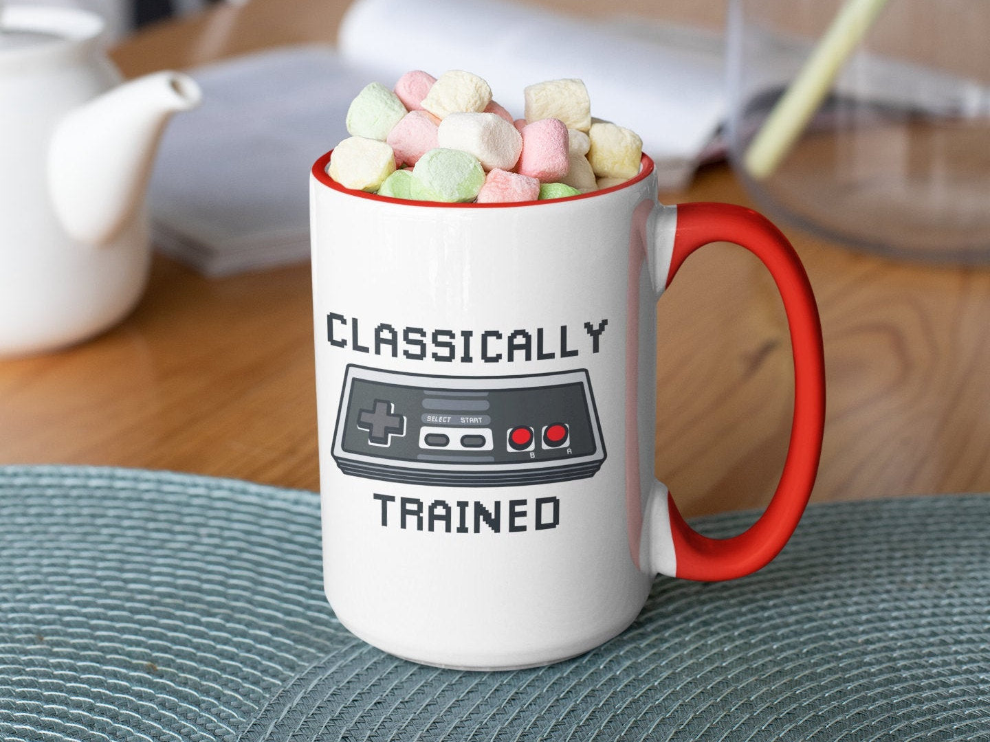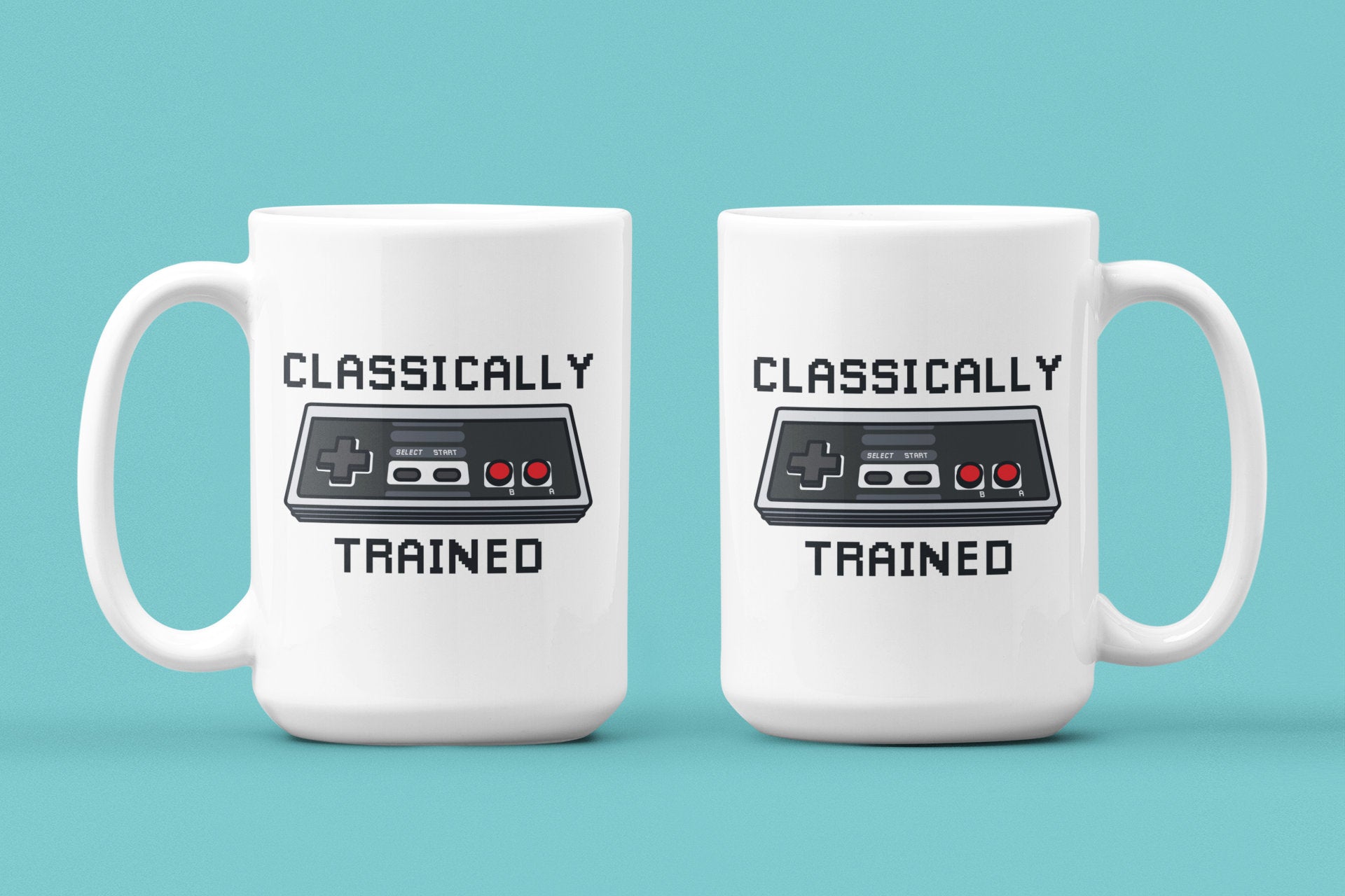 Funny coffee mug with the phrase 'Classically Trained' and an image of a video game controller. Makes a great birthday, Christmas, or Father's Day gift!