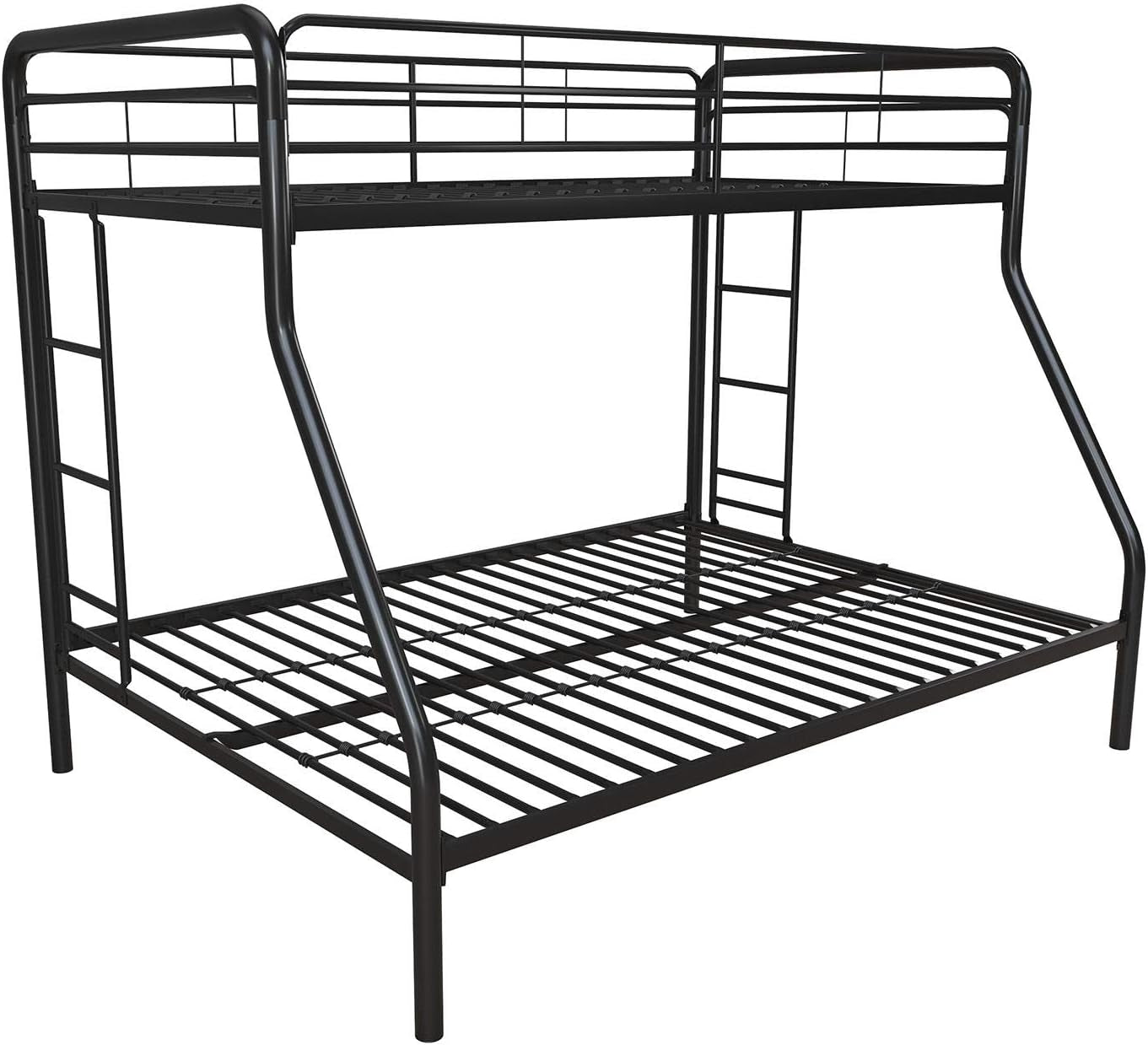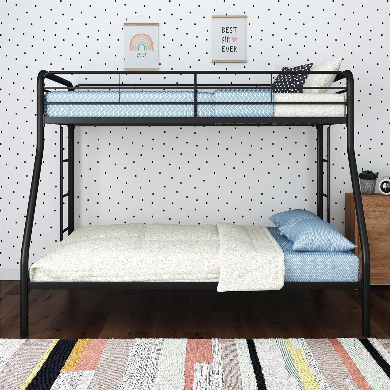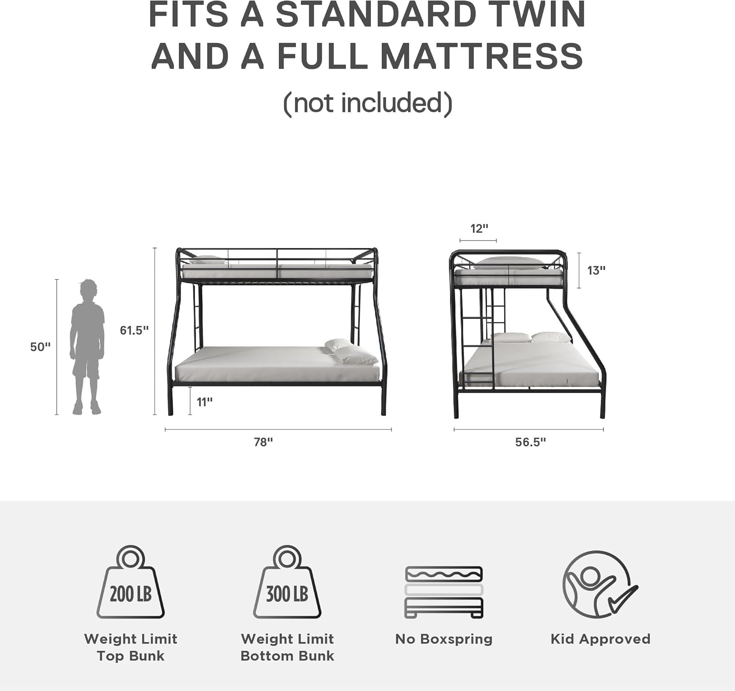 Dusty Metal Bunk Bed Frame for Kids, Teens, and Adults, with Angled Ladder, High Full Length Guardrail, Smooth Rounded Edges, No Boxspring Required, for Small Spaces, Twin-Over-Full, Black