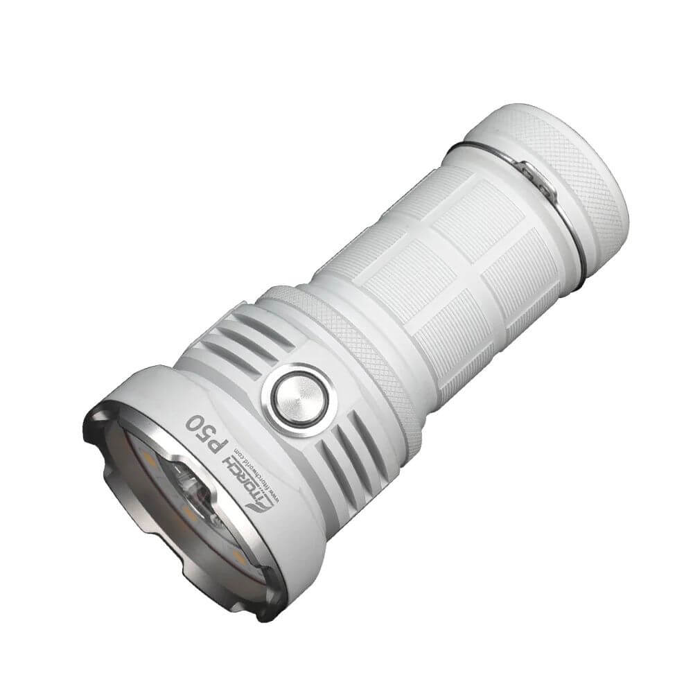 Fitorch P50 is a powerful rechargeable searchlight. It utilizes 3* high quality main LEDs and 16pcs colorful LEDs to provide cool white light, colorful lights and warm white light. The max output of P50 can reach 10,000 lumens, and the max beam distance can reach 450m. It is charged by a USB-C charging port and powered by 1*36250-6500mAh rechargeable battery. It is really a strong and protable searchlight.