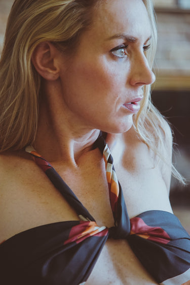 Wear the Geo silk scarf as a bandeau, as an ascot, as a headband or just as a scarf, it is a beautiful addition to your retro look.
