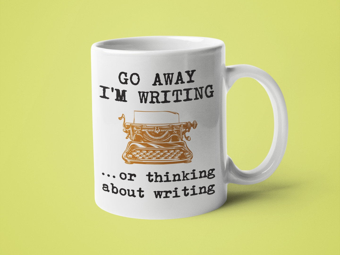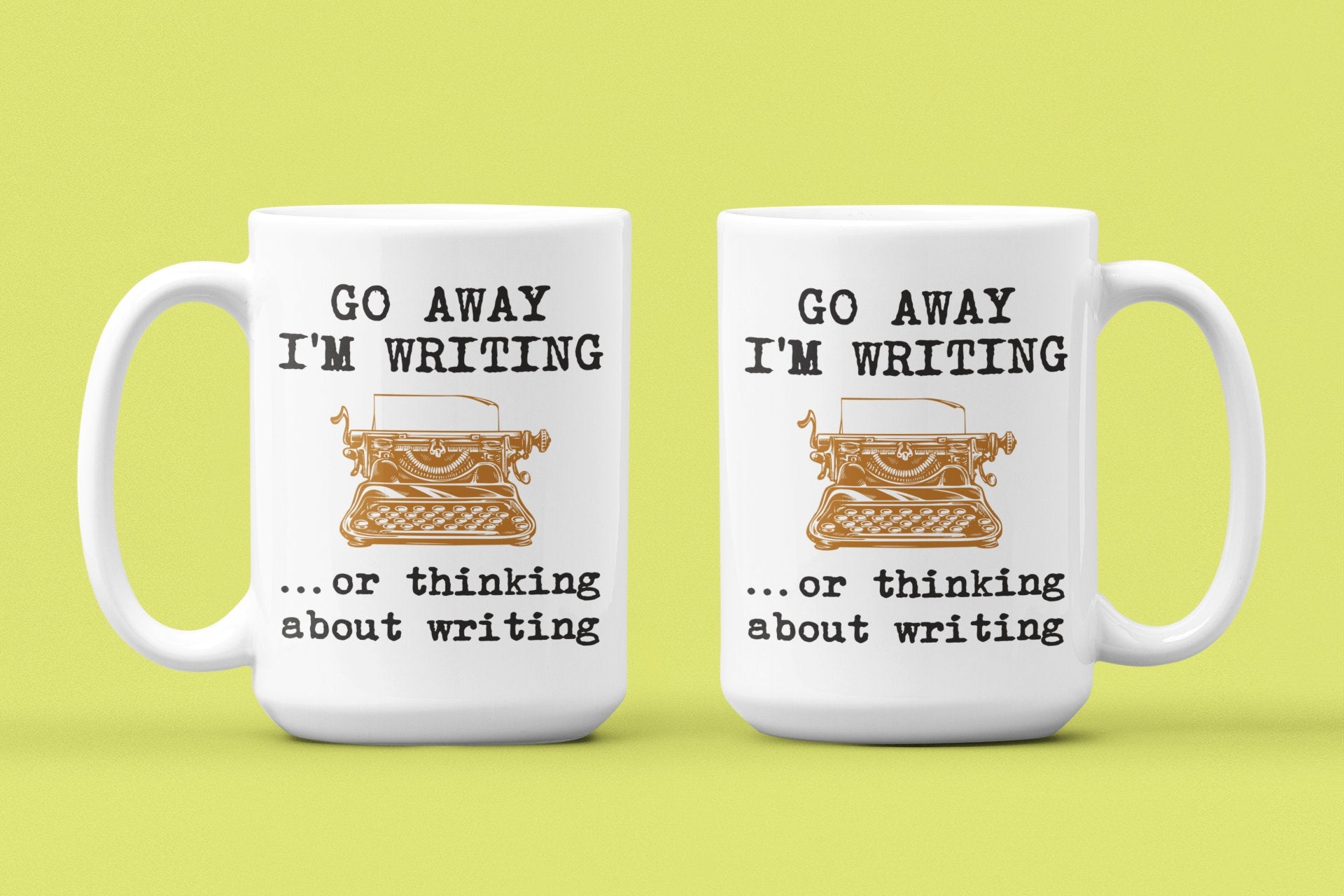 Funny mug with the phrase 'Go Away I'm Writing or Thinking About Writing'. Makes a great gift for writers!