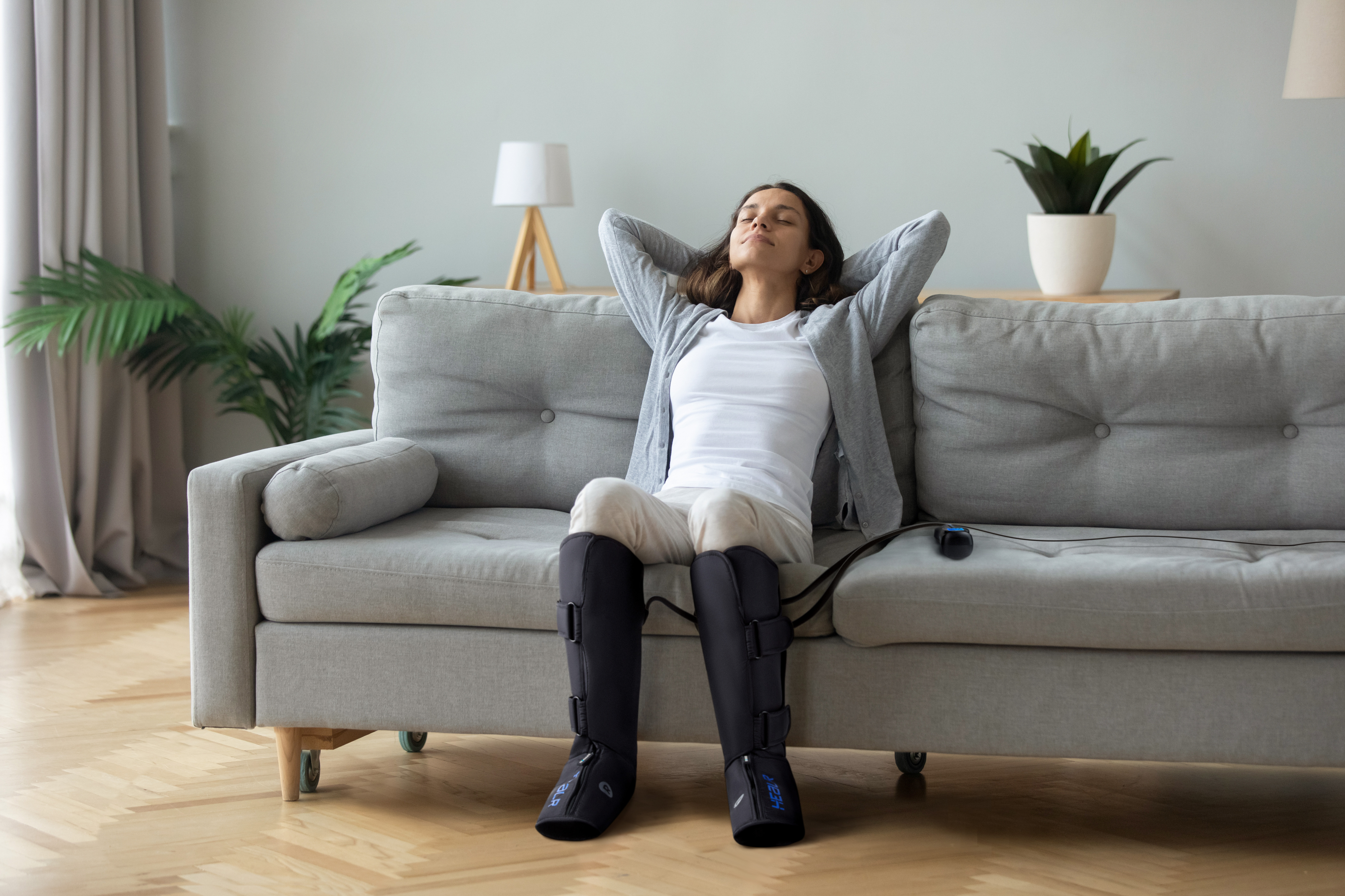 These are massage boots — calf and foot massagers offering triple therapeutic action: air compression, heat, and cold (special precooled pads go into the internal pockets).