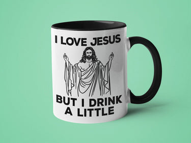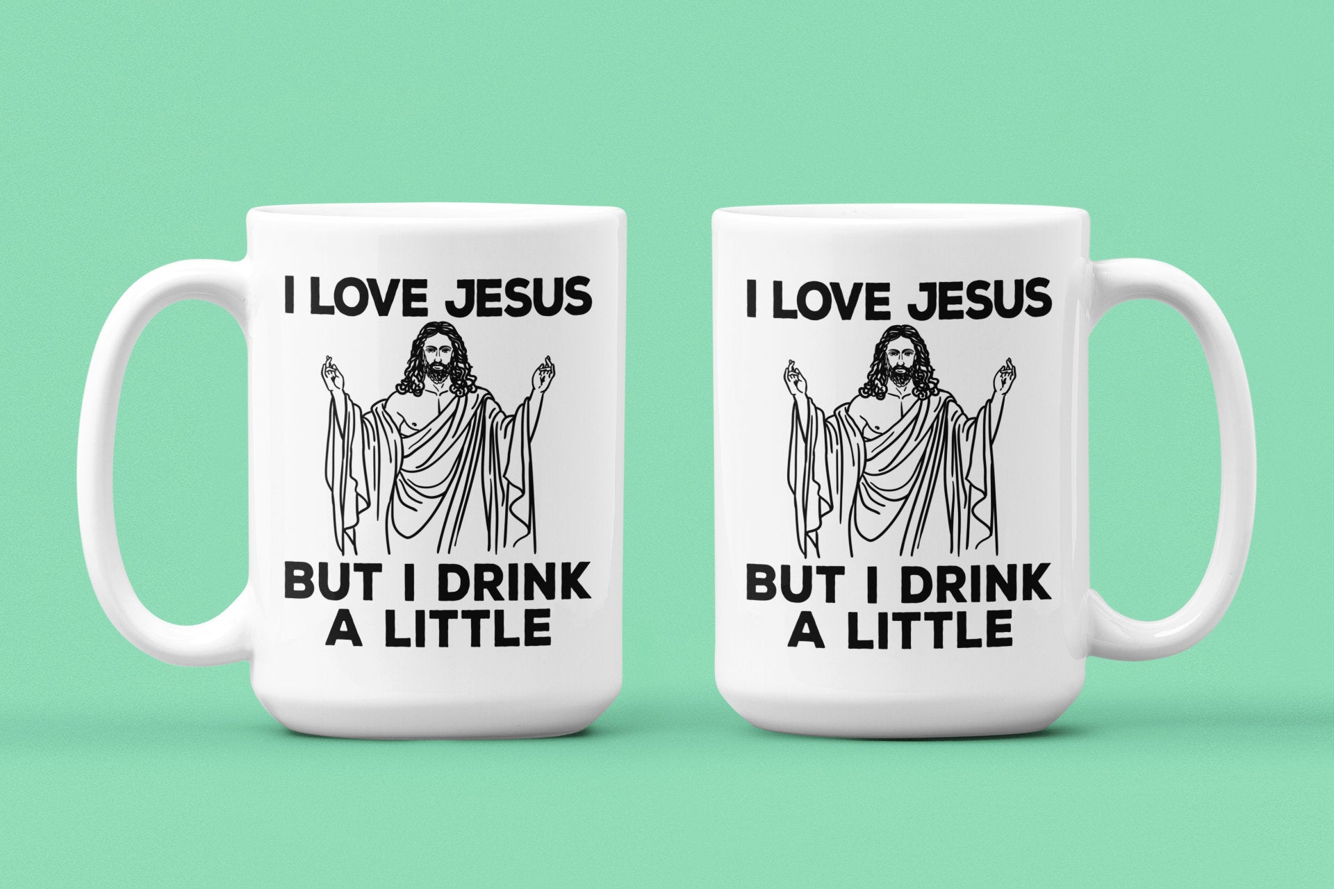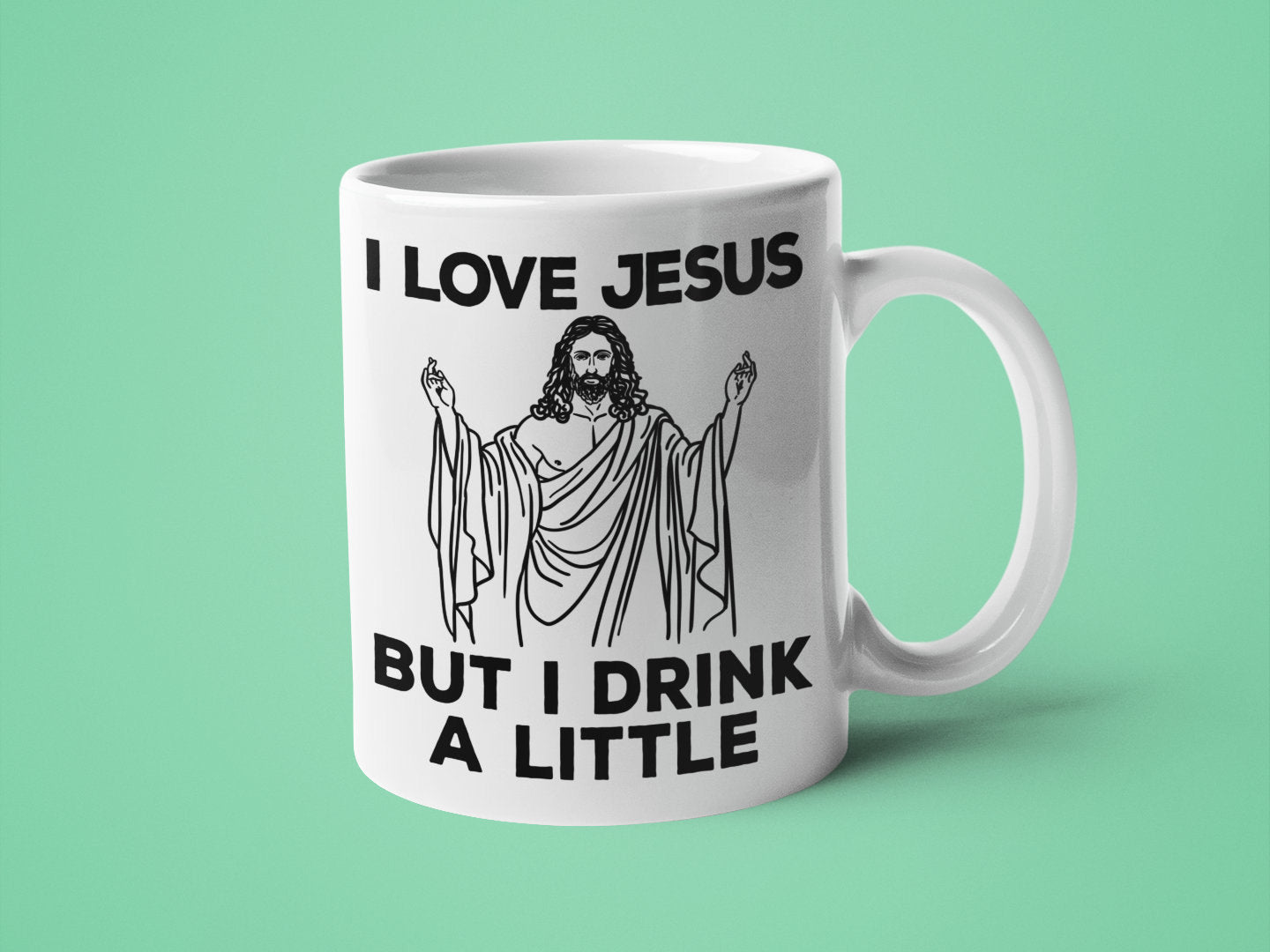 Funny coffee mug with the phrase 'I Love Jesus but I Drink a Little' and an image of Jesus. Makes a great birthday or Christmas gift!