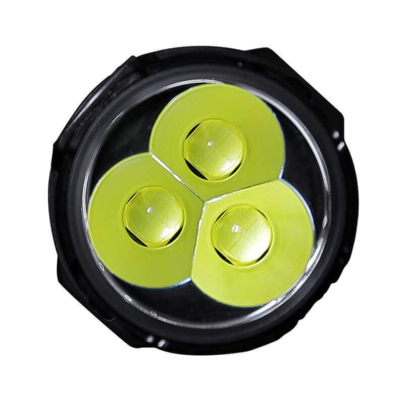 The optical part consists of three XHP70.2 and each of them is located inside a small aluminum reflector. The beam is quite focused and can illuminate up to 324 meters.