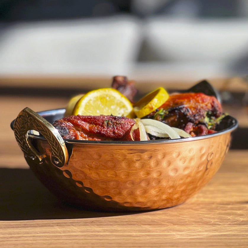 This double-walled, stainless steel bowl with hammered copper finish provides a stunning presentation for your culinary creations. Made by metal artisans in Moradabad, India, this bowl combines functionality with a touch of cultural sophistication.