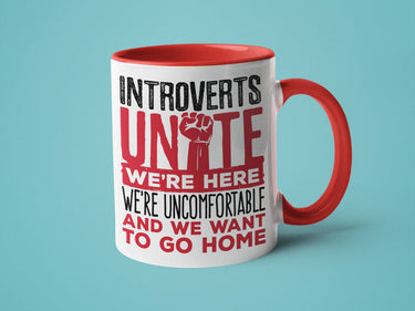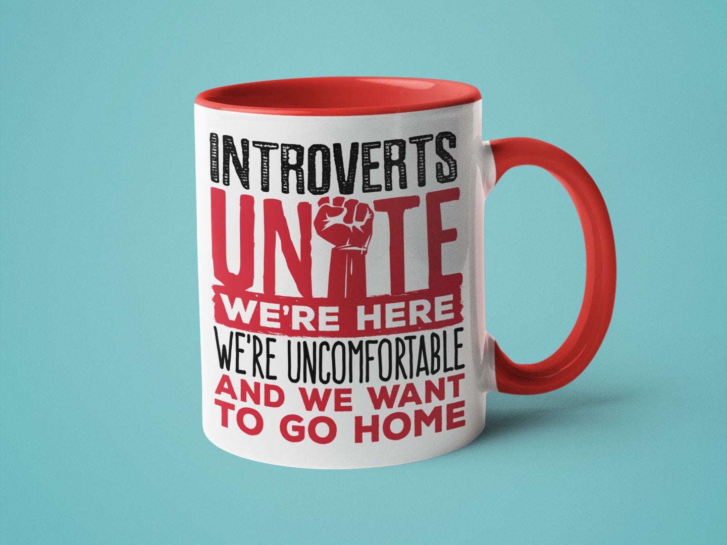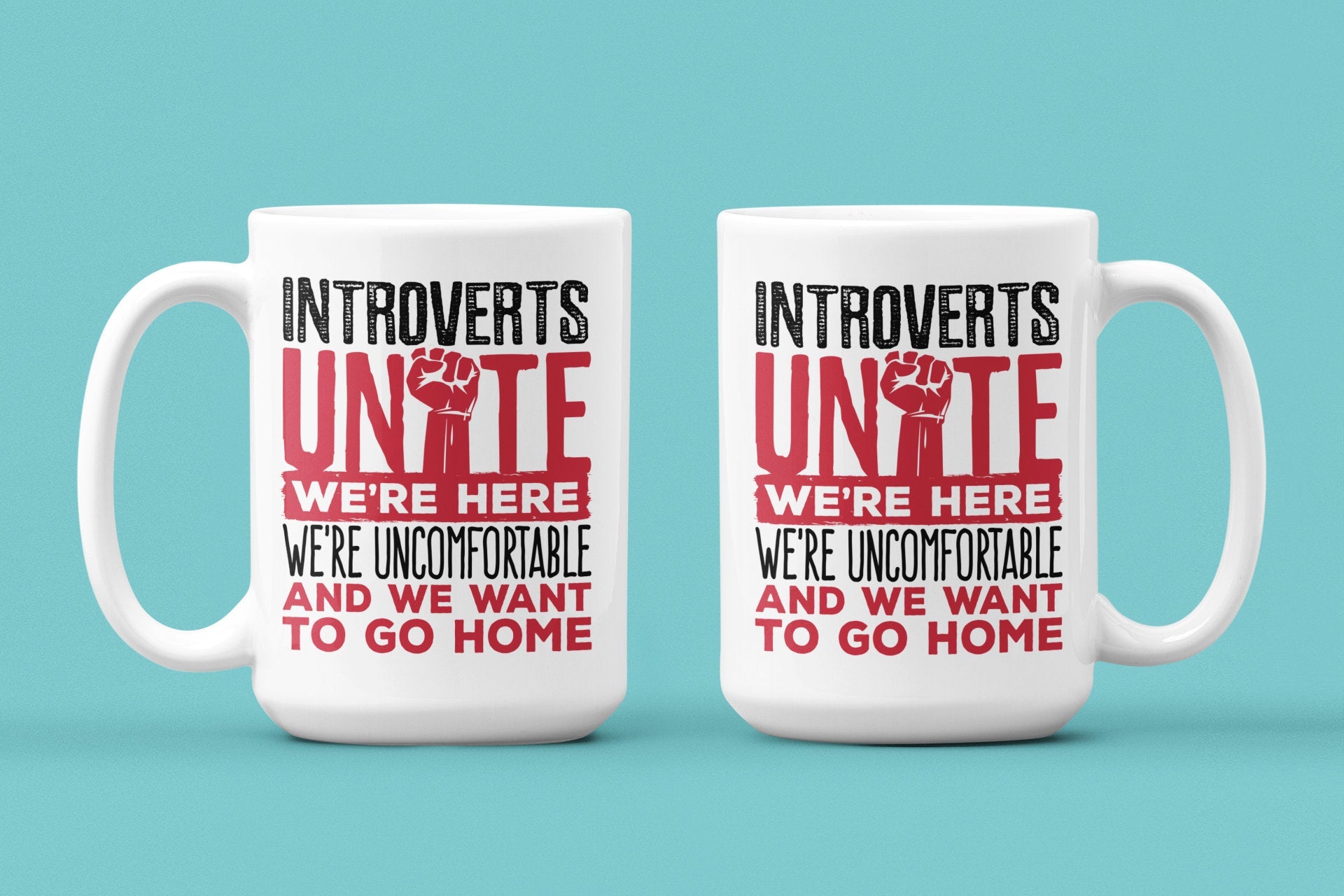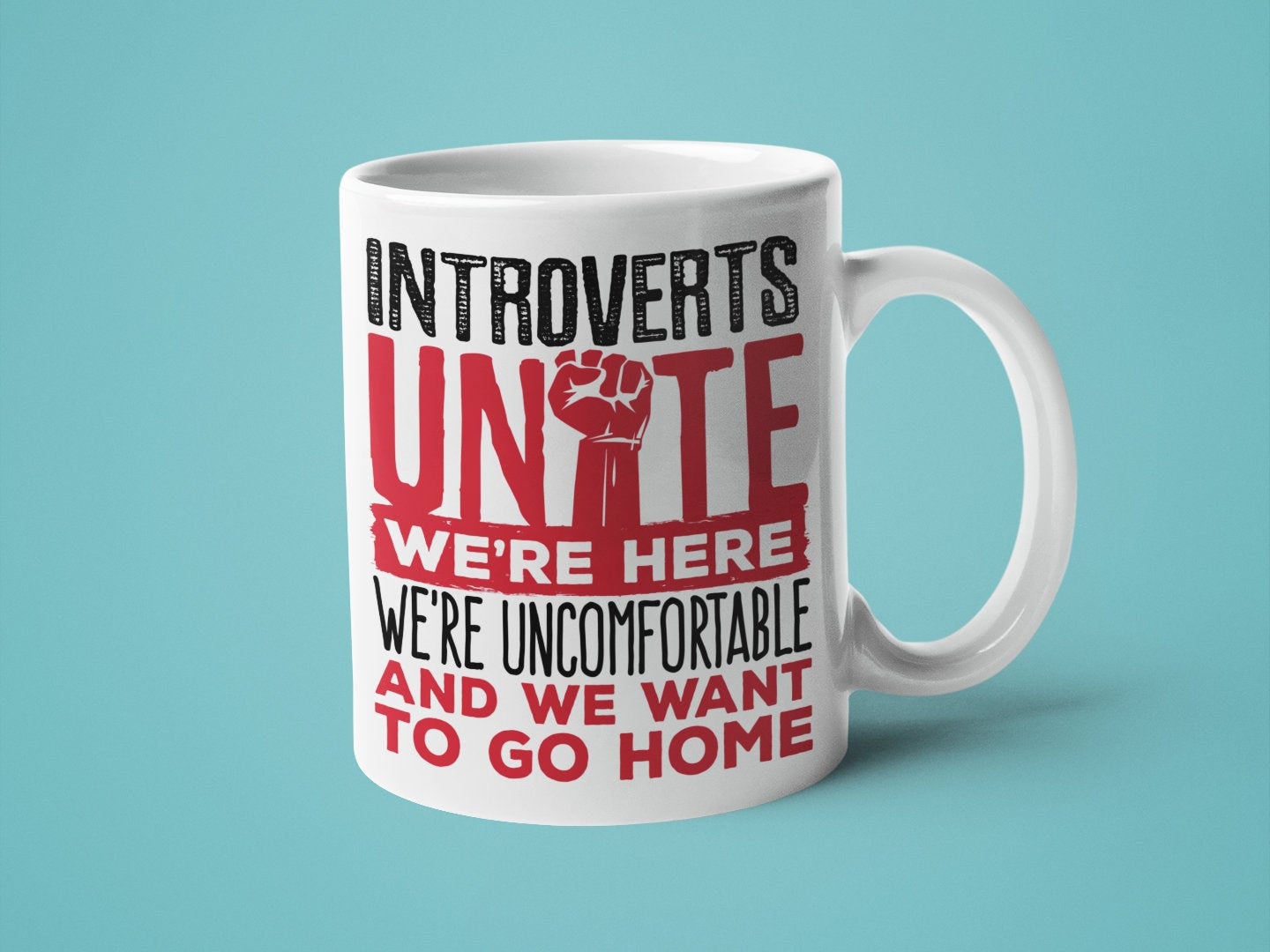 This funny introvert mug features the phrase 'Introverts Unite. We're here, we're uncomfortable, and we want to go home'. Makes a great birthday or Christmas gift!