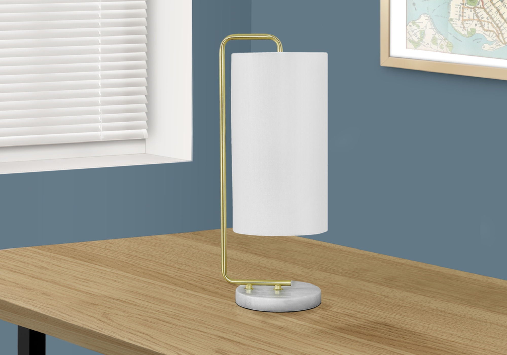 • Contemporary Design: This 20" table lamp combines a sleek gold metal arm with a white marble base and a cylinder ivory fabric shade, offering a classic yet modern aesthetic suitable for any living room, office, or bedroom.