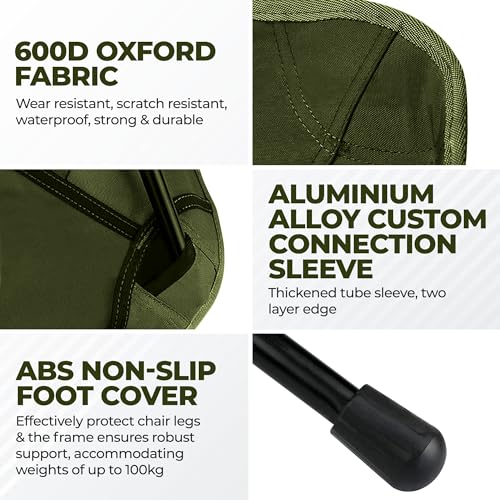 - Durable and Comfortable Design: This outdoor folding chair is built with high-quality aluminum and 600D Oxford fabric, ensuring it is both a heavy-duty and comfortable chair. Designed with a modern style, it’s available in Black, Khaki, and Army Green to suit any taste. The ergonomic design portable chair provides superior comfort, making it one of the best camping chairs for adults. Whether used as a lawn chair or a beach chair for adults, it offers exceptional support and durability.
