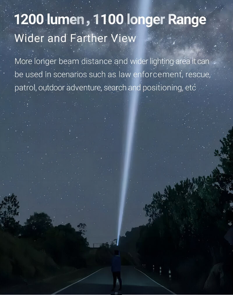 The Type C charging port that allows you to charge the battery inside the flashlight and hidden by the head. To discover the charging interface just unscrew the head slightly: In this way, the charging interface when not in use is always well protected from dust and splashes. The tail of the Nextorch P82 is flat so it is possible to use the torch in tailstanding as a candle. The beam of the Nextorch P82 is very directive and allows you to get very far, 1100 meters: ideal for Rescue for outdoor adventures or for search operations.